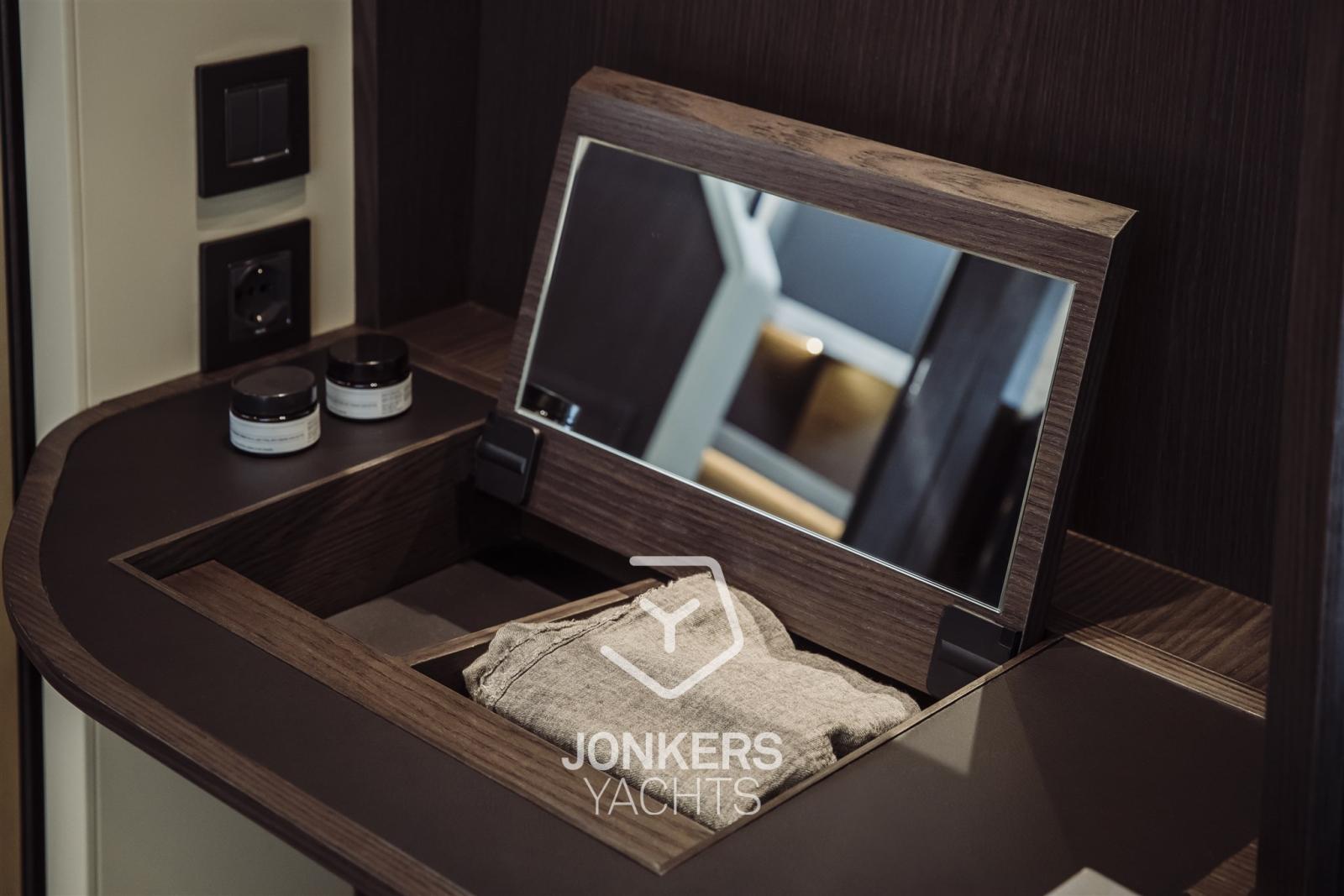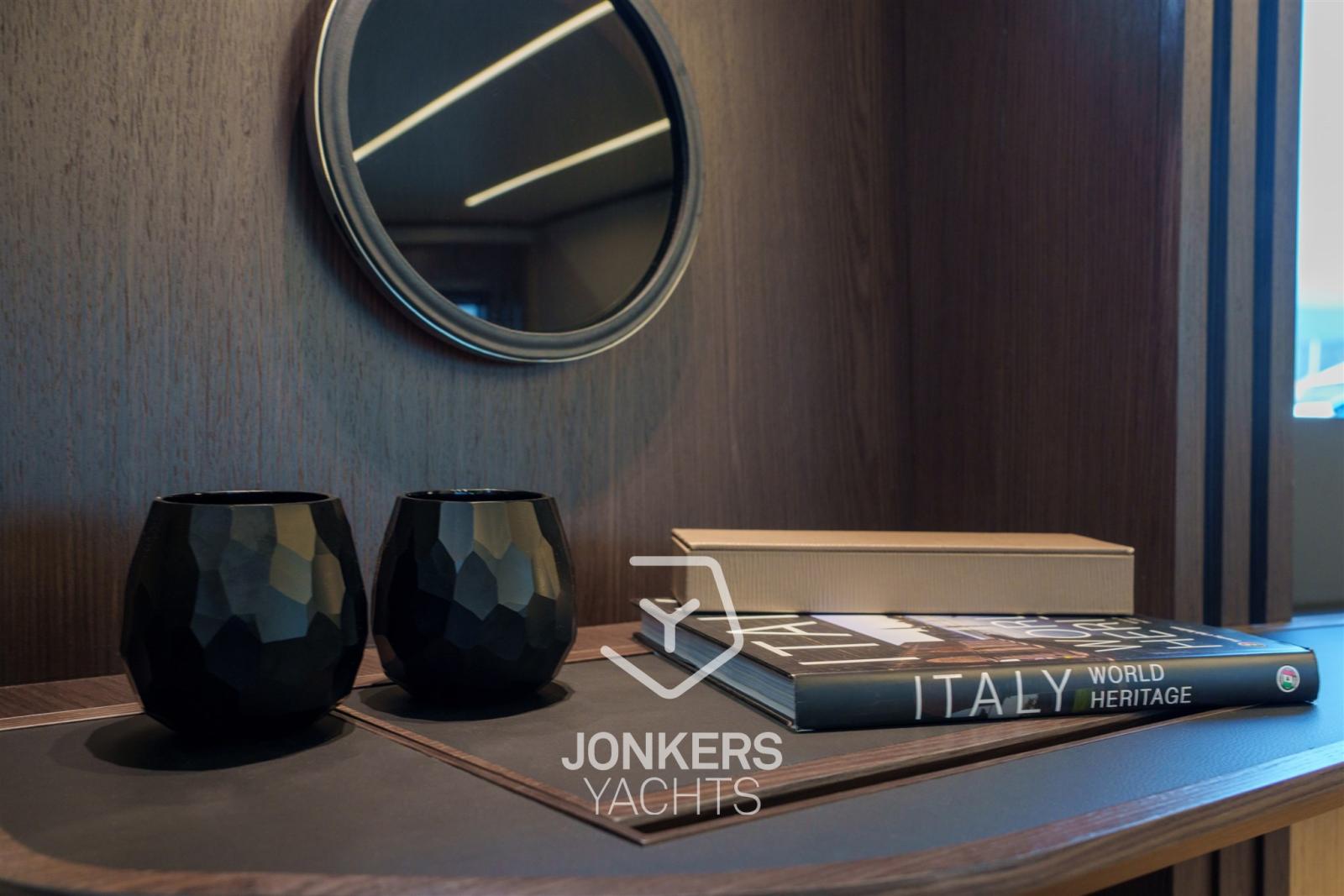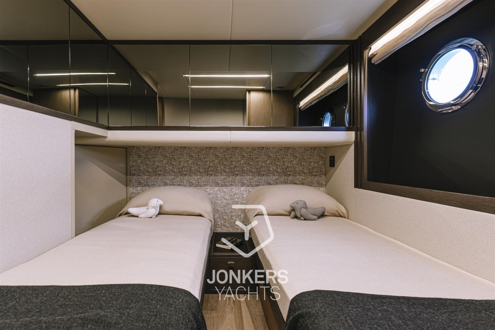 The VIP guest cabin midships could in every way be considered a second master, in terms of space, headroom, en-suite bathroom and finish. The third guest cabin has an electricalsystem, fitted as standard, for seamless transformation from twin berths to double. In addition, there is a versatile crew cabin, with practical access from the stern platform.
