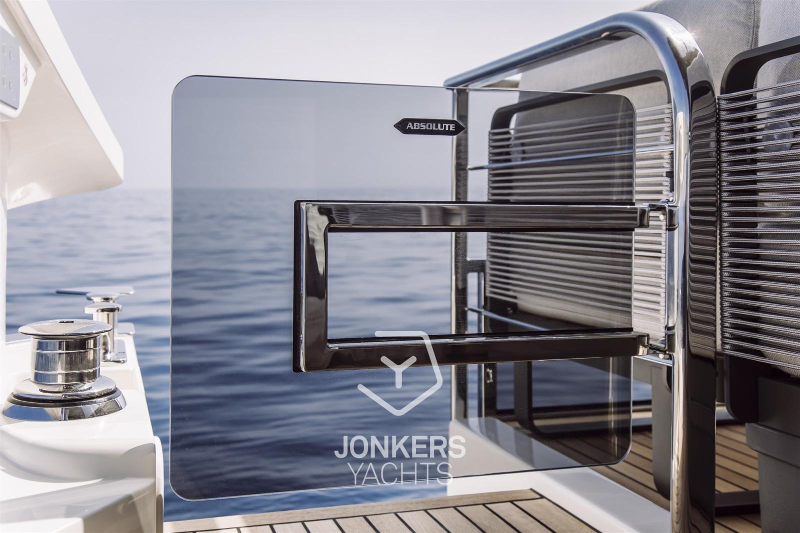 The use of extensive glazing, a familiar Absolute trademark, is particularly visible in the saloon, from where there are fantastic 360-degree views. In addition to air conditioning, natural ventilation can be provided by the electrically-controlled vertically sliding windows. The galley is fully equipped, and, unusually for boats of this size, there is also a spacious pantry.