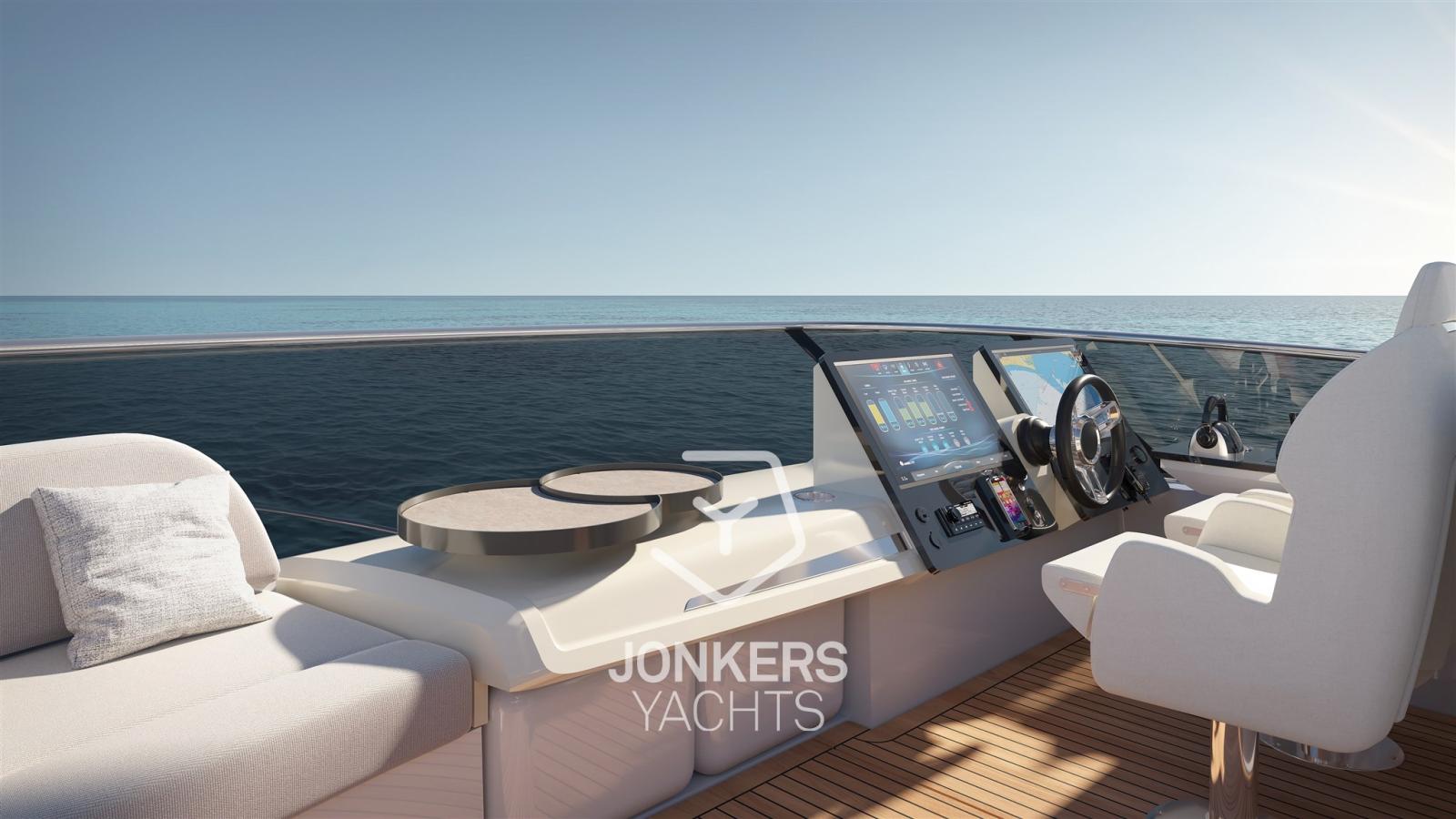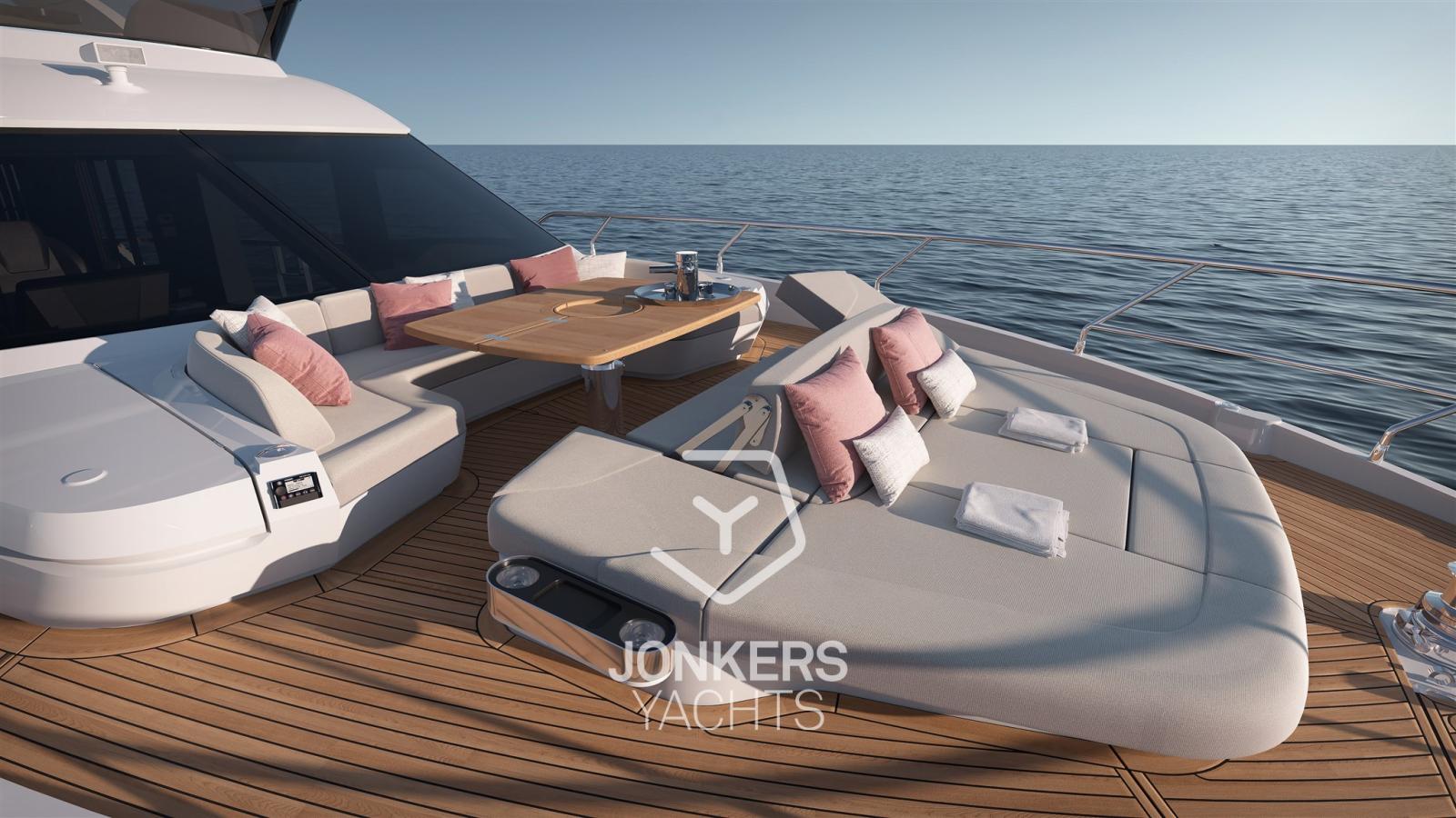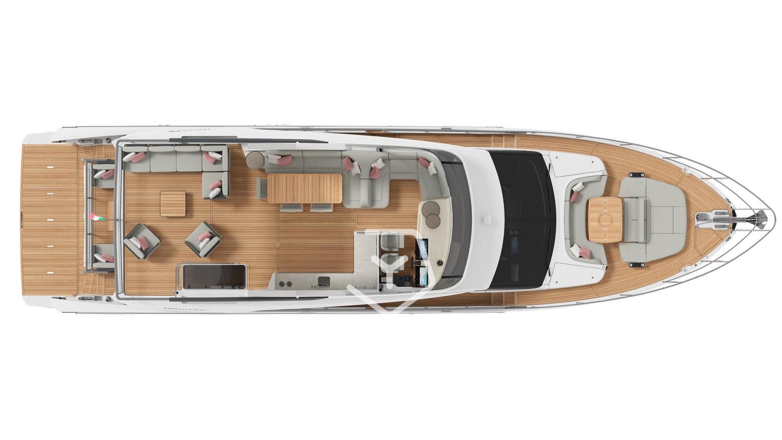The spacious and bright outdoor areas, designed for maximum comfort and refinement, include a versatile cockpit terrace with modular furnishings that allow for personalized space arrangements, and a convertible bow sundeck, ideal for moments of absolute freedom on the open sea.