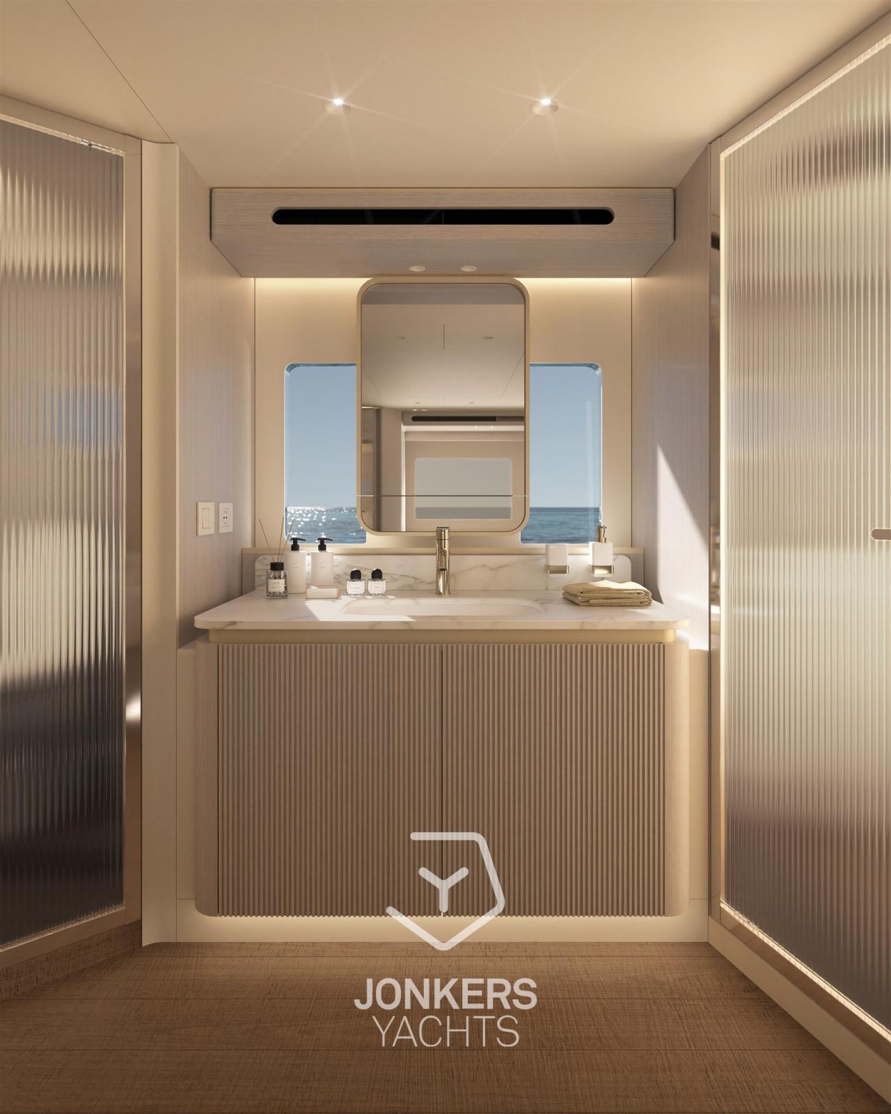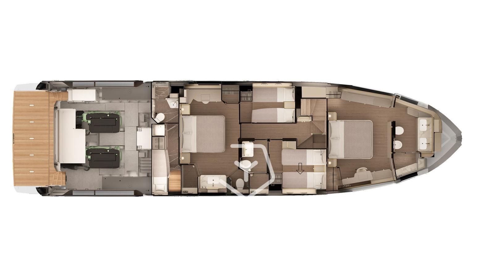 The four cabins, including the master forward with a king-size bed and the aft VIP cabin, guarantee unparalleled comfort, with spaces designed for maximum relaxation. Each cabin is equipped with elegant furnishings, en-suite bathrooms, and smart solutions such as the electrically sliding bed in the guest cabin. Additionally, the crew cabin, with separate access and a private bathroom, ensures smooth onboard management, making every journey a luxurious and practical experience.