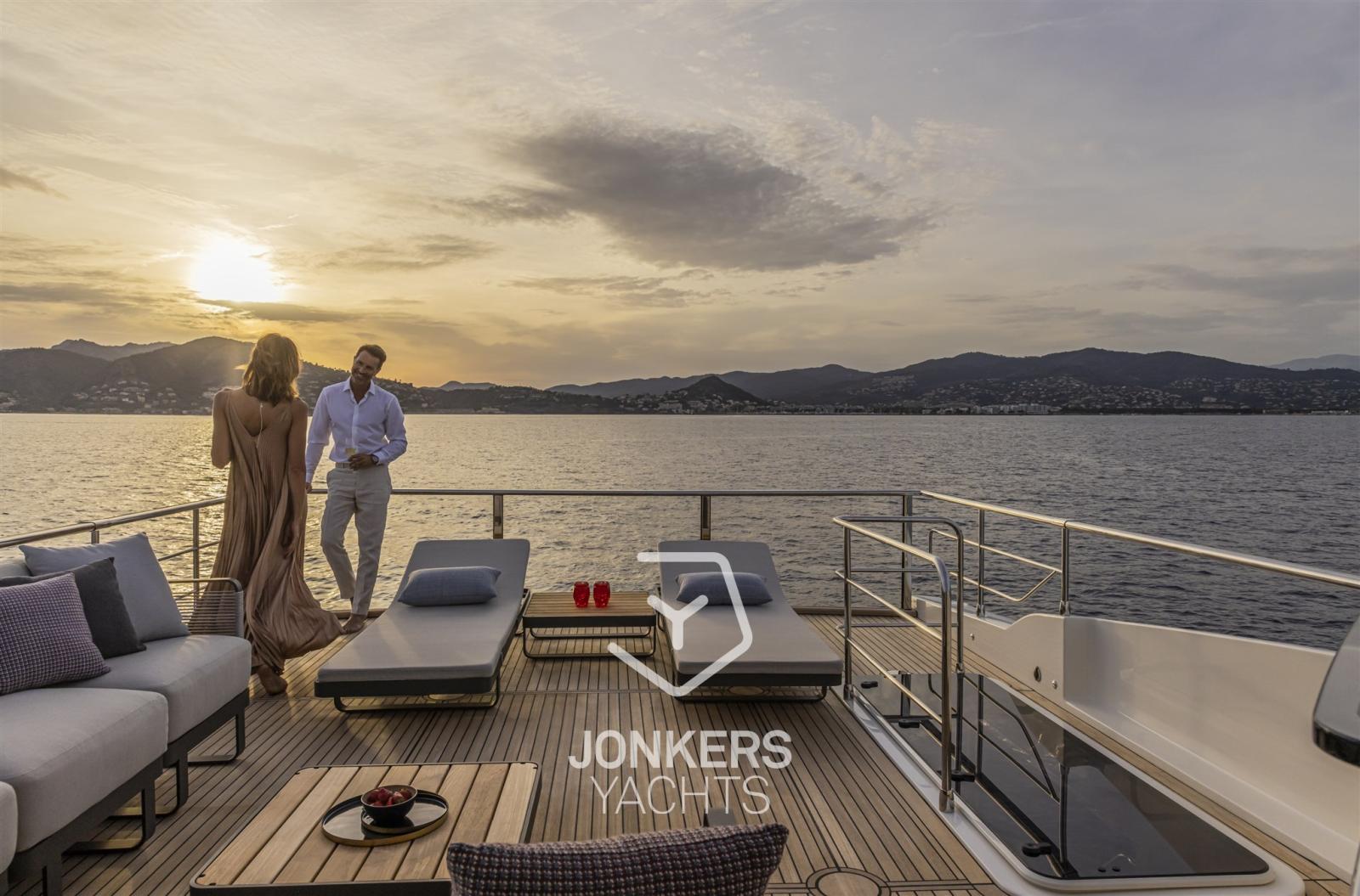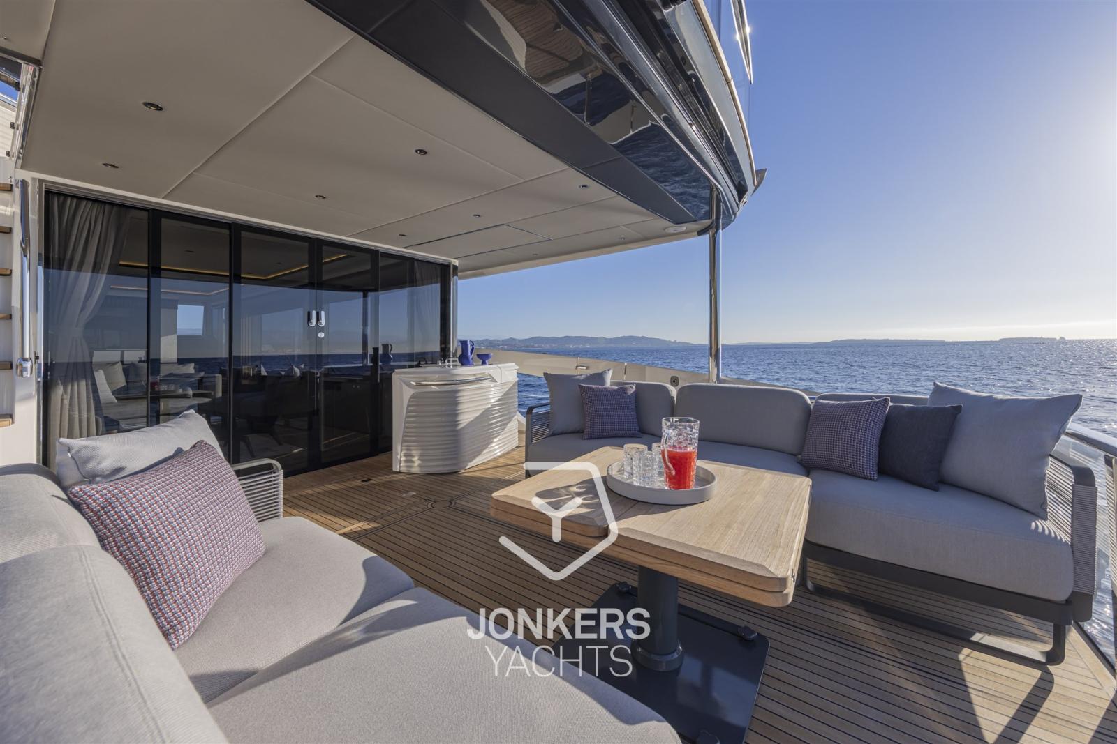 Already a success on Flybridge and Coupé range boats, Navetta 75 also features an aft terrace cockpit with a glass rear parapet; the owner will be able to furnish it as desired to enjoy breathtaking views from here.
