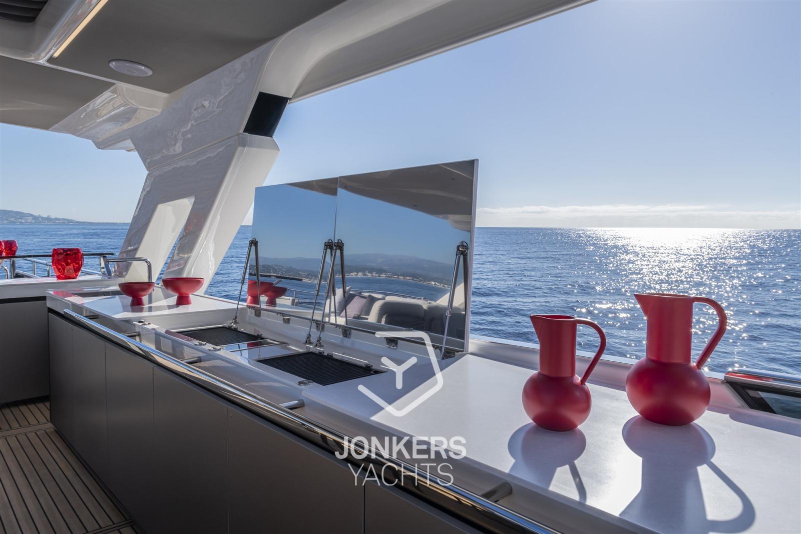 Seamlessly reflecting the interiors, the external areas are optimized to ensure the highest versatility and ease of movement onboard. With two stairways to quickly climb to the flybridge, from the stern and the bow, the crew can move wherever needed, ensuring privacy for the owner and without interfering with guests. A third and a fourth mooring station are available to enhance the two steering consoles for unparalleled manoeuvrability. Thanks to modular furnishings and the absence of fixed structural elements, the flybridge and cockpit areas can easily adapt to different needs, ensuring a truly unique and immersive onboard experience.