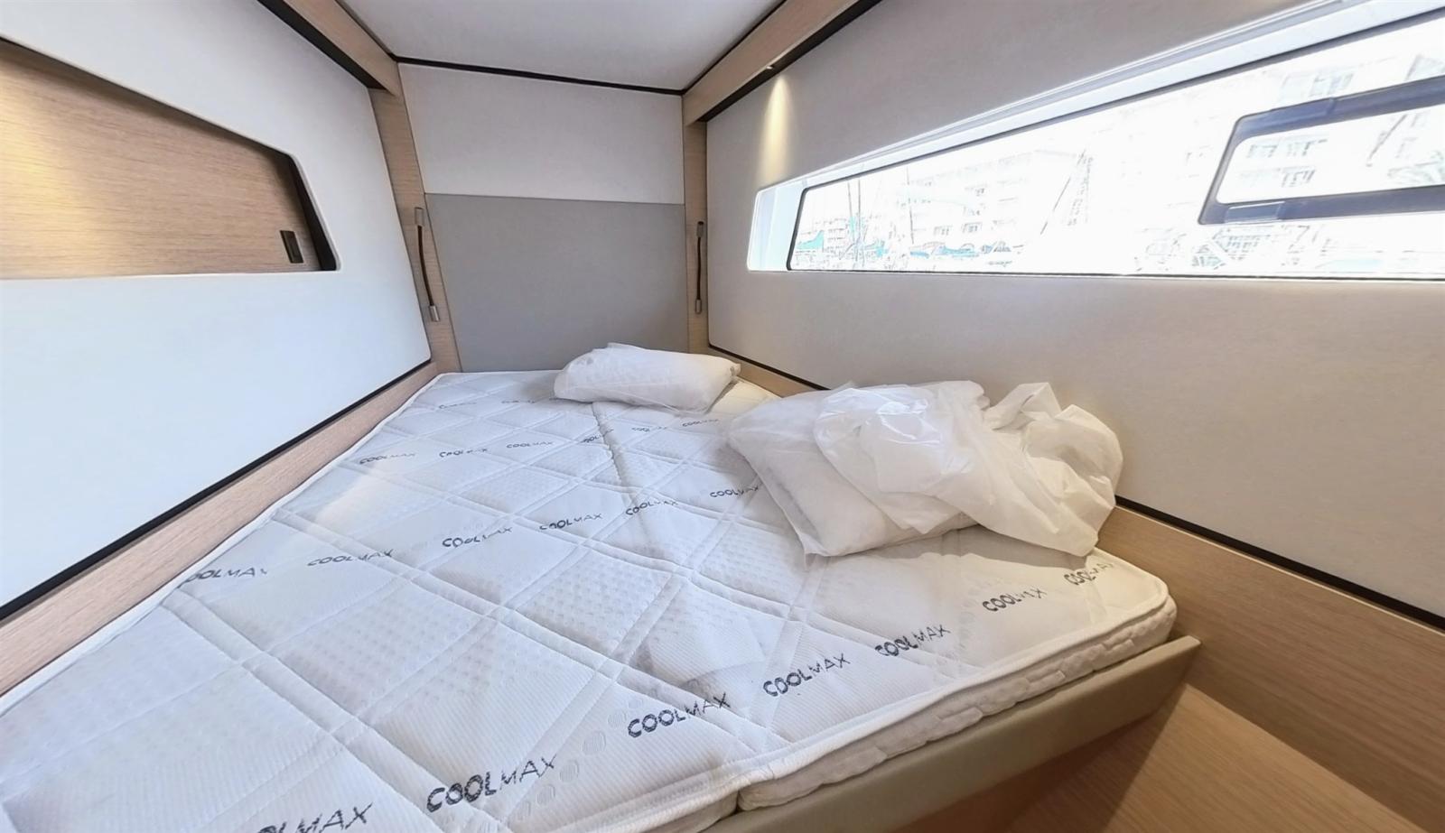 2 Bimini (barreurs avec protections latérales), Cockpit Cover (complet avec porte et protections solaires), Cushions (interieure Cuir), Stern Cushions, Bow Cushions, Cockpit Cushions, Blackout Curtains (et stores moustiquaires), Window Cover (avec ouvrants), Mosquito nets.