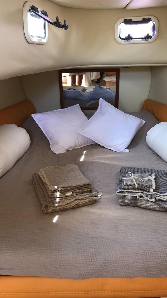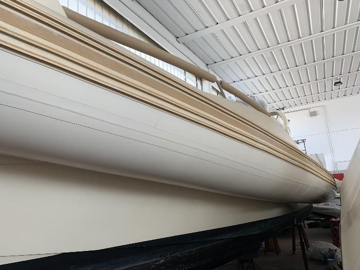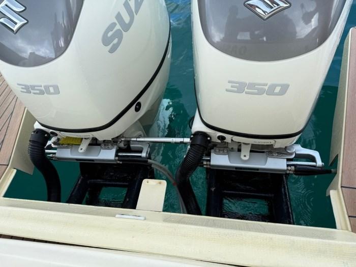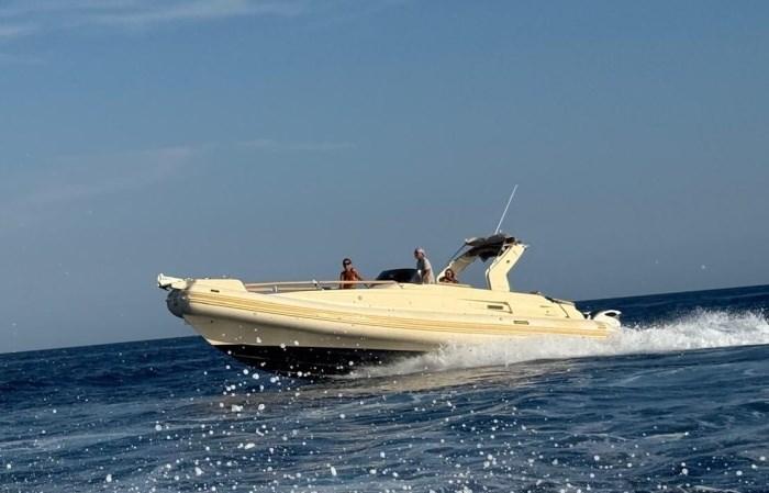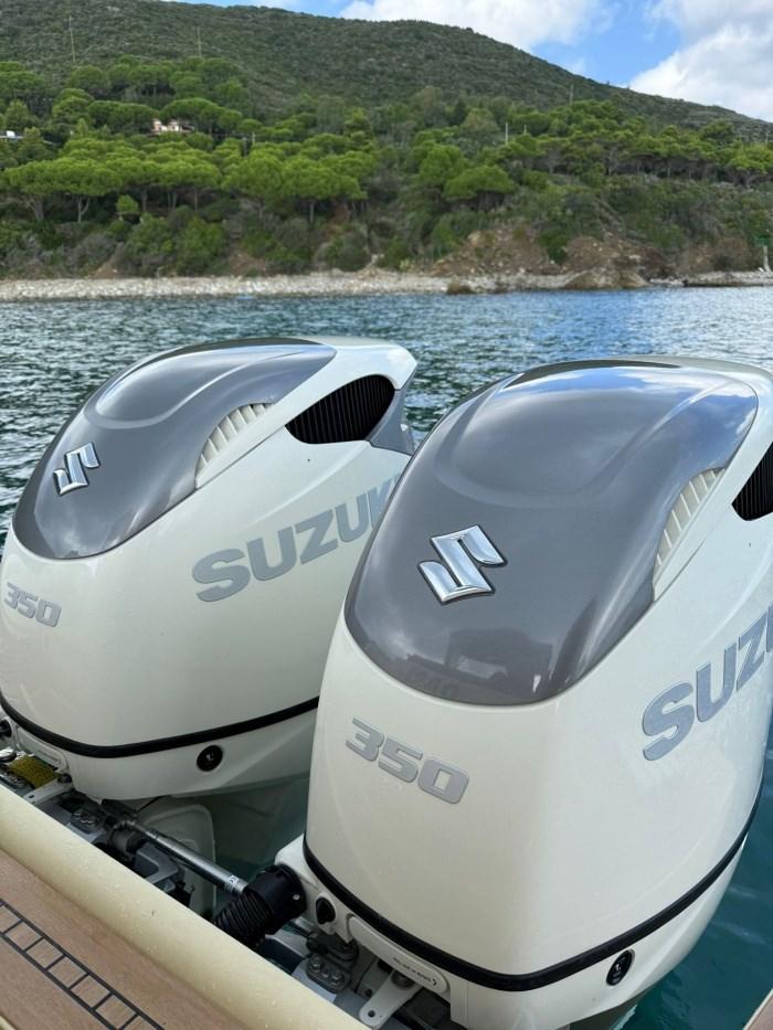 night and day tent in the bimini ; 2 brakes; electronic handcuffs; dual-prop propellers; both internal and external USB sockets; inverter 2000; boiler; all LED lights; TV antenna; removable and washable inner carpet; always put back indoors, in the water from 15 June to 15 September; compressor for inflating the tubes, full cover for the night; Day and night curtains plus bimini for the day against the sun, cockpit cover up to console for daily stops, console cover for the night against humidity. teak coatings on the entire exterior. beach completely redone to design with Osculati design ladder with automatic lock, foldable gangway; 2021 NEW : sliding rear awning poles, stern cover in cream bimini, new platform in flexitec, ladder, hydraulic system with positioning of the water box at the stern 200 liters, leather upholstery of the handrails, kitchen burners. Interiors: new generation audio system with Glauk system with two internal and external areas, invisible system with exciters, corrugated engine tubes, watertight aft lockers; 2024 installed 2 Suzuki 350 one from 2019 and one 2023; 2024 NEW: bow thruster, GPS and Garmin plotter, electrical system ; 2025 NEW: Frigomar air conditioning, toilet, Ultraflex hydraulic steering ; mediation of 5% + VAT 22% to be paid by the buyer (VAT is calculated on the amount of the mediation).