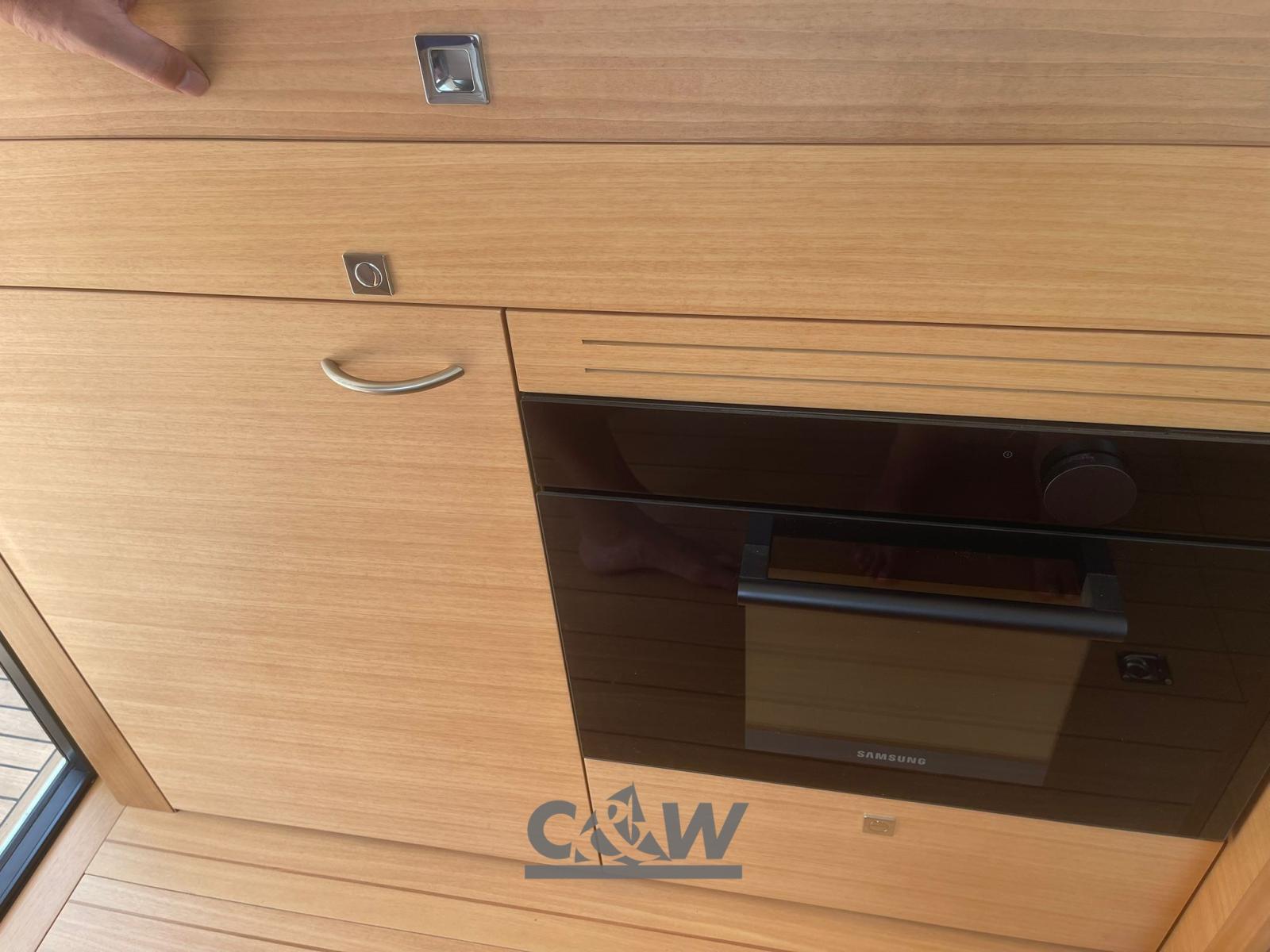 Alternator, Water pressure pump, Special Colour, Electric Flaps, Underwater lights (blu), Fenders, Gangway (elettroidraulica inox e teak), Platform, Teak Cockpit, Shorepower connector, Water harbor connector system, Electric Windlass, swimming ladder (a scomparsa con gradini teak), cockpit table (teak).