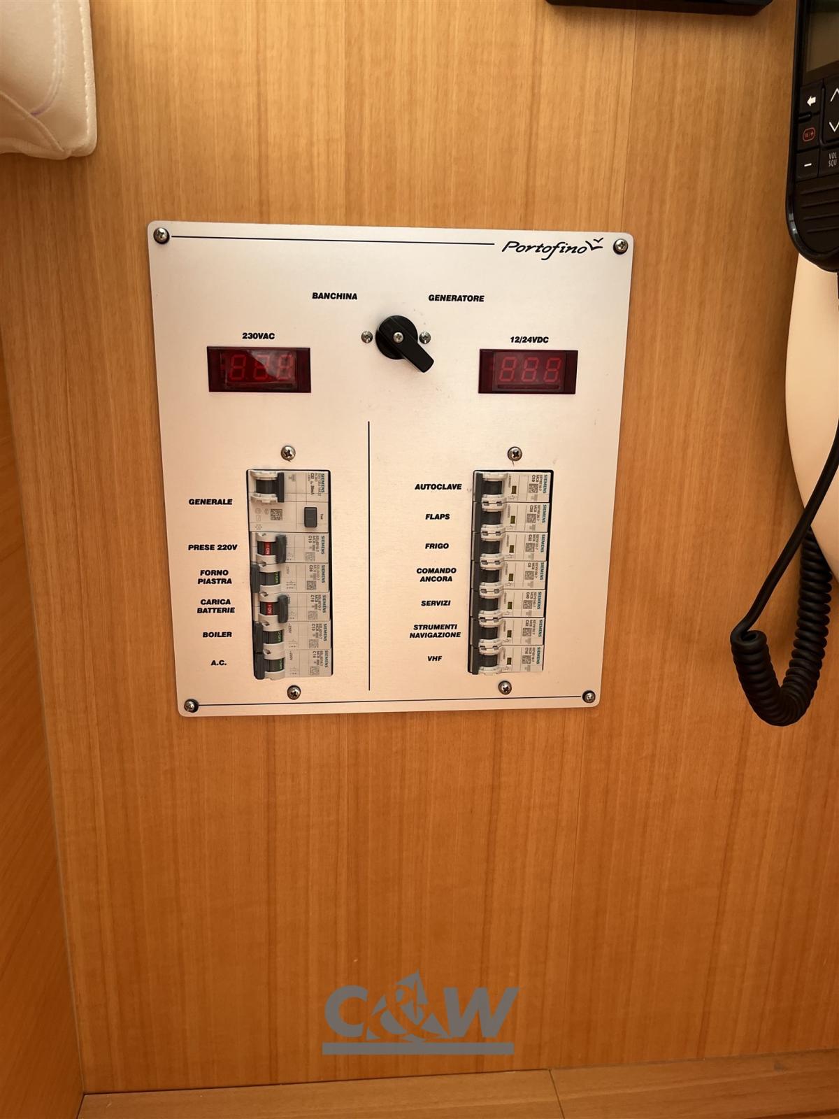 Electronic engine control, 2 DSC vhf (plancia e fly), Autopilot (ST 70 plancia e fly), Plotter with GPS antenna (Raymarine Axiom 12 plancia + Axiom 9 su fly).