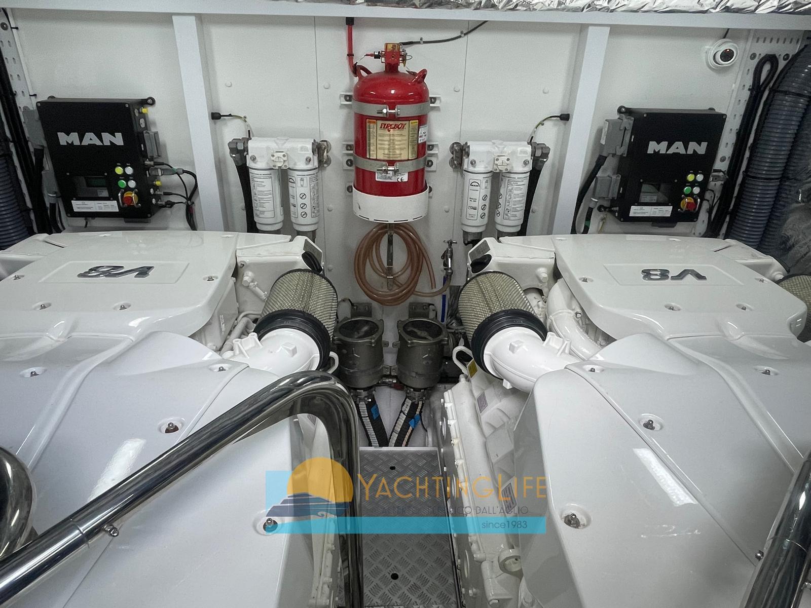 Engine Alarm, Bilge Alarm, Anchor (con 60 mt catena), Water pressure pump, Teak Side Decks, Deck Shower, Twin Steering, Directional Spotlight, Hydraulic Flaps, Tender Garage, Hard top, Fire Extinguishing System, Flaps Indicators, Washbasin in the cockpit, Courtesy Lights, Underwater lights, Gangway (idraulica telescopica 3.5mt), Platform (idraulica), Waste Water Tank Drain Pump, Automatic Bilge Pump, Seawater Pump, Entry door, Teak Cockpit, Shorepower connector, Electric Windlass, swimming ladder, Stabilizers (Seakeeper NG9), cockpit table, Tender, Horn, Stern Winches.