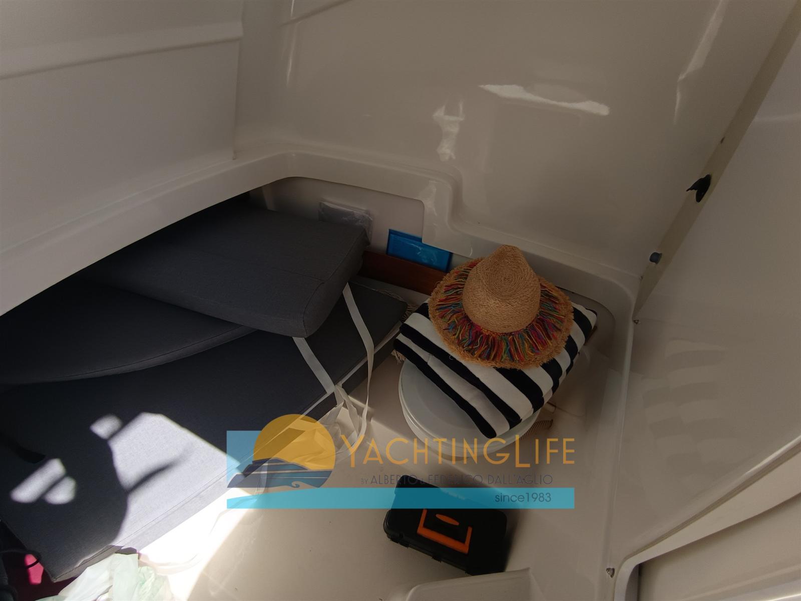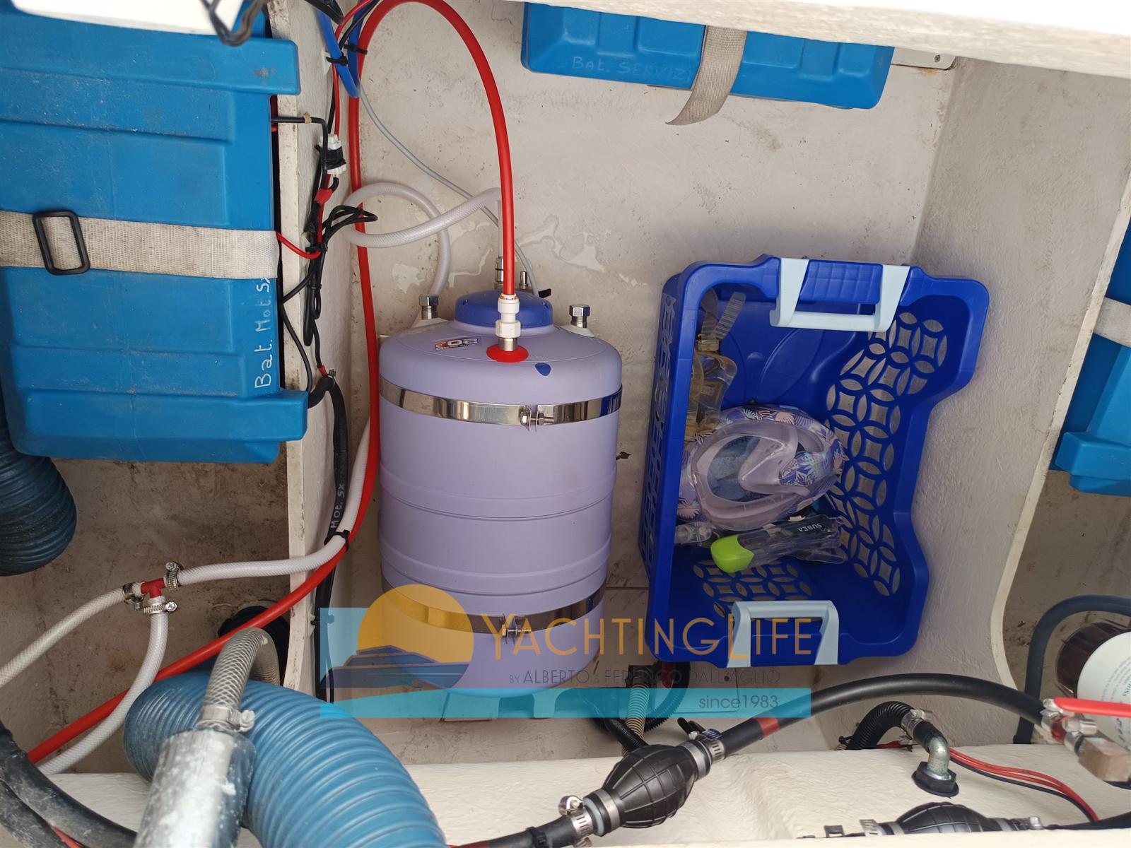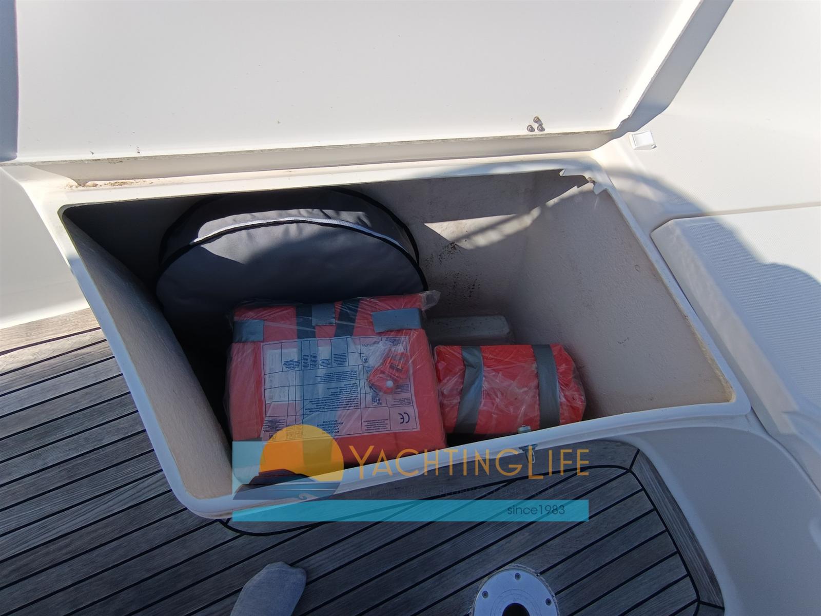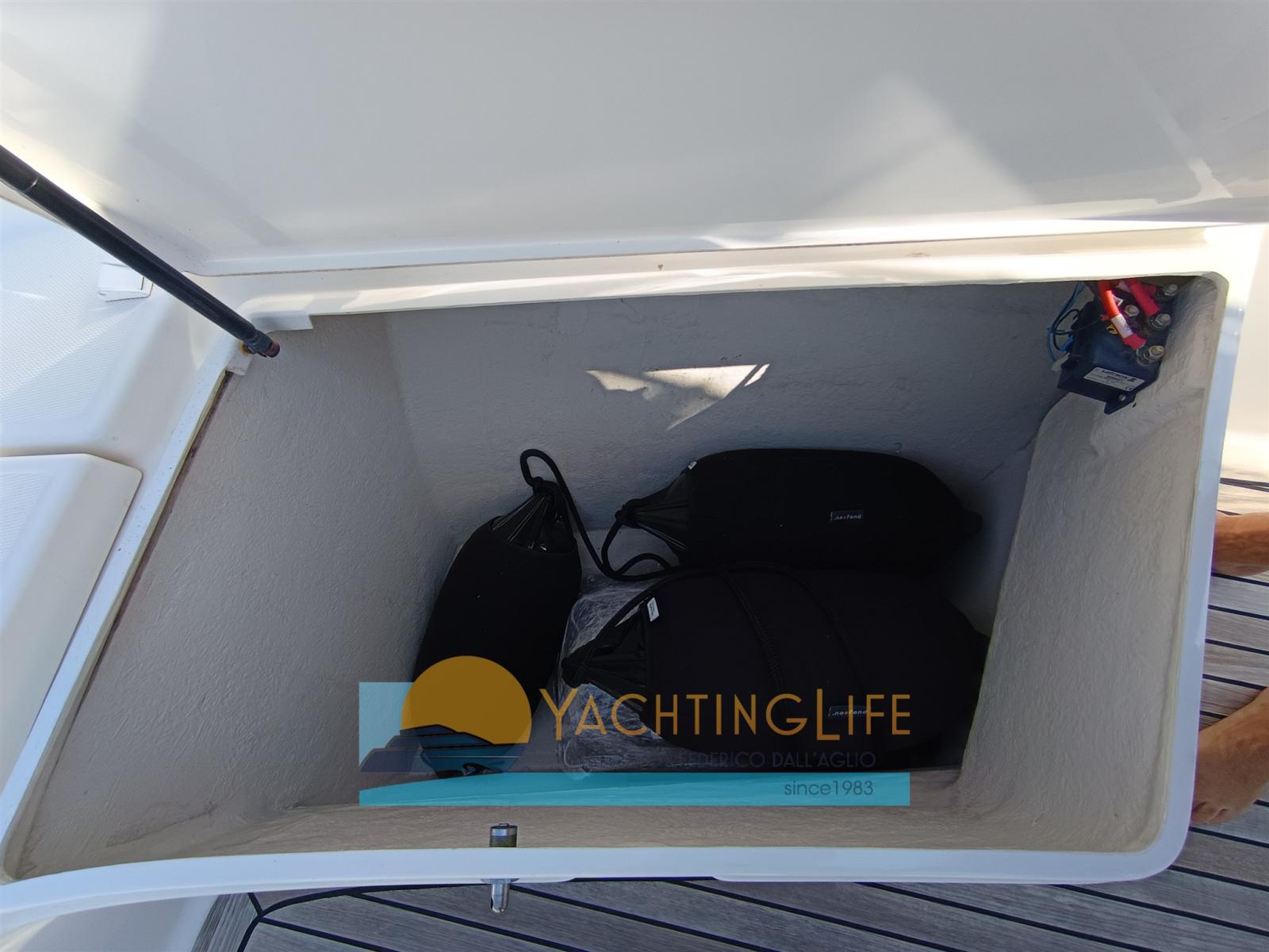Engine Alarm, Water pressure pump, Batteries (Nuove 2025), Special Colour (Grigio 2025), Deck Shower, Headlights fixed on the stem, Washbasin in the cockpit, Fenders, Automatic Bilge Pump, Entry door, Teak Cockpit, Shorepower connector, Electric Windlass, swimming ladder, Horn, T-Top.