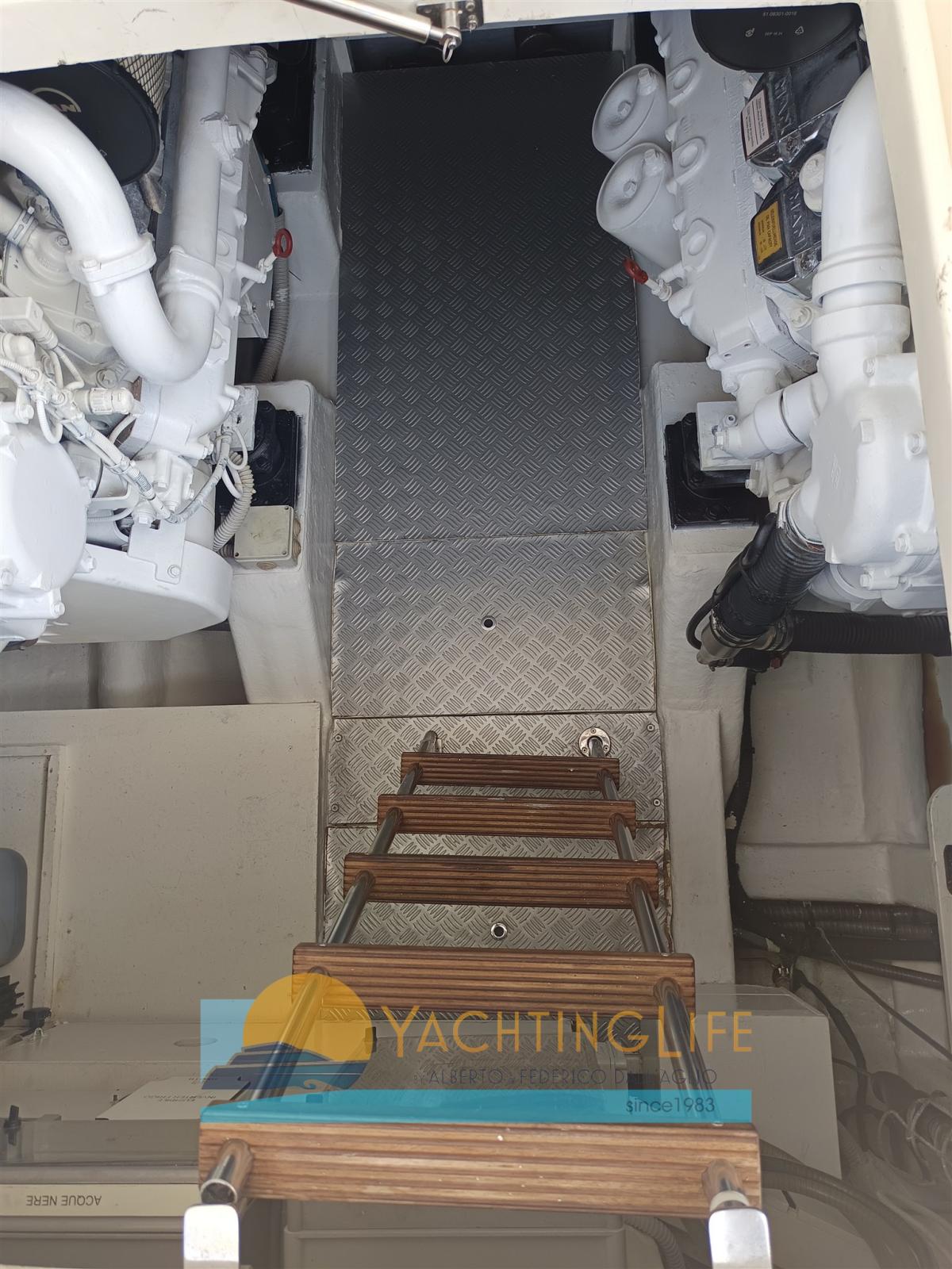 Engine Alarm, Bilge Alarm, Water pressure pump, Deck Shower, Twin Steering, Directional Spotlight, Hydraulic Flaps, Fire Extinguishing System, Flaps Indicators, Washbasin in the cockpit, Courtesy Lights, Underwater lights, Auxiliary Engine (Suzuki 15cv nuovo), Gangway (idraulica riverniciata), Platform, Automatic Bilge Pump, Manual Bilge Pump, Entry door, Teak Cockpit, Shorepower connector, Voltage Rectifier, Electric Windlass, swimming ladder, Saddles for tender, 2 cockpit table, Tender, Horn, Stern Winches.