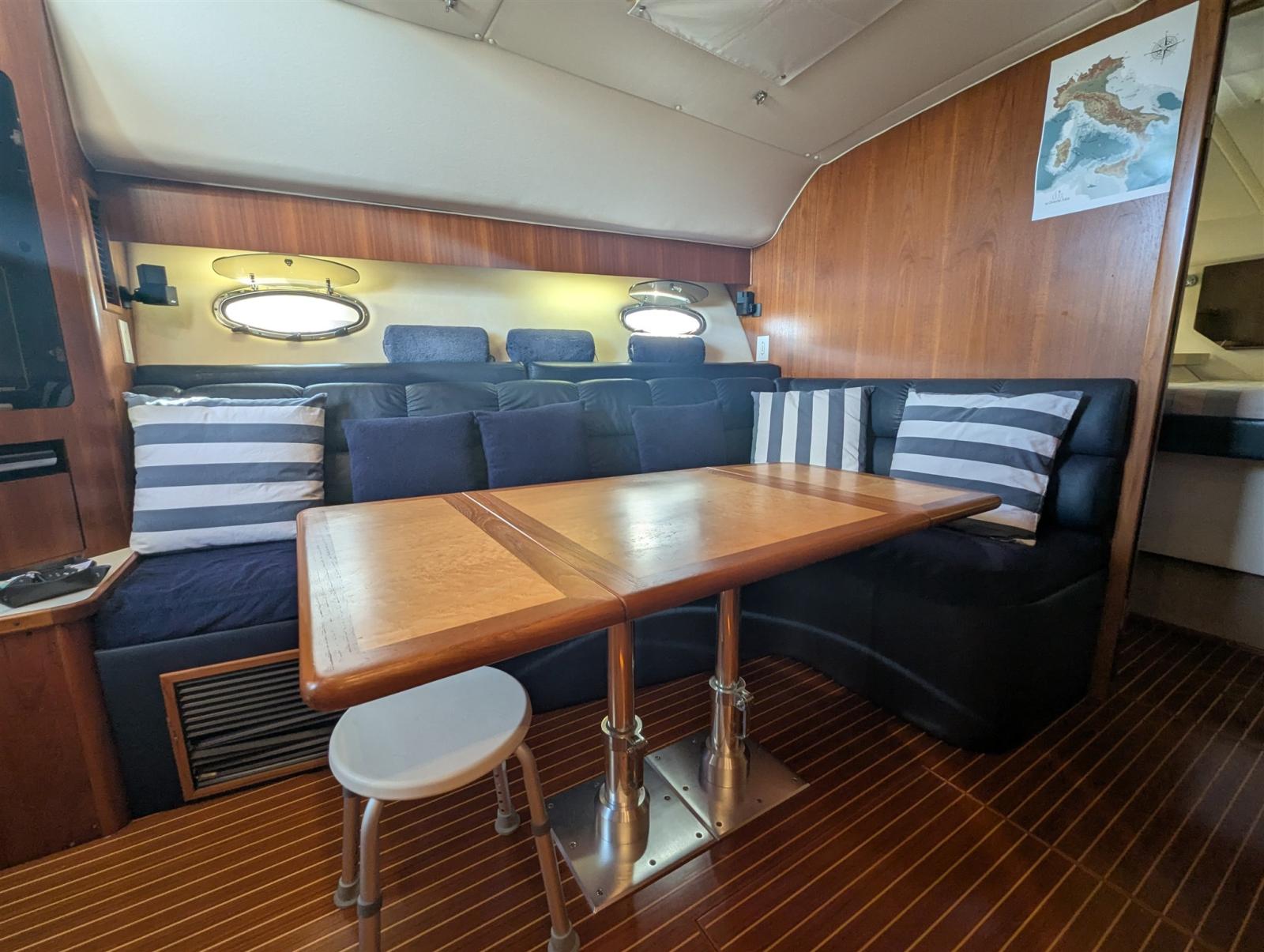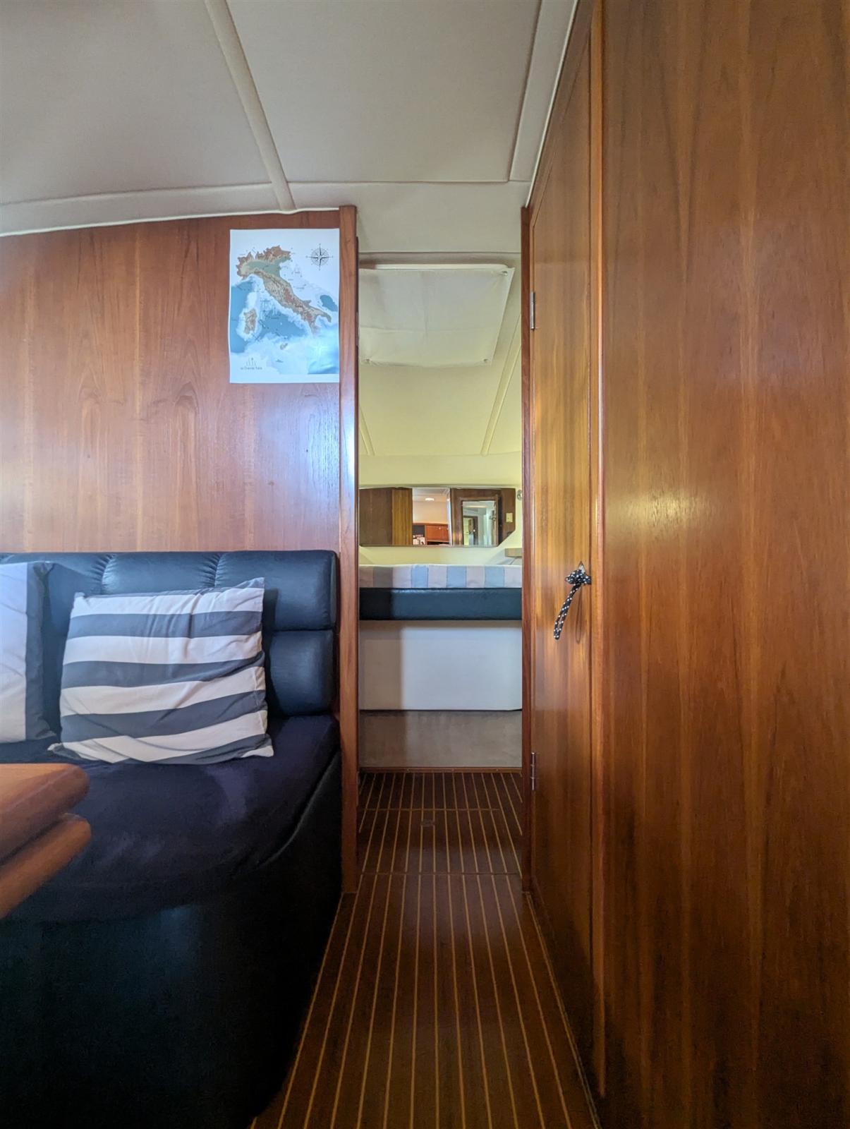 Fume/Gas Detector, 2 Engine Alarm, Bilge Alarm, Alternator, Water pressure pump, Shore power cable, Safety rail, Deck Shower, Headlights fixed on the stem, Hydraulic Flaps, Fire Extinguishing System, Washbasin in the cockpit, Courtesy Lights, Fenders, Gangway (Manuale), Platform, Automatic Bilge Pump, Seawater Pump, Entry door, Shorepower connector, Water harbor connector system, Voltage Rectifier, Rollbar, Electric Windlass, swimming ladder, Living Room Foldable Table, Horn.