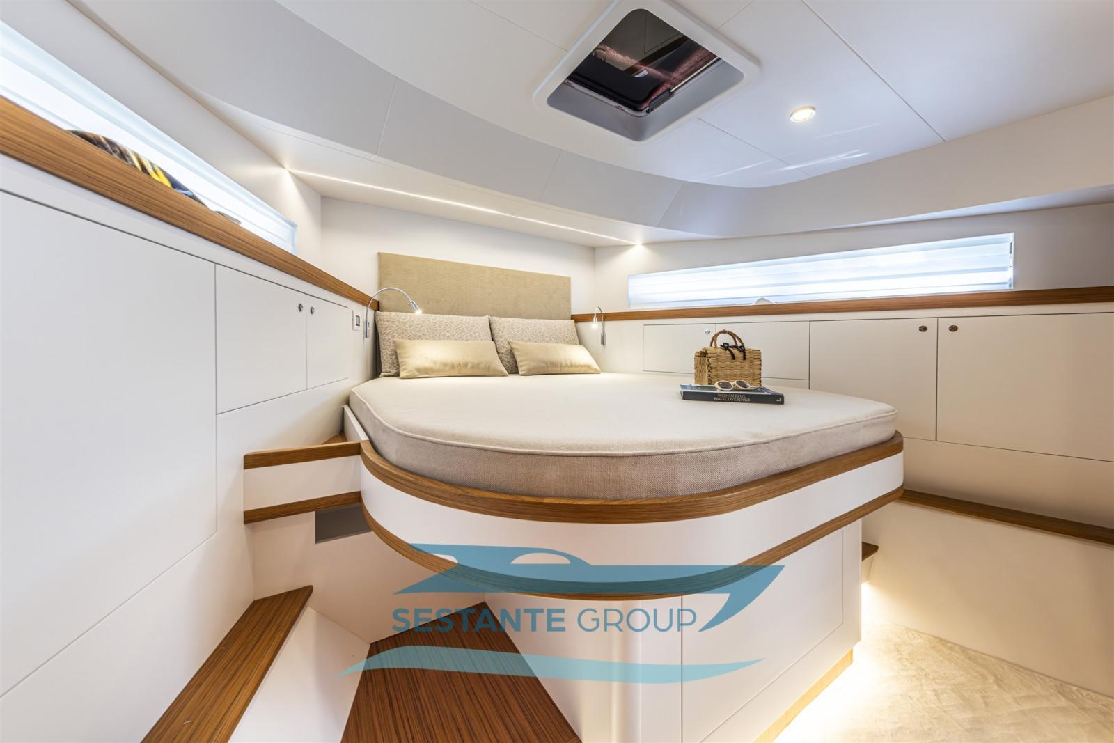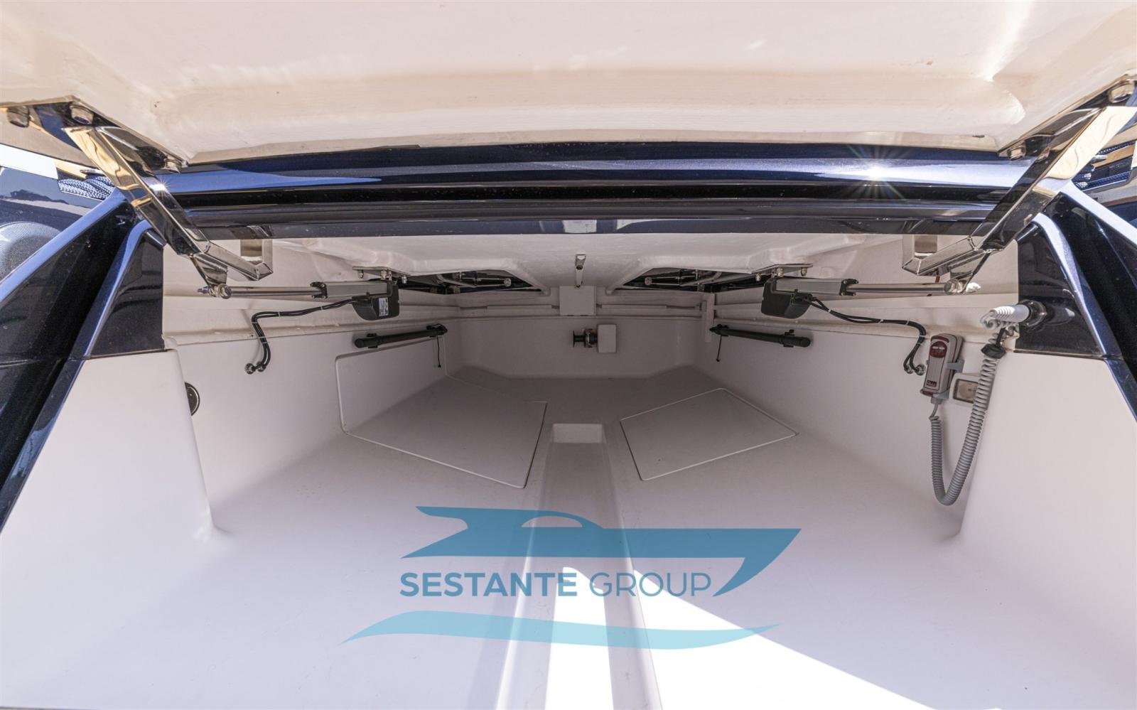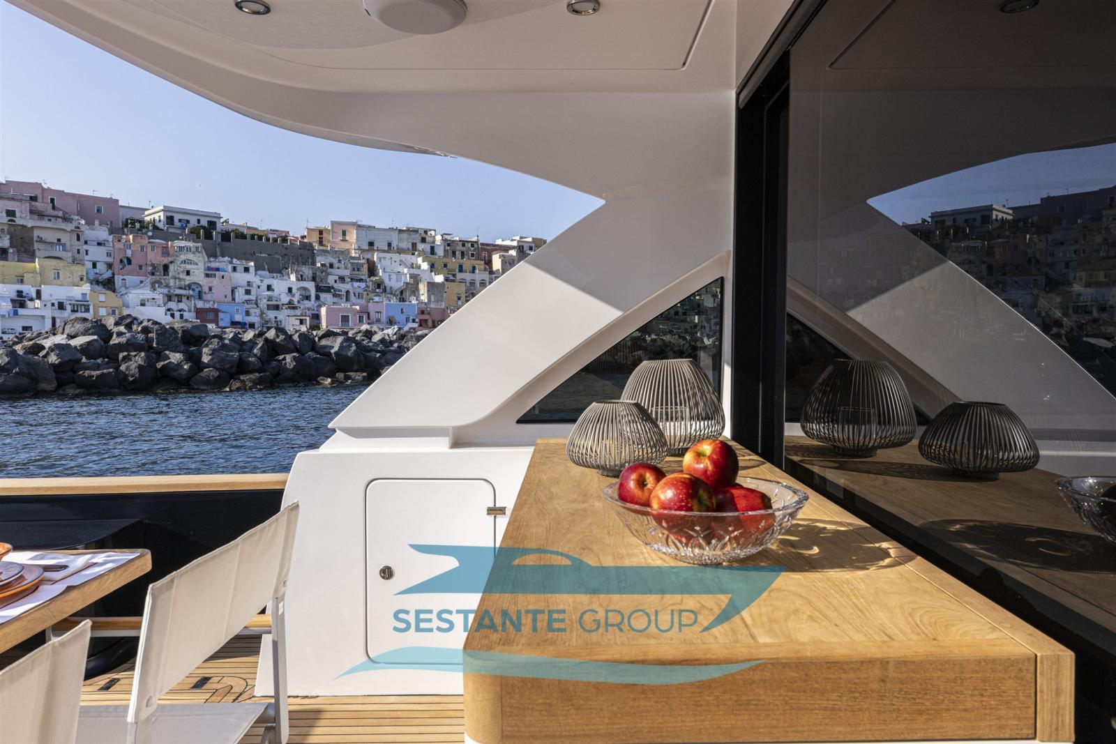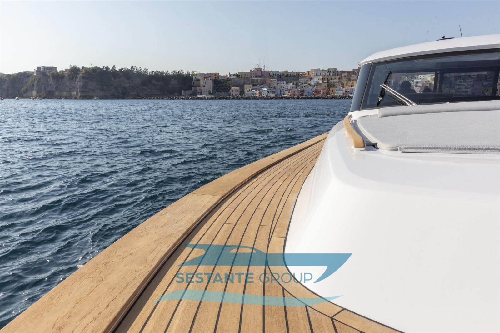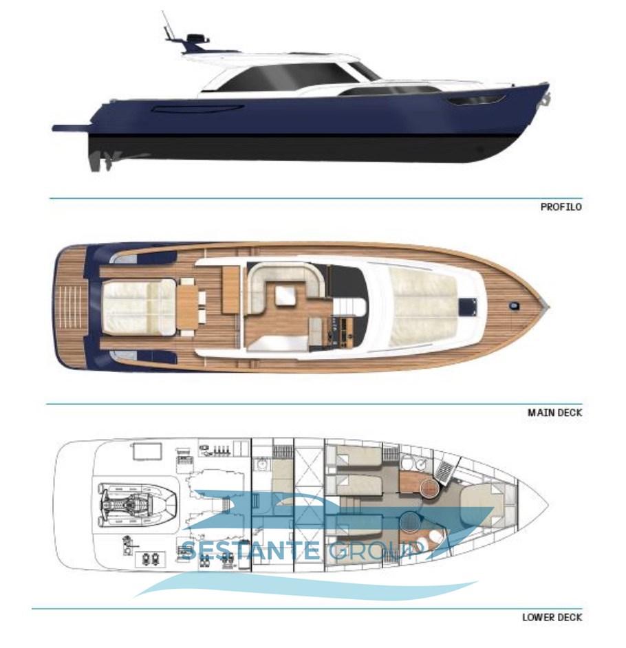 Fume/Gas Detector, Engine Alarm, Bilge Alarm, Anchor (Trefoil 30 Kg-catena 100mt), Auto Dynamic Trim Interceptor, 2 Water pressure pump (GIANNESCHI con controllo elettronico), 2 Life Raft (6 persone), 7 Batteries (4 (225ah) servizi-2 (225ah) motori-1 (90ah) generatore), 4 Folding cleats, Draining System, 2 Teak Side Decks, 3 Battery charger, Shore power cable, Special Colour, 2 Deck Shower (Prua e poppa con miscelatore), Bow Thruster (220 kgf), Tender Garage (con movimentazione elettrica per tender da 2,85mt), Fire Extinguishing System, Anchor Chain Washdown, Washbasin in the cockpit, Courtesy Lights (led), 3 Underwater lights (led in acciaio inox AISI 316 L), Gangway (elettroidraulica a scomparsa), Platform (tenderlift a movimentazione elettroidraulica), 6 Automatic Bilge Pump, 6 Manual Bilge Pump, Teak deck, Entry door (con verniciatura a polvere nera), Teak Cockpit, Shorepower connector (63 A), Electric Windlass (1700 W), swimming ladder, Stabilizers (SMARTGYRO SG20), cockpit table (in teak con pistone acciaio doppia posizione), Living Room Foldable Table (in teak con pistone acciaio doppia posizione), Horn, 2 Stern Winches (700 W), Bow Winches.