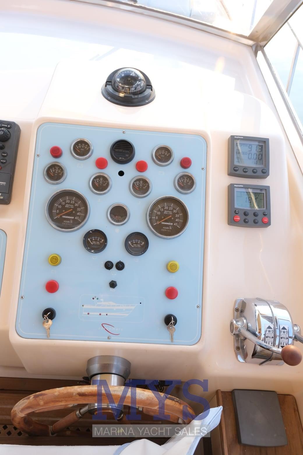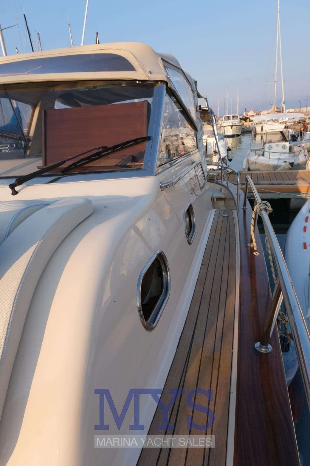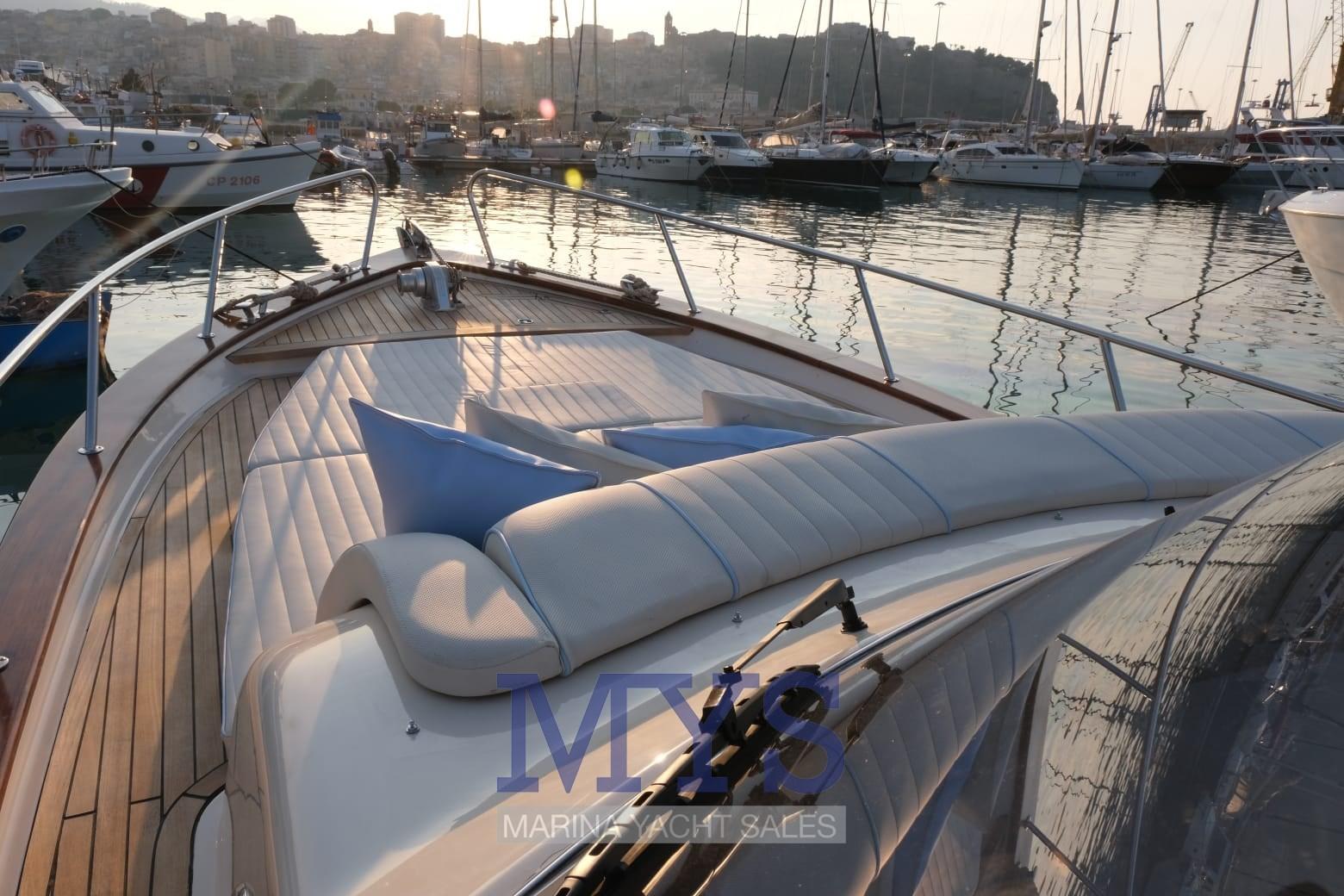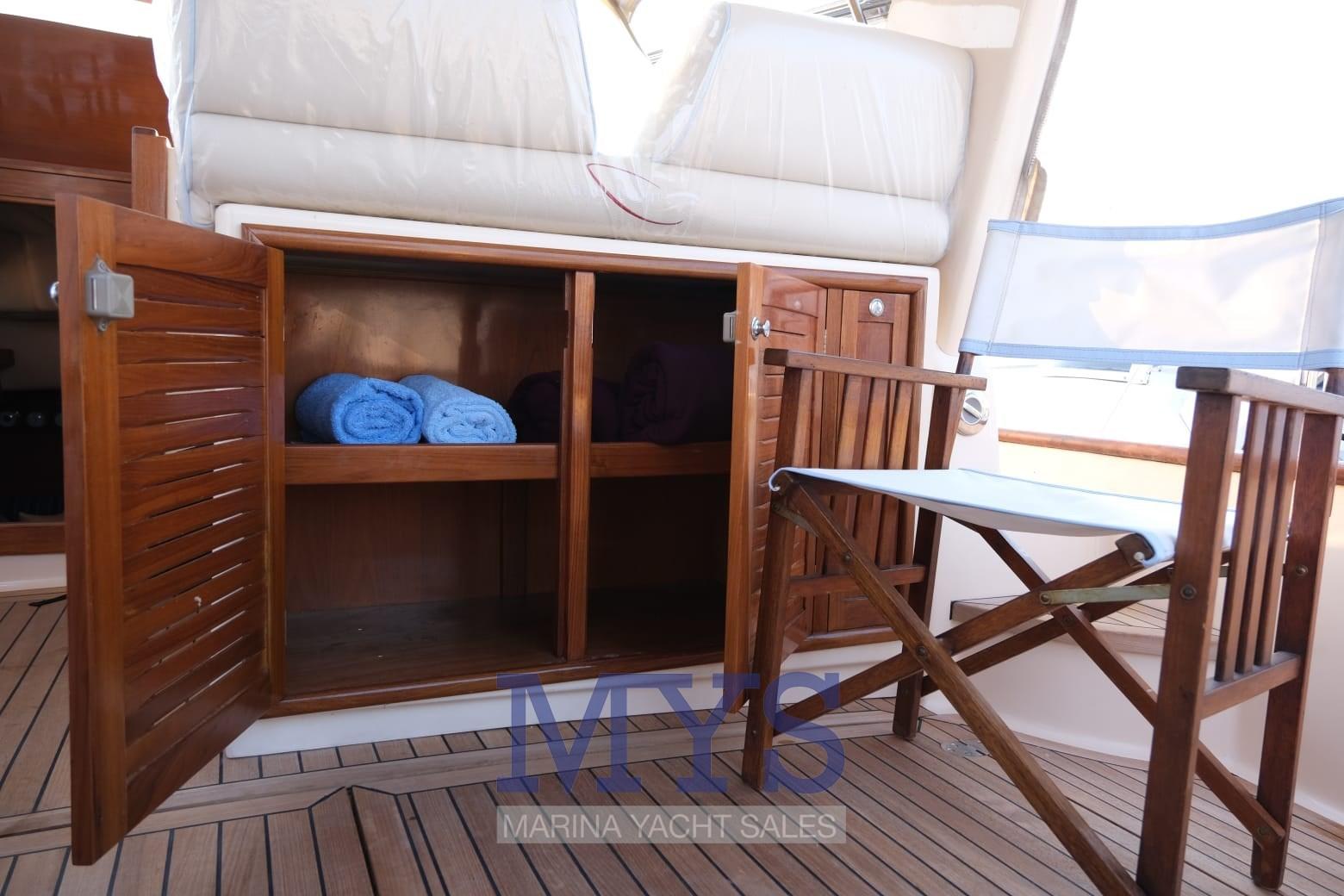 Engine Alarm, Water pressure pump, Shore power cable, Special Colour, Deck Shower, Hydraulic Flaps, Courtesy Lights, Gangway, Platform, Automatic Bilge Pump, Teak Cockpit, Shorepower connector, Electric Windlass, swimming ladder, Horn.