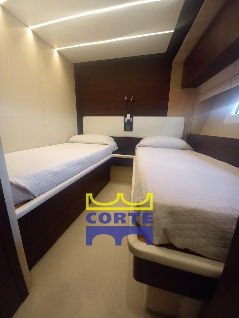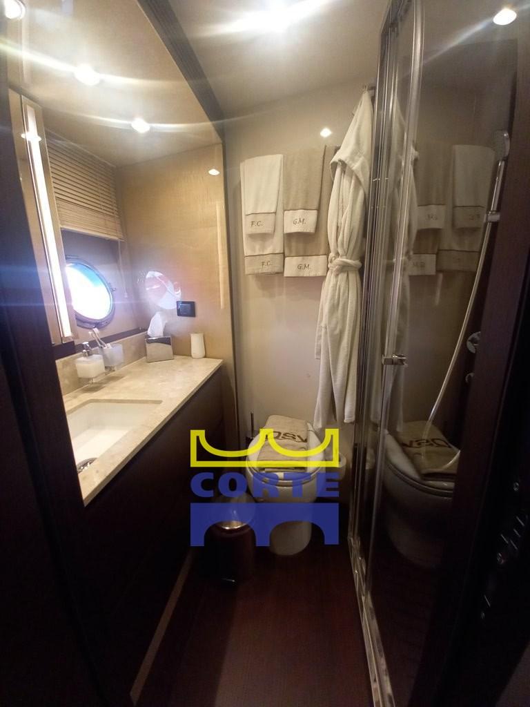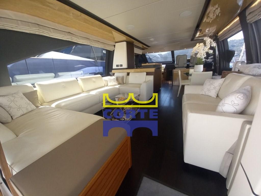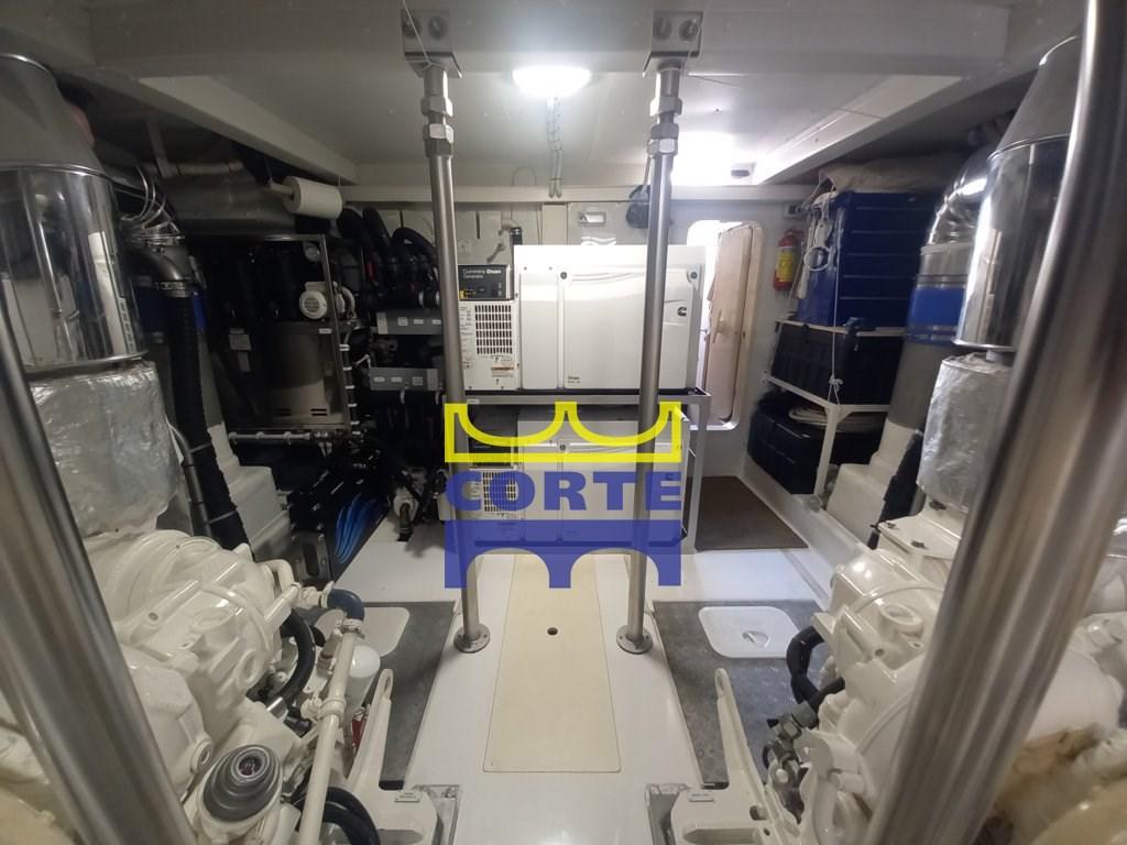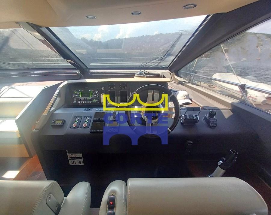 Fume/Gas Detector, Engine Alarm, Bilge Alarm, 2 Auto Dynamic Trim Interceptor (Humphree), Water pressure pump, Teak Side Decks, Deck Shower, Twin Steering, Directional Spotlight, Hard top, Fire Extinguishing System, Courtesy Lights, Gangway (elettroidraulica a scomparsa), Platform (di poppa tender lift), Automatic Bilge Pump, Teak deck, Entry door, Side door, Teak Cockpit, Shorepower connector, Water harbor connector system, Electric Windlass, swimming ladder, Stabilizers (Seakeeper), cockpit table, Tender, Horn, T-Top, 2 Stern Winches, Bow Winches.