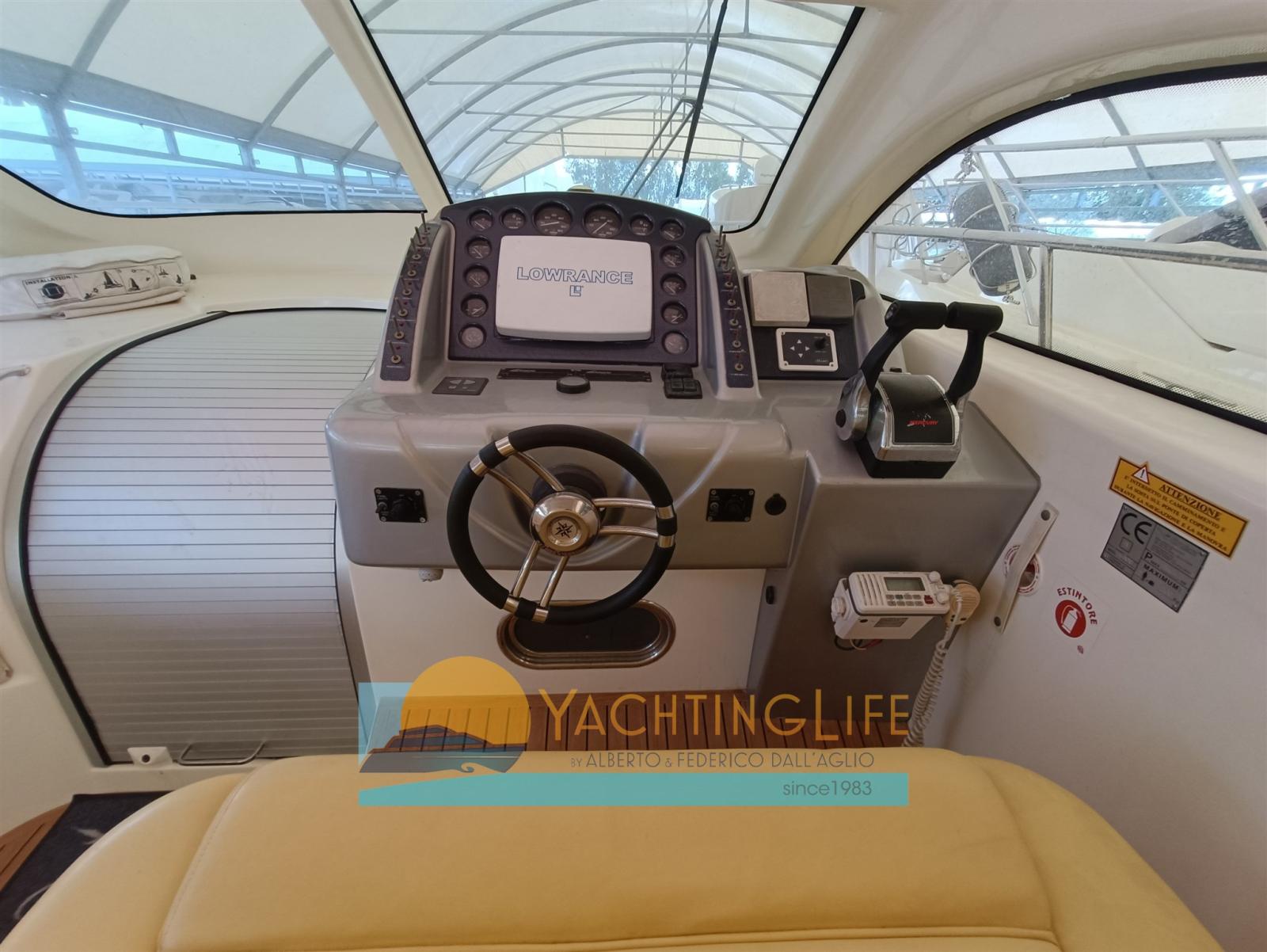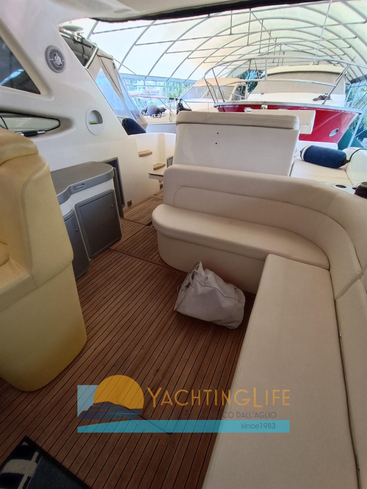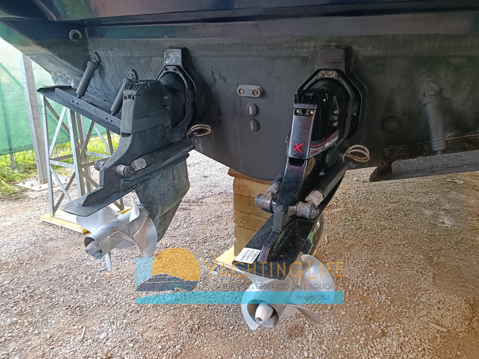 Engine Alarm, Electric Engine Compartment Opening, Water pressure pump, Deck Shower, Directional Spotlight, Hydraulic Flaps, Hard top, Flaps Indicators, Courtesy Lights, Underwater lights, Gangway (a scomparsa), Platform, Manual Bilge Pump, Teak Cockpit, Shorepower connector, Electric Windlass, swimming ladder, cockpit table, Horn.