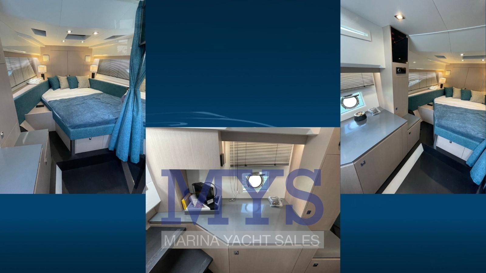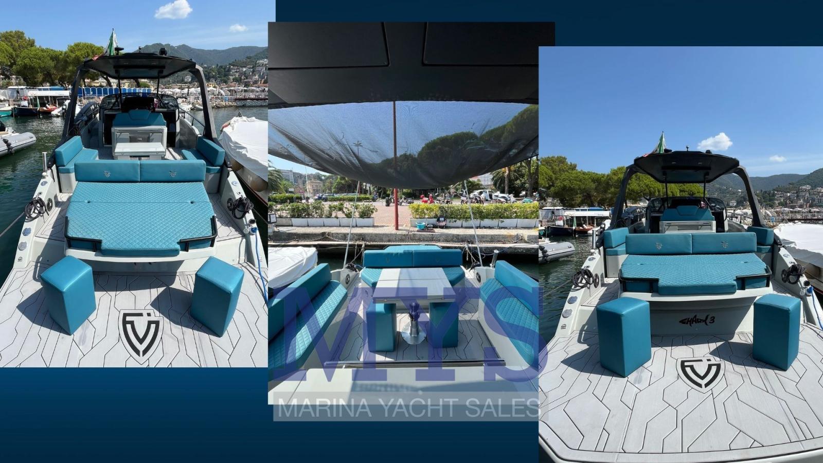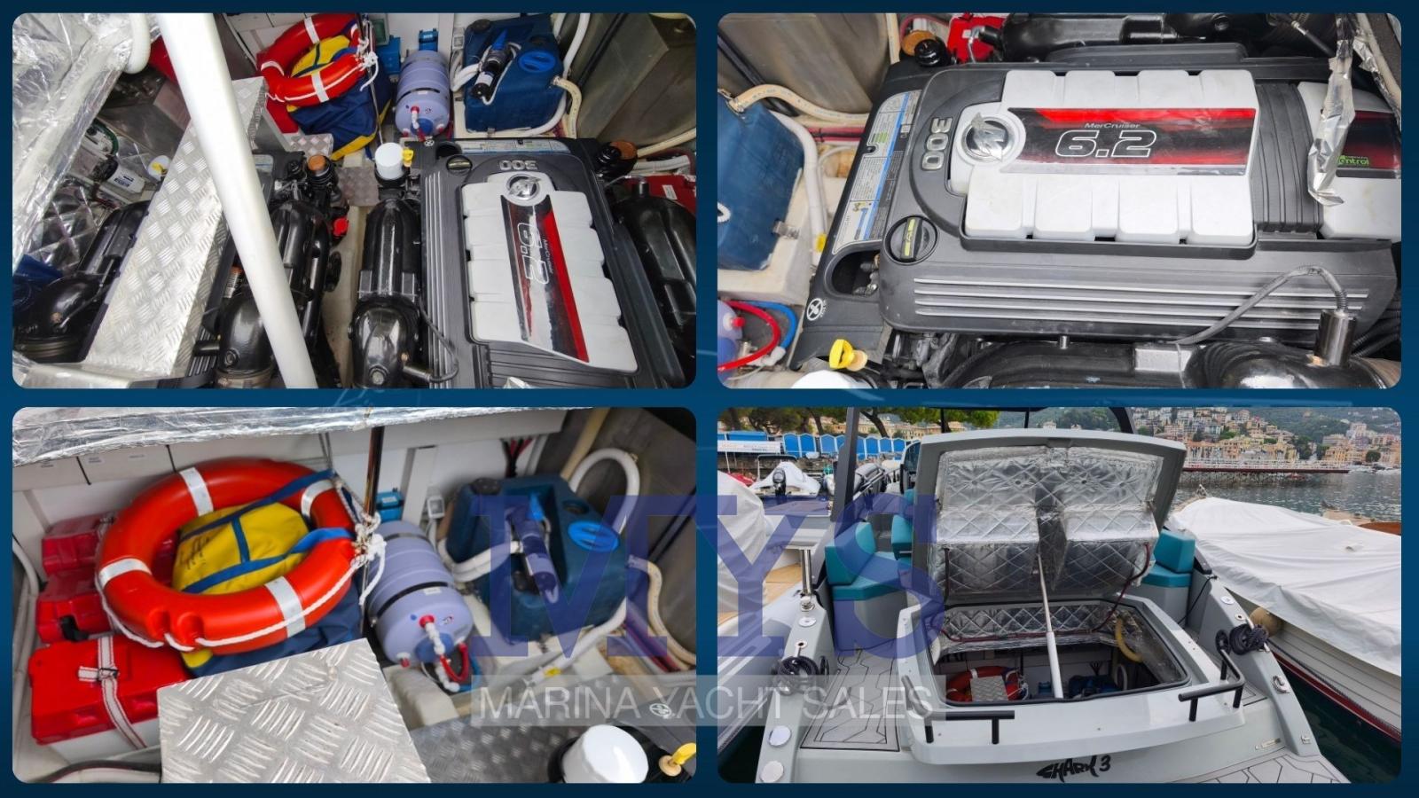 Engine Alarm, Bilge Alarm, Anchor (kg 1 + 50 mt di catena), Electric Engine Compartment Opening, Water pressure pump, 5 Batteries (x 105 Ah), Teak Side Decks (in SeaDek), Shore power cable, Special Colour (Gelcoat GRIGIO 7042), Guard rail, Deck Shower, Directional Spotlight, Washbasin in the cockpit, Courtesy Lights (a Led), 4 Underwater lights, Fenders, Platform (in SeaDek), Automatic Bilge Pump, Manual Bilge Pump, Teak deck (in SeaDek), Entry door, Teak Cockpit (in SeaDek), Shorepower connector, Water harbor connector system, Rollbar, Electric Windlass (700 W), swimming ladder, cockpit table, Horn, T-Top (nero), Teak Deckhouse (in SeaDek).