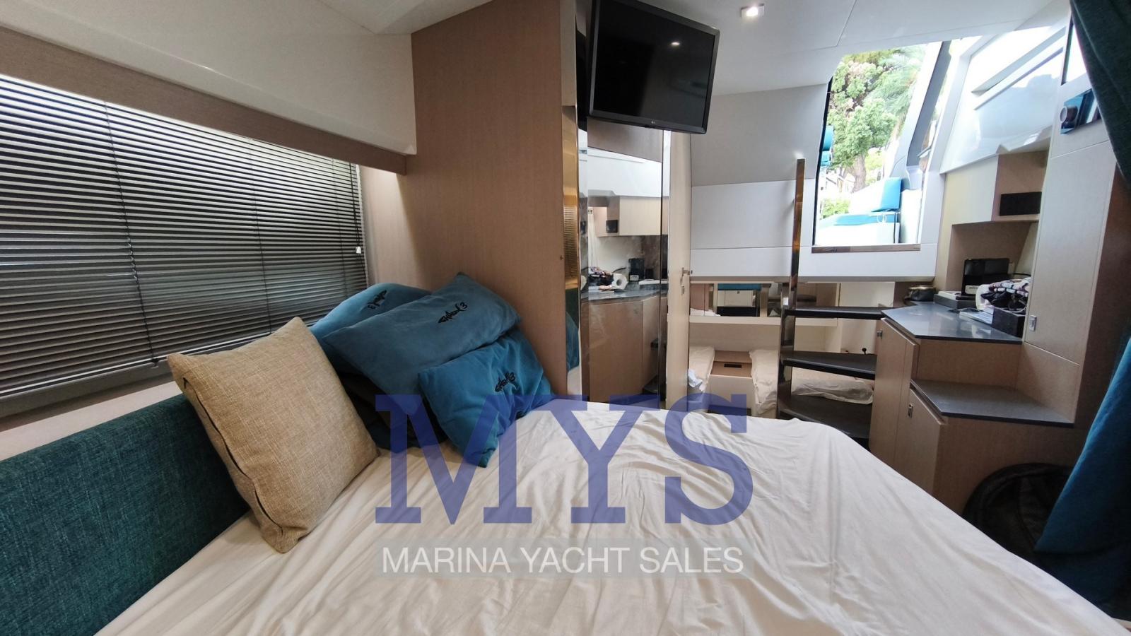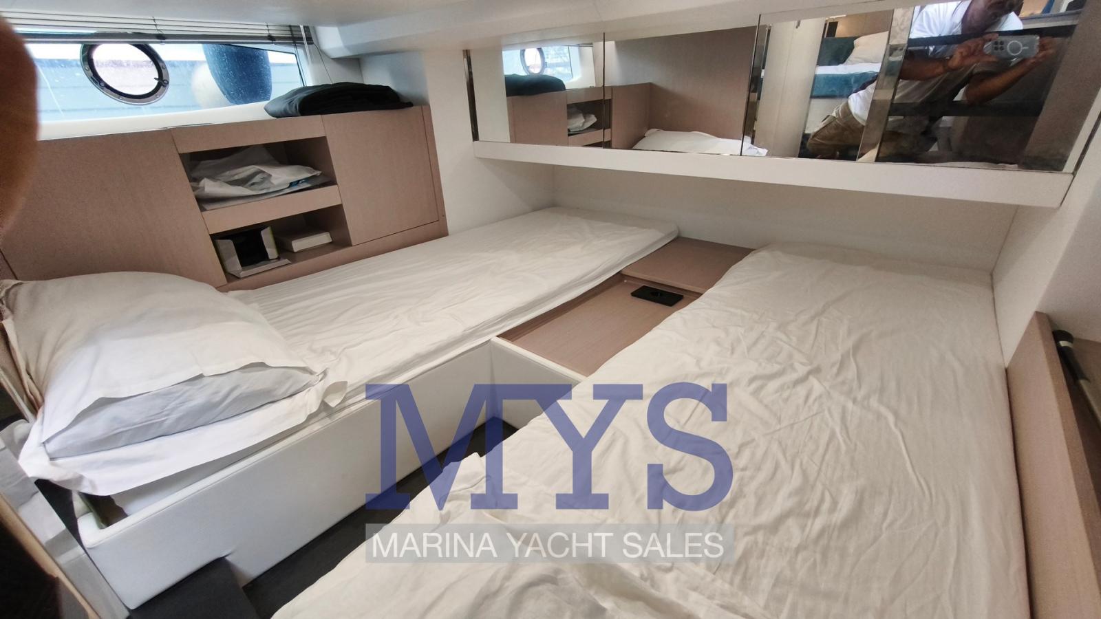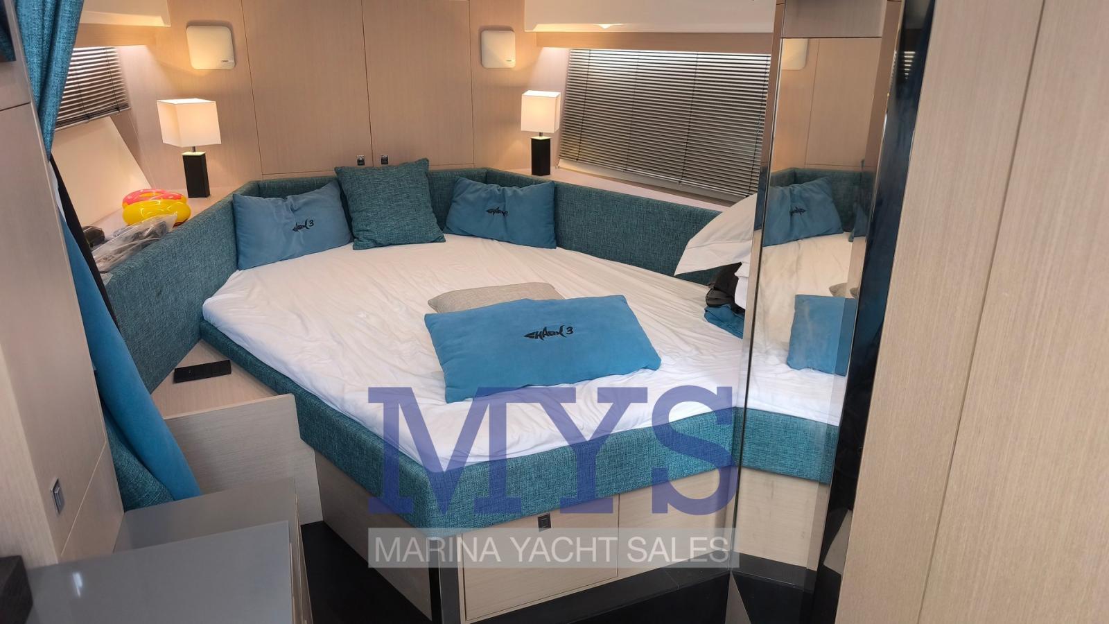 Engine Alarm, Bilge Alarm, Anchor (kg 1 + 50 mt di catena), Electric Engine Compartment Opening, Water pressure pump, 5 Batteries (x 105 Ah), Teak Side Decks (in SeaDek), Shore power cable, Special Colour (Gelcoat GRIGIO 7042), Guard rail, Deck Shower, Directional Spotlight, Washbasin in the cockpit, Courtesy Lights (a Led), 4 Underwater lights, Fenders, Platform (in SeaDek), Automatic Bilge Pump, Manual Bilge Pump, Teak deck (in SeaDek), Entry door, Teak Cockpit (in SeaDek), Shorepower connector, Water harbor connector system, Rollbar, Electric Windlass (700 W), swimming ladder, cockpit table, Horn, T-Top (nero), Teak Deckhouse (in SeaDek).