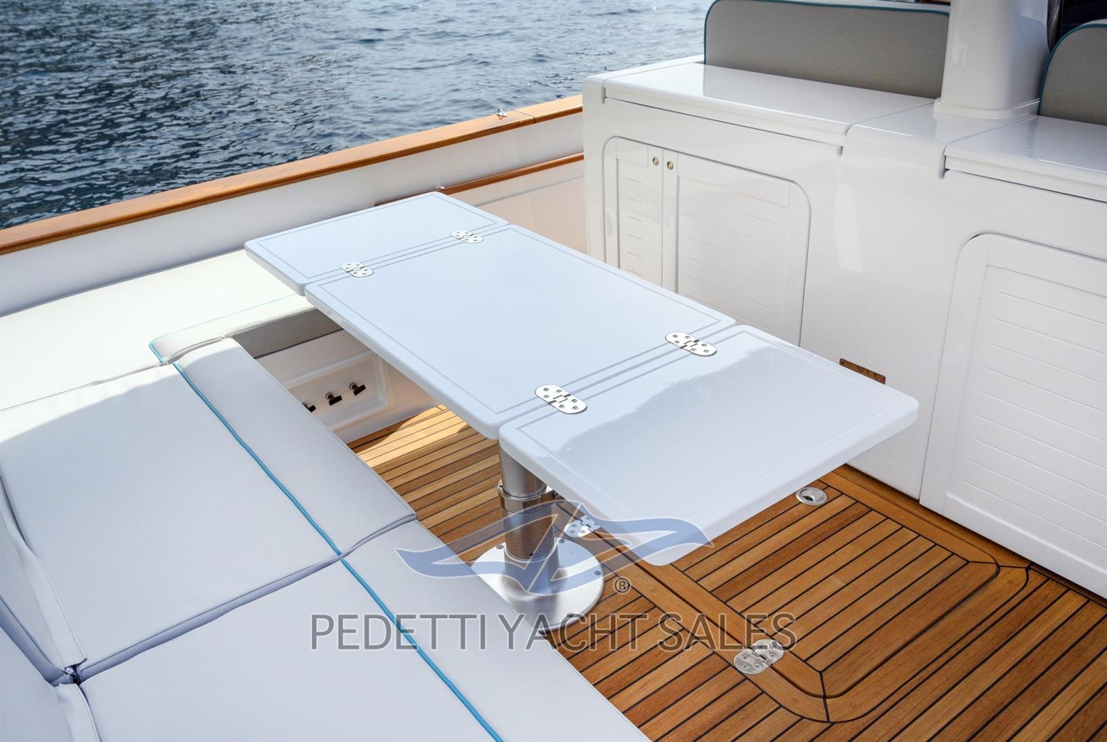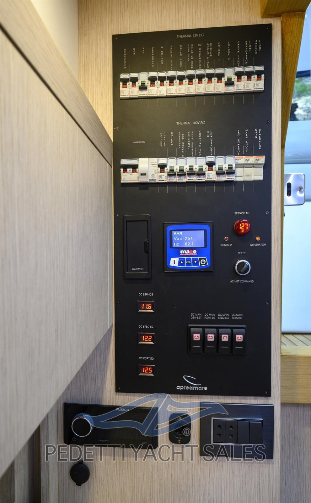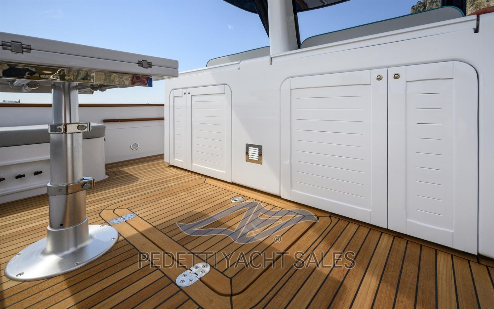 Fume/Gas Detector, Engine Alarm, Bilge Alarm, Water pressure pump, 4 Batteries (2x225 Ah 2x180 Ah), Teak Side Decks, Shore power cable, Deck Shower (A poppa calda e fredda), Electric Flaps, Fire Extinguishing System (A polvere in sala macchine), Flaps Indicators, Washbasin in the cockpit, Courtesy Lights, 8 Fenders, Platform, 2 Automatic Bilge Pump, Manual Bilge Pump, Teak deck, Teak Cockpit, Shorepower connector, Electric Windlass (1000 W), swimming ladder, cockpit table, Horn, T-Top.
