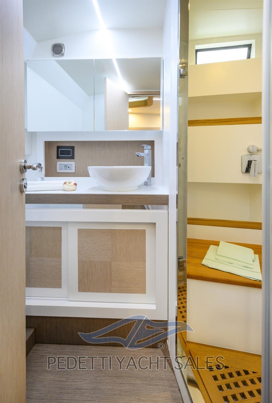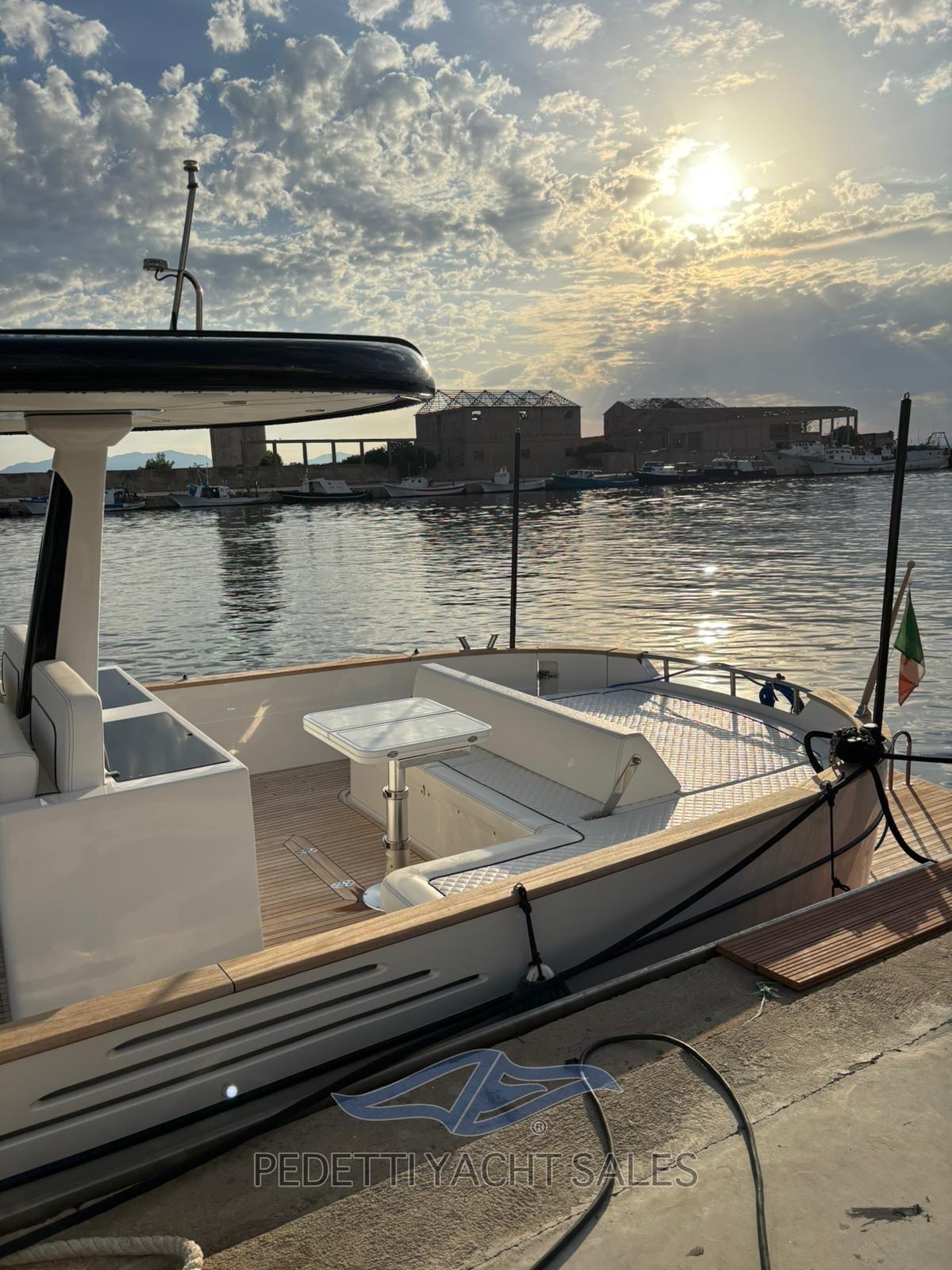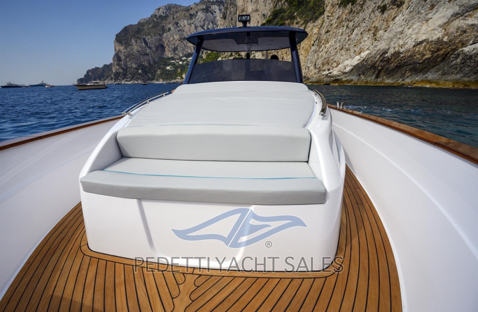Fume/Gas Detector, Engine Alarm, Bilge Alarm, Water pressure pump, 4 Batteries (2x225 Ah 2x180 Ah), Teak Side Decks, Shore power cable, Deck Shower (A poppa calda e fredda), Electric Flaps, Fire Extinguishing System (A polvere in sala macchine), Flaps Indicators, Washbasin in the cockpit, Courtesy Lights, 8 Fenders, Platform, 2 Automatic Bilge Pump, Manual Bilge Pump, Teak deck, Teak Cockpit, Shorepower connector, Electric Windlass (1000 W), swimming ladder, cockpit table, Horn, T-Top.