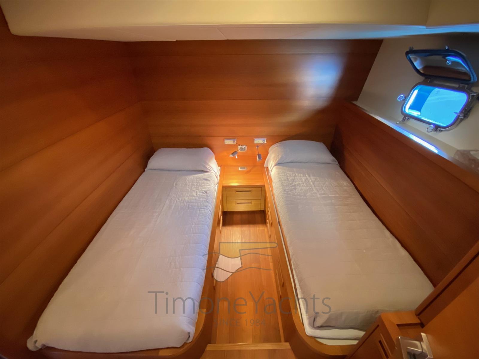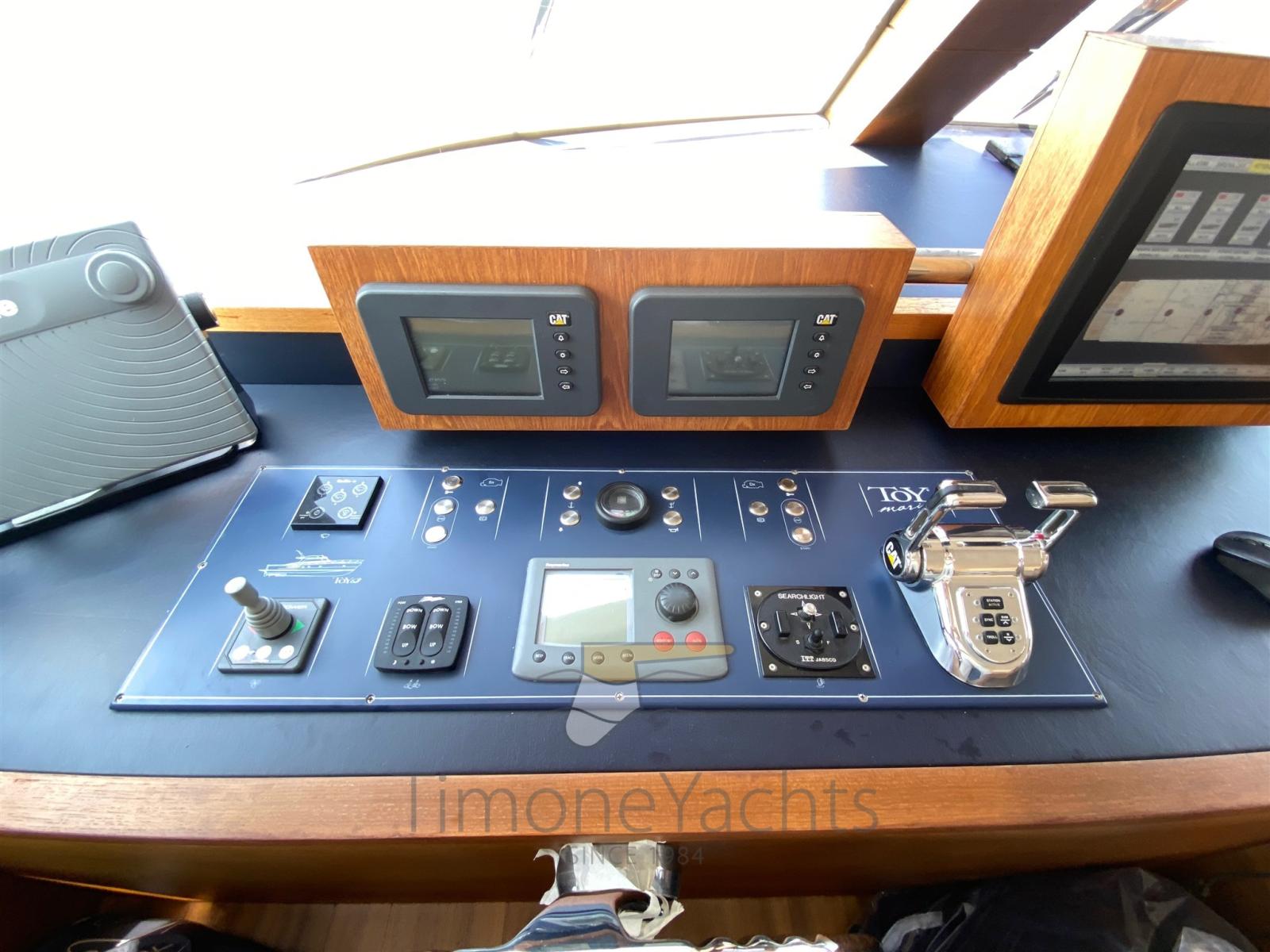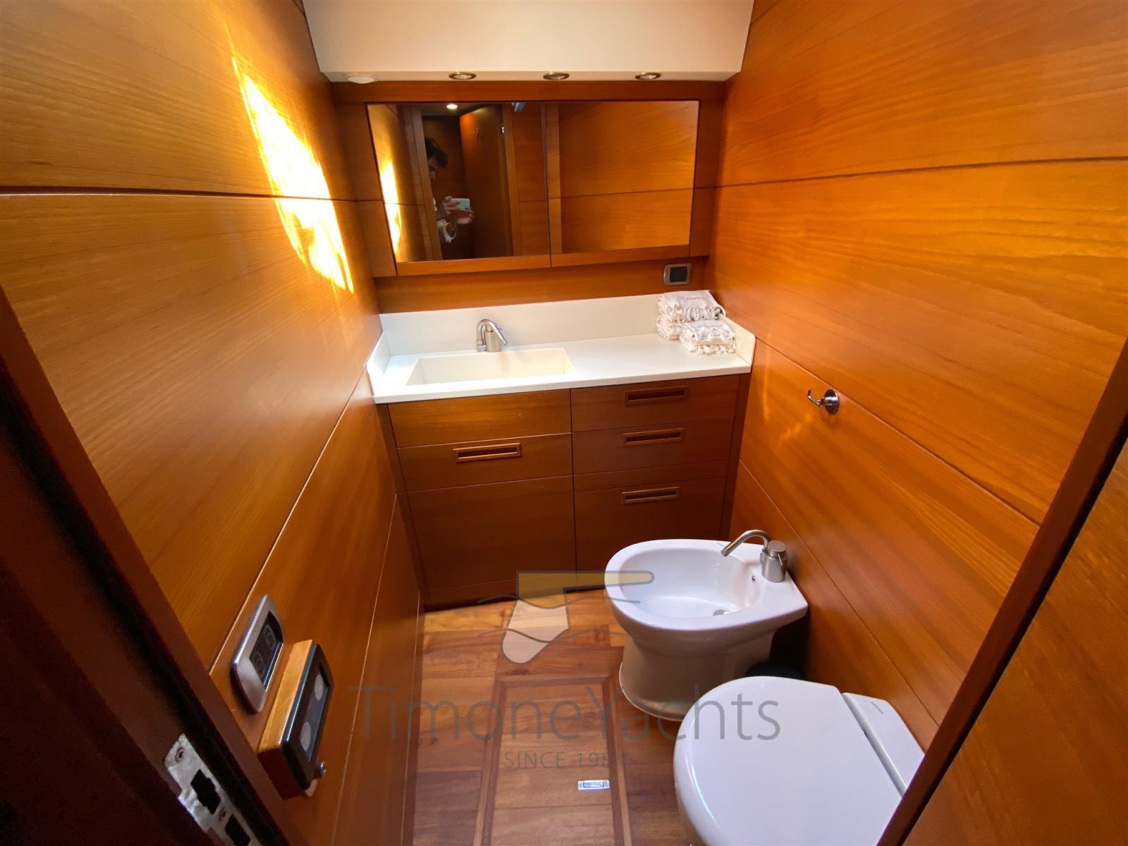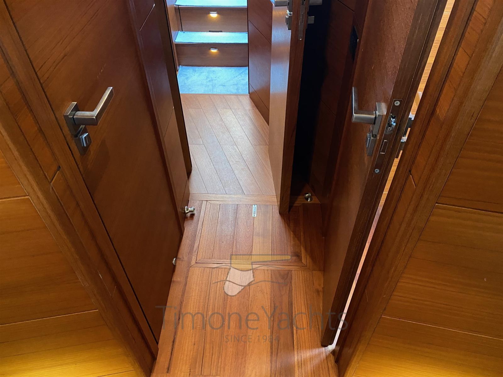 2 Engine Alarm, Bilge Alarm, Water pressure pump, Special Colour, Deck Shower, Twin Steering, Hydraulic Flaps, Fire Extinguishing System, Courtesy Lights, Gangway (elettroidraulica), Platform (con piano in teak), 5 Automatic Bilge Pump, Entry door, Teak Cockpit, Shorepower connector, Voltage Rectifier, Electric Windlass, swimming ladder, Horn.