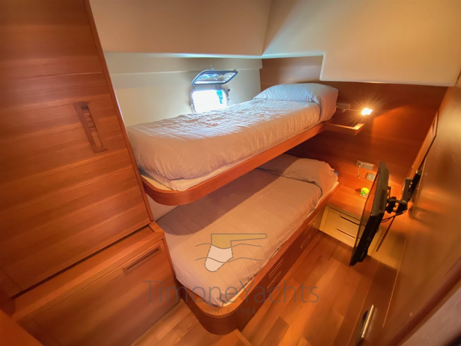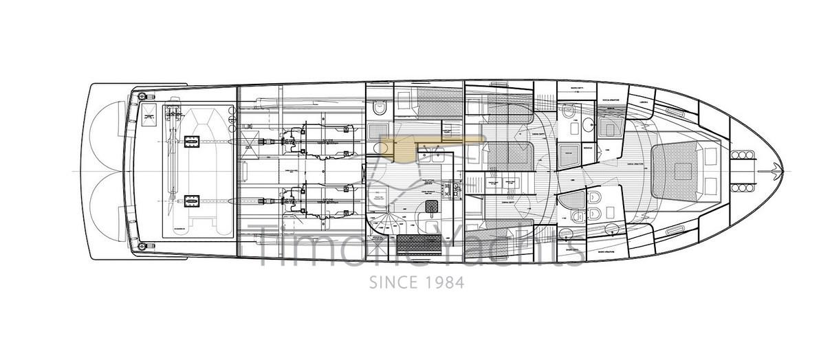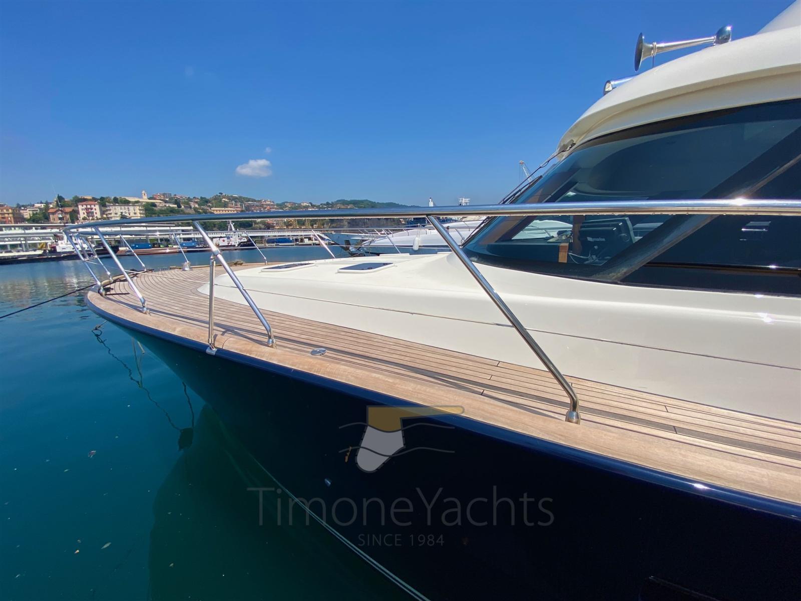 2 Engine Alarm, Bilge Alarm, Water pressure pump, Special Colour, Deck Shower, Twin Steering, Hydraulic Flaps, Fire Extinguishing System, Courtesy Lights, Gangway (elettroidraulica), Platform (con piano in teak), 5 Automatic Bilge Pump, Entry door, Teak Cockpit, Shorepower connector, Voltage Rectifier, Electric Windlass, swimming ladder, Horn.