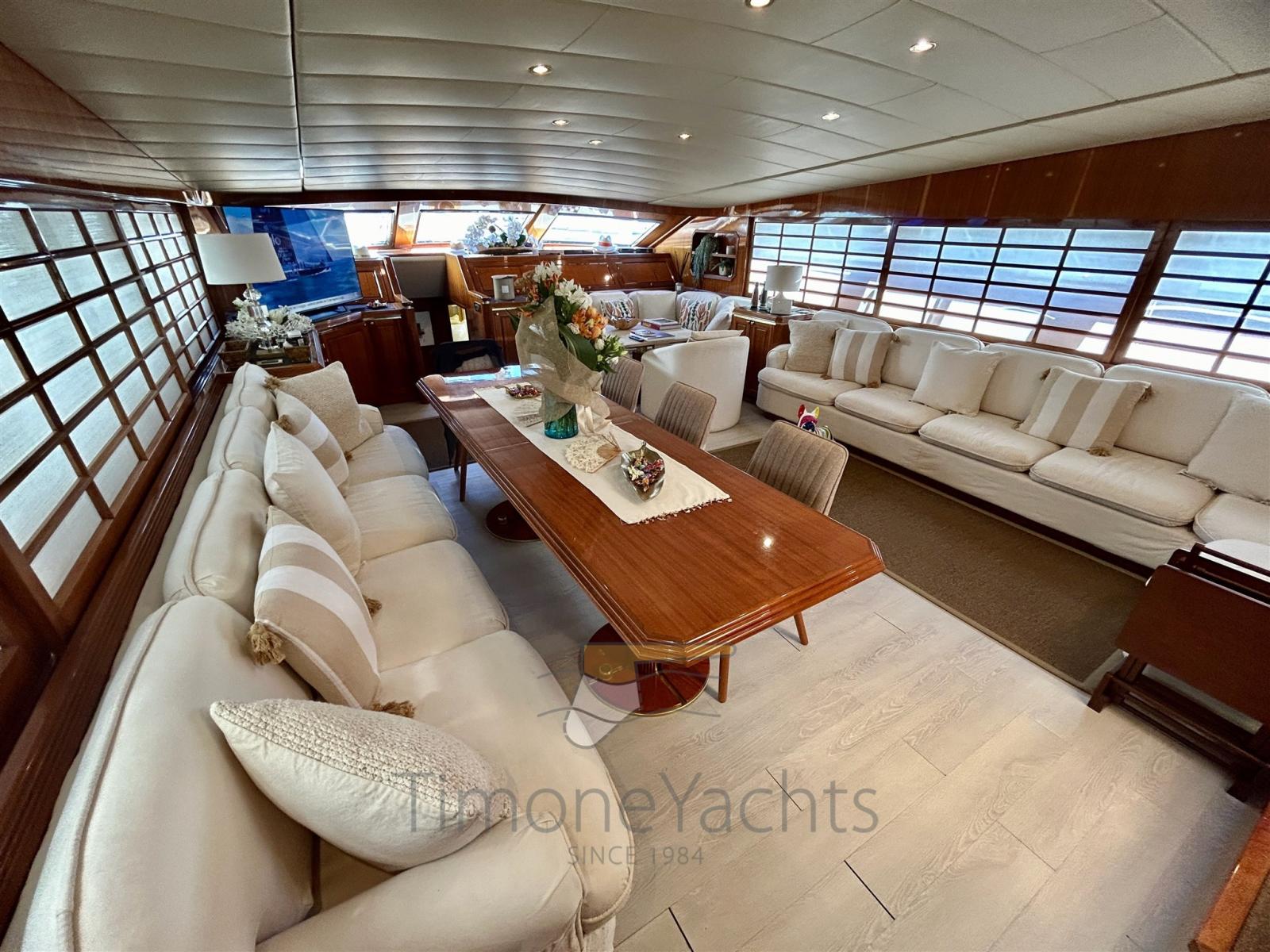 This 1995 Mangusta 92 is surprisingly still in her first Owner's hands. And during my inspection it was quite easy for me to understand why he kept the unit so long. We're in front of a pure open boat, with the bliss of stern sunpads and airy cockpit, naturally voted for entertaining in style right overwater. But yet the interiors benefits of the comfort that a large motoryacht can offer. The interior salon is lowered and reminds of the one coming (many) years later on the Mangusta 130.