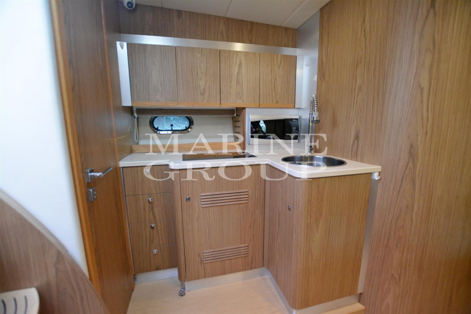Covered cockpit parquet, saloon and cabins; Large convertible dinette with "C" shaped sofa; Kitchen equipped with sink, fridge, microwave oven and electric hob; Owner's cabin in the bow with bathroom and separate shower cubicle; Guest cabin amidships on the left side with double bed; Guest cabin amidships on the right side with single beds that can be converted into a double; second bathroom with toilet and shower.