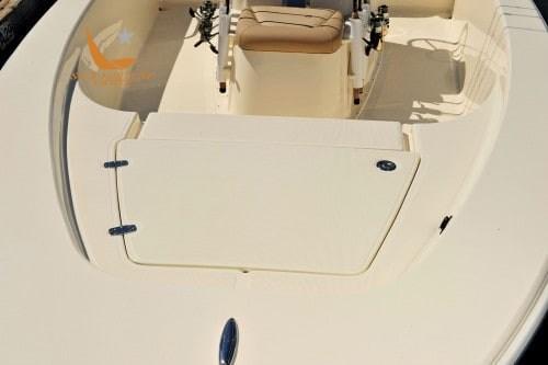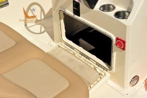 Other standard features include a built-in 20-gallon fuel tank, stainless steel wire rod holders, battery switch, and bilge pump.