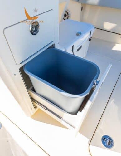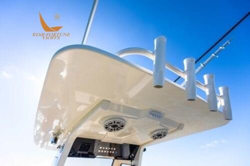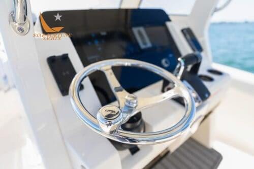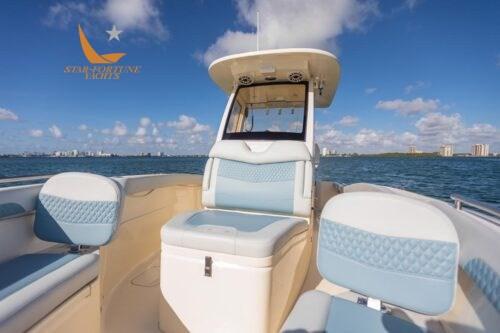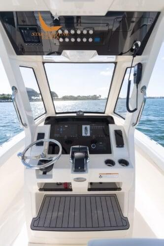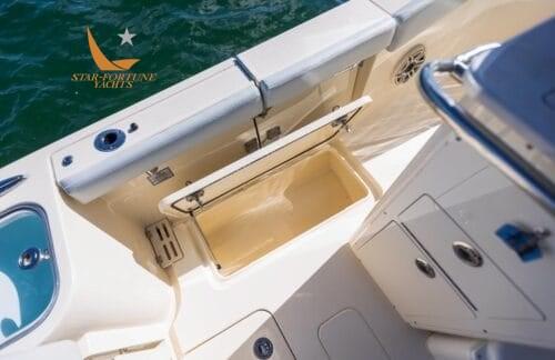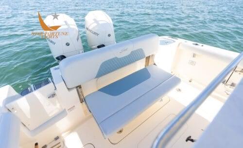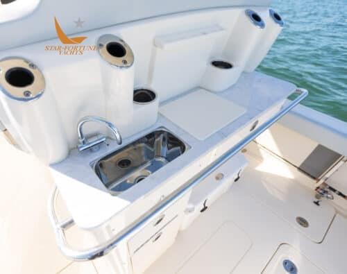 • Self-bailing cockpit • Stainless steel bow railing • Stainless steel spring cleats • (10) Cup holders • Transom passage door • Front seats with removable backrests/storage compartment • Front console seat cushion/storage compartment • Folding aft seat • LED courtesy lighting for cockpit • Fully walkable bathing platform with foam mat and ladder • Stainless steel side rail • Film Heat shrink • Stainless steel wire rod holders (6) • Rod compartment under gunwale (2) • Left and right floor fish tank with diaphragm pump • Aerated/recirculating bait tank left • Hinged door left • Sea Star hydraulic steering • Compass • 13.5" stainless steel steering wheel with finger grip and power knob • (2) Wireless phone charger • Integrated exposed carbon fiber T-top with windshield Fully enclosed, 2 safety lights and switch panel • Garmin 943 XSV display with GT12M transducer • Fiberglass base pole with bait prep station, sink, tool drawers and helm seats with folding stands and armrests • 45 qt YETI refrigerator • Dual battery switches with remote control • Raw water wash • Fresh water wash and anchor wash with 20 gallon tank •Fusion Bluetooth Stereo with (6) 7.7" JL speakers • Seakeeper Ride ship trim control system • Vertical winch with polished stainless steel anchor, roller, line and chain • Bow anchor camera • Console with internal access • USB/USB-C combo port and additional USB port