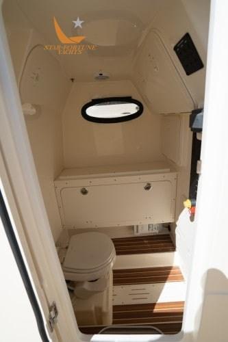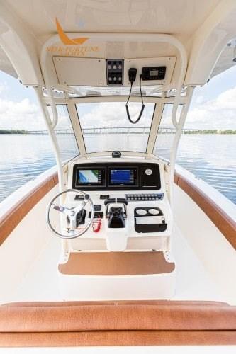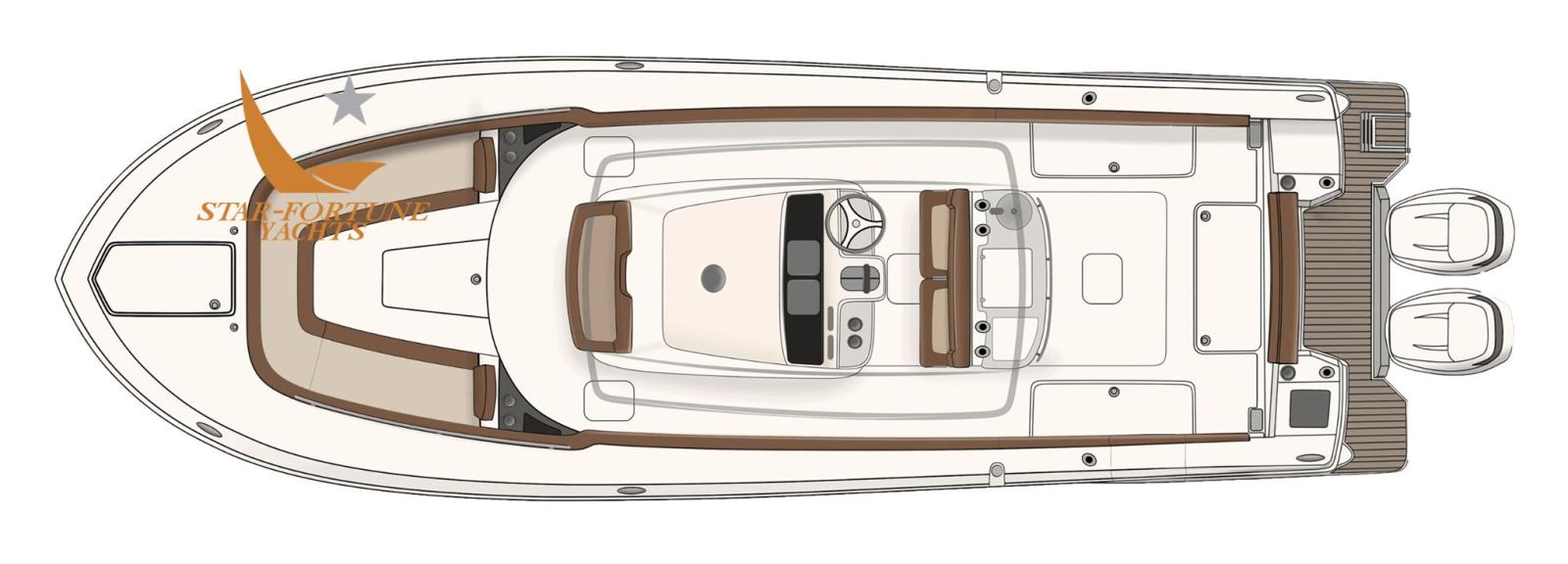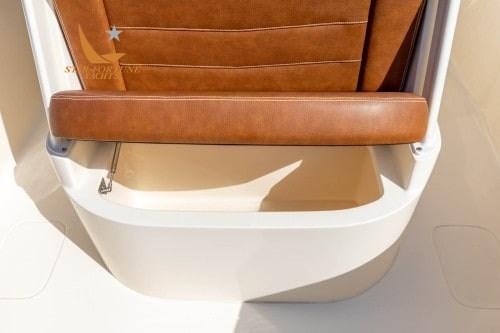 • Self-bailing cockpit • LED courtesy lighting for cockpit • Stainless steel spring cleats • Fully walkable swim platform with EVA foam mat • Front seats with removable backrests and under stowage • Integrated stern seat • Left/right floor fish tank with diaphragm pump • (4) Flush stainless steel fishing rod holders • Stern recirculating bait tank • Rod compartment under the foremast (3) • Battery charger • Fresh Water Anchor Wash • Vertical Winch with Stainless Steel Anchor Roller, Anchor Line, and Chain • Door on Left Side • Stainless Steel Grip Steering Wheel with Knob • Compass • Bluetooth Fusion Stereo with (4) 7.7" JL Audio Speakers • Garmin 943XS Display with GT12M HELM Transducer • Powder-Coated T-Top Hardtop with Integrated Frameless Windshield and Rocket® Launcher • Standard Leaning Post (with Fishing Station, folding helm chairs and Igloo refrigerator - unless YETI upgrade ordered • Full set of console cushions and cushion sets • Cushions for left and right front seats • USB/USB-C combo port and additional USB port • Navigation light • Power steering • Power steering included standard with engine package • Seakeeper Ride • Battery compartment • Service and starter batteries • Opening porthole • Step-Inside console.