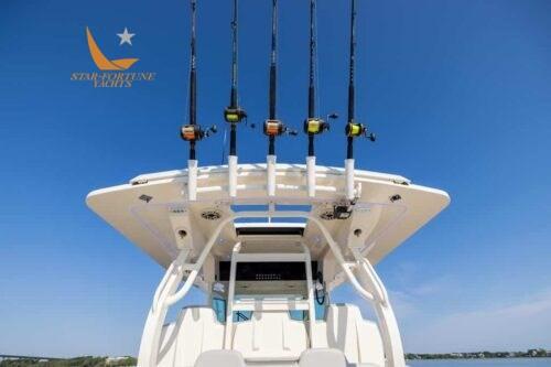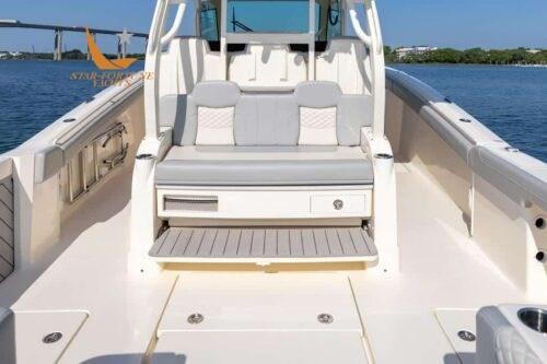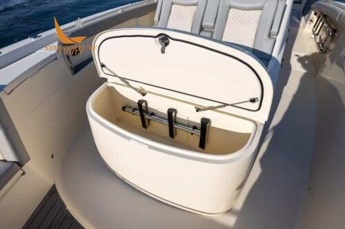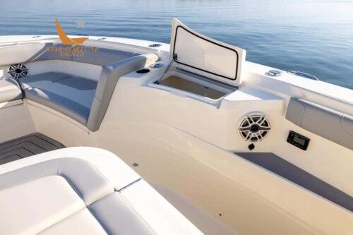 • Full 360-degree support cushions • LED-lit storage compartments and hatches • (8) flush cleats • (10) stainless steel foremast rod holders • 180-degree bow seats with port and right backrests and storage compartments • Bow console with double sundecks, contoured lounge with cushions, armrests and lower storage compartment • Cooler/storage compartments • Patented powder-coated hardtop with curved® glass latch • Sunroof access • (3) Captain's Helm Seats • Raised Aft-Facing Lounge Seat in Leaning Post with Clear Ice Maker, Drawer Refrigerator, or Tool Drawers • Amidships Technical Room • Left-Side Beach Platform • Floor-Mounted Fish Crates with Outboard Diaphragm Drain (92 gal each) • Acrylic Transom Access Door • Full Platform with Armstrong Underwater Ladder • (5) Rod Holders Flush with Mirror • Synthetic teak swim platform, transom door • Large aft seat with double hatch and aerated bait cockpits • Efficient double step hull infused with carbon fiber epoxy • Zipwakes • Self-bailing deck • 12,000 BTU air conditioner • One burner ceramic hob • Microwave • 32 inch LED TV with (2) speakers • Drawer refrigerator • Kitchen sink • Enclosed shower with toilet and sink in glass and mirror with vanity cabinet • Porthole with privacy curtain • Convertible double berth • Corian bunk table • Cabin storage (5) • LED lighting • 16 gallon drain tank with overboard drain • AC outlet in console and bunk • Anchor winch wash tube in bow • Lewmar winch with helm control and bow foot switches • Anchor, Lewmar stainless steel chain (40 feet) and line (300 feet) • Bow anchor camera • Wiper and fresh water wash • Navigation lights • Richie magnetic compass • LED courtesy lighting with dimming under the hardtop • Hot water • Heated helm seats • Seakeeper 3 DC version (includes additional 100 amp charger) • Service and starter batteries.