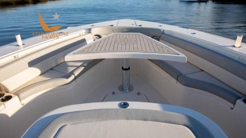 • LED-lit storage compartments and hatches • (8) Flush cleats with retractable mounting • (10) Stainless steel flush rod holders • (4) Phender Pro - (4) receivers and (4) pins • Stainless steel Edson steering wheel • Bow bench with storage and storage compartment • Bow sundeck dry storage box • Front storage compartments with storage and storage compartment with charging station • Patented powder-coated hardtop with curved® glass latch • Access hatch to hardtop • (3) captain's helm seats and second row seats • Systems room below deck aft • Floor fish compartments left and right with overboard diaphragm exhaust (92 gal. each) • Complete aft deck with Armstrong diving ladder • Synthetic Teak swim platform, aft door, bow table, rudder step and rudder footrest • Efficient carbon fiber, epoxy-infused double-step hull • Zipwakes • 8 kW generator with 26-gallon diesel tank • CZONE digital switching • (3) Garmin 8616 screens with WIFI capability • Fusion head unit with Bluetooth capability - (10) JL Audio 7.7" speakers - (2) JL Audio 8.8" speakers - (2) JL Audio MC amplifiers - (1) JL Audio 10" subwoofer • AM/FM antenna mounted on the hardtop • 12V plug, USB connection • 50-foot 50A Glendinning shore power cord coil • AC outlet in sloping pillar • (1) front and (2) rear LED lights in hardtop • AGM batteries for services and engines • 12,000 BTU air conditioning • One-burner ceramic glass cooktop • Microwave • 32-inch LED TV with speakers • Drawer refrigerator • Kitchen sink • Enclosed shower area • Area with Full size toilet and hot/cold sink • Porthole on the left and right side with privacy curtain • Seating area with convertible bunk • LED lighting • 18 gallon drain tank with overboard drain • 545 gallon fuel tank • Bow anchor winch wash hose • Lewmar winch with helm control and bow foot switches • Anchor, Lewmar stainless steel chain (40 feet) and line (300 feet) • Bow anchor camera • Electronic bow table with cushion filler • Water heater • Wiper and fresh water wash (66 gallons) • Retractable fresh water and raw water hoses in hardtop • Navigation lights • Richie magnetic compass • Horn • LED vanity lighting with dimming • Heated helm seats in the bow and second row seats • Stabilizer system gyroscopic Seakeeper 4.5 • Foldable stern seat with split bait tub and transom passage door • - Electrically operated fiberglass drawer refrigerator • Summer kitchen with grill, sink and cutting board • Swivel bar stools • Standard Hydraulic platform on the side