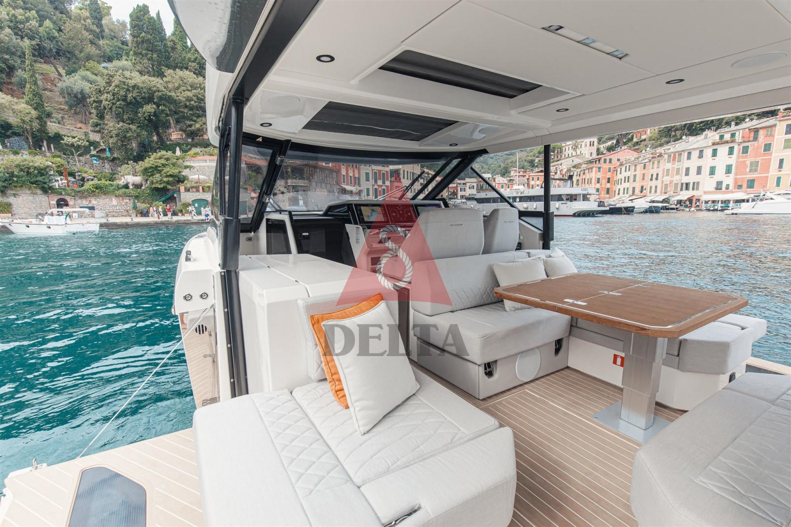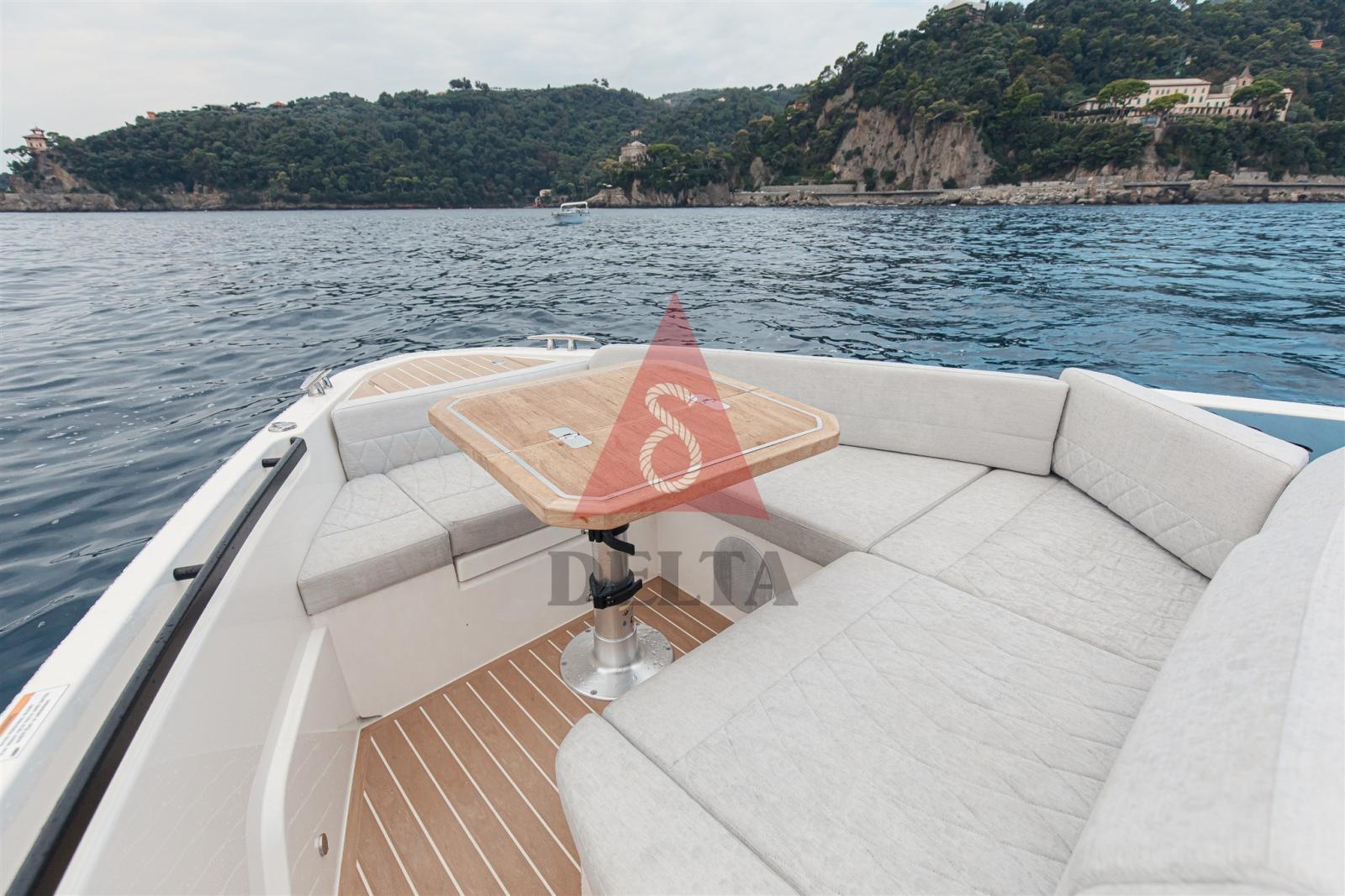 Vacuum-infused hull - gelcoat RAL 9010 (white) - Electrically sliding canvas roof - Icebox integrated in the aft deck - Cup holders - Wiper - Terraces that can be opened on both sides (almost 4 meters long)