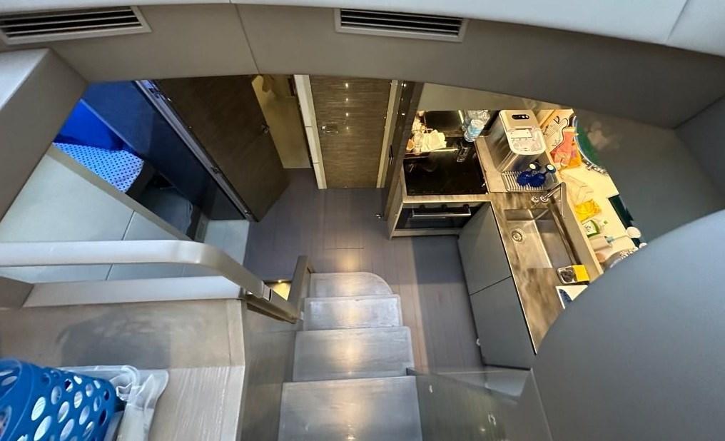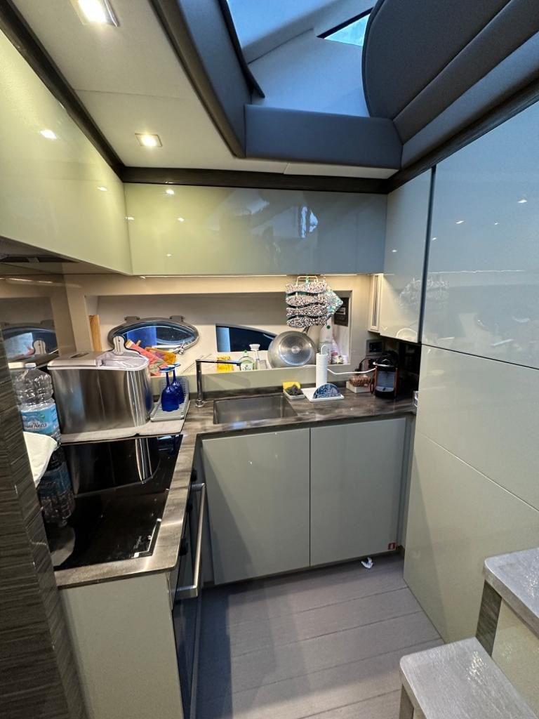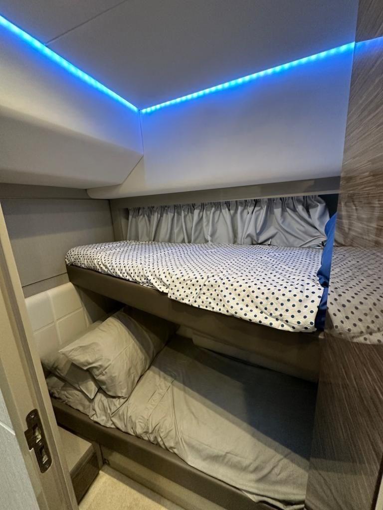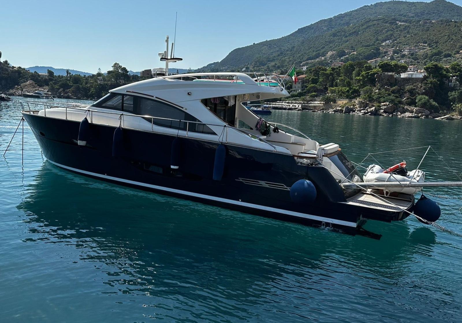 Engine Alarm, Bilge Alarm, Water pressure pump, Teak Side Decks, Special Colour (SCAFO BLU), Deck Shower (PRUA E POPPA), Directional Spotlight, Electric Flaps, Hard top, Fire Extinguishing System, Flaps Indicators, Courtesy Lights, Gangway (OPACMARE IDRAULICA A SCOMPARSA), Platform, Automatic Bilge Pump, Manual Bilge Pump, Entry door, Teak Cockpit, Shorepower connector, Water harbor connector system, Electric Windlass, swimming ladder (OPACMARE IDRAULICA A SCOMPARSA), Saddles for tender, cockpit table, guard rails with gates, Horn, Stern Winches.