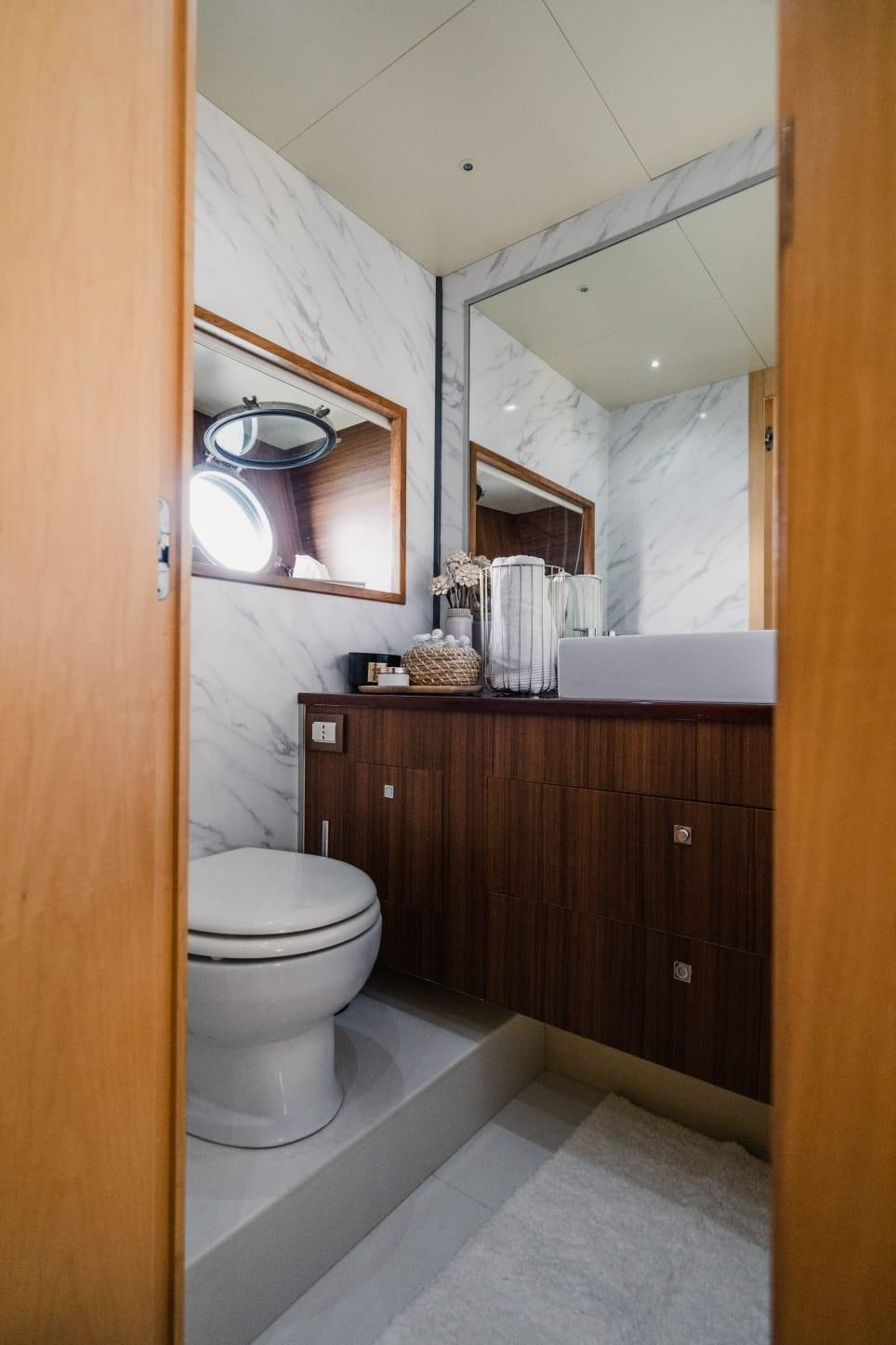 Engine Alarm, Bilge Alarm, Water pressure pump, Teak Side Decks, Special Colour, Deck Shower, Hydraulic Flaps, Tender Garage, Hard top, Fire Extinguishing System, Flaps Indicators, Courtesy Lights, Gangway, Platform (Abbattibile), Automatic Bilge Pump, Manual Bilge Pump, Entry door, Side door, Teak Cockpit, Shorepower connector, Voltage Rectifier, Electric Windlass, cockpit table, Living Room Foldable Table, guard rails with gates, Horn, Stern Winches.