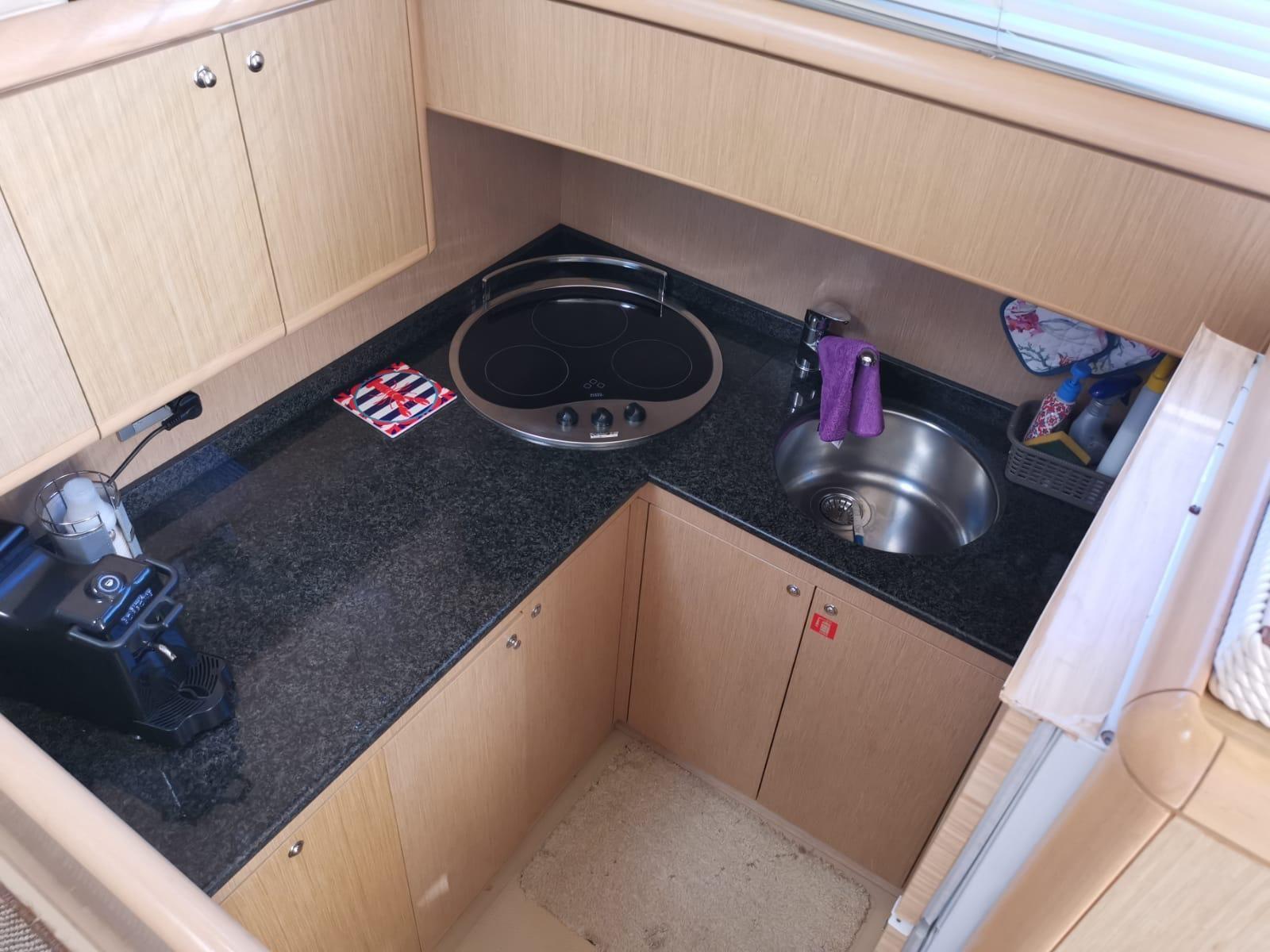 Galley, Deck Refrigerator, Dishwasher, Ceramic hot plate.