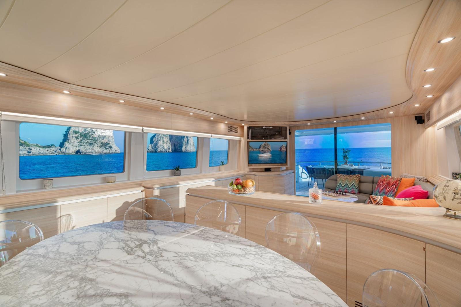 Fume/Gas Detector, Engine Alarm, Bilge Alarm, Alternator, Water pressure pump, Teak Side Decks, Special Colour, Deck Shower, Hydraulic Flaps, Tender Garage, Tender Crane, Fire Extinguishing System, Anchor Chain Washdown, Courtesy Lights, Underwater lights, Gangway (IRAULICA), Automatic Bilge Pump, Manual Bilge Pump, Teak deck, Entry door, Side door, Teak Cockpit, Shorepower connector, Water harbor connector system, Voltage Rectifier, Rollbar, 2 Hydraulic Windlass, swimming ladder, Stabilizers, cockpit table, Tender, guard rails with gates, Winch Hydraulic, Stern Winches, Bow Winches.