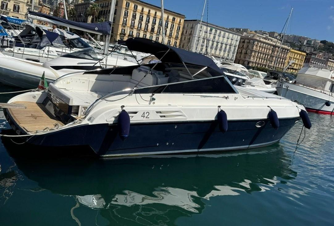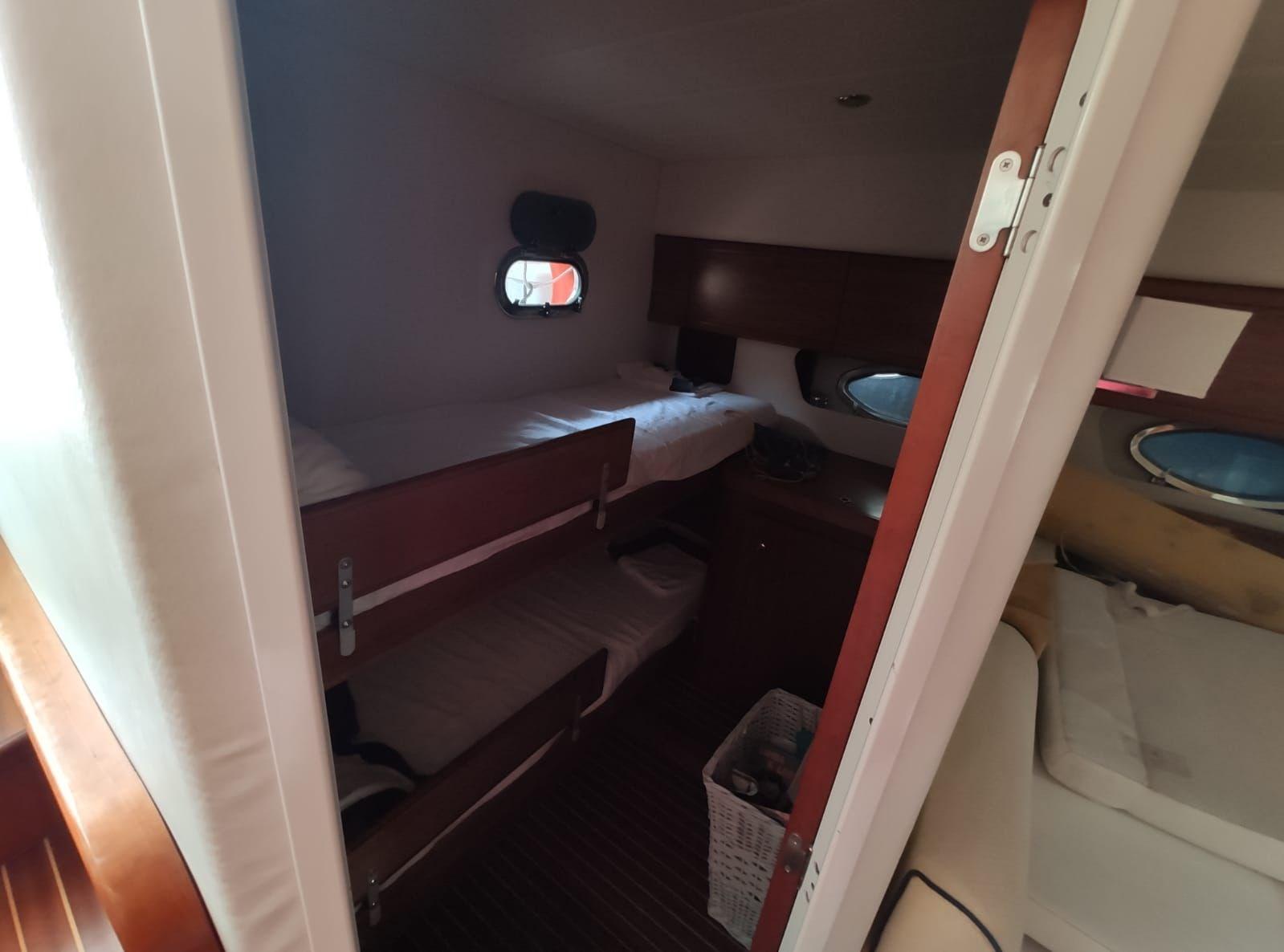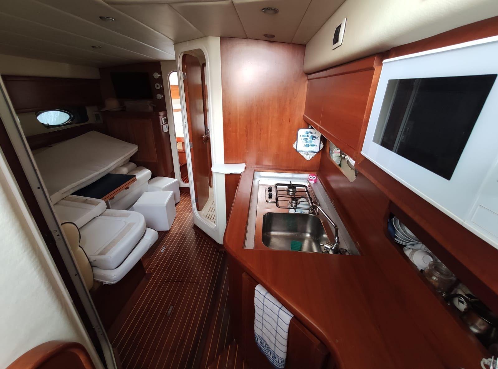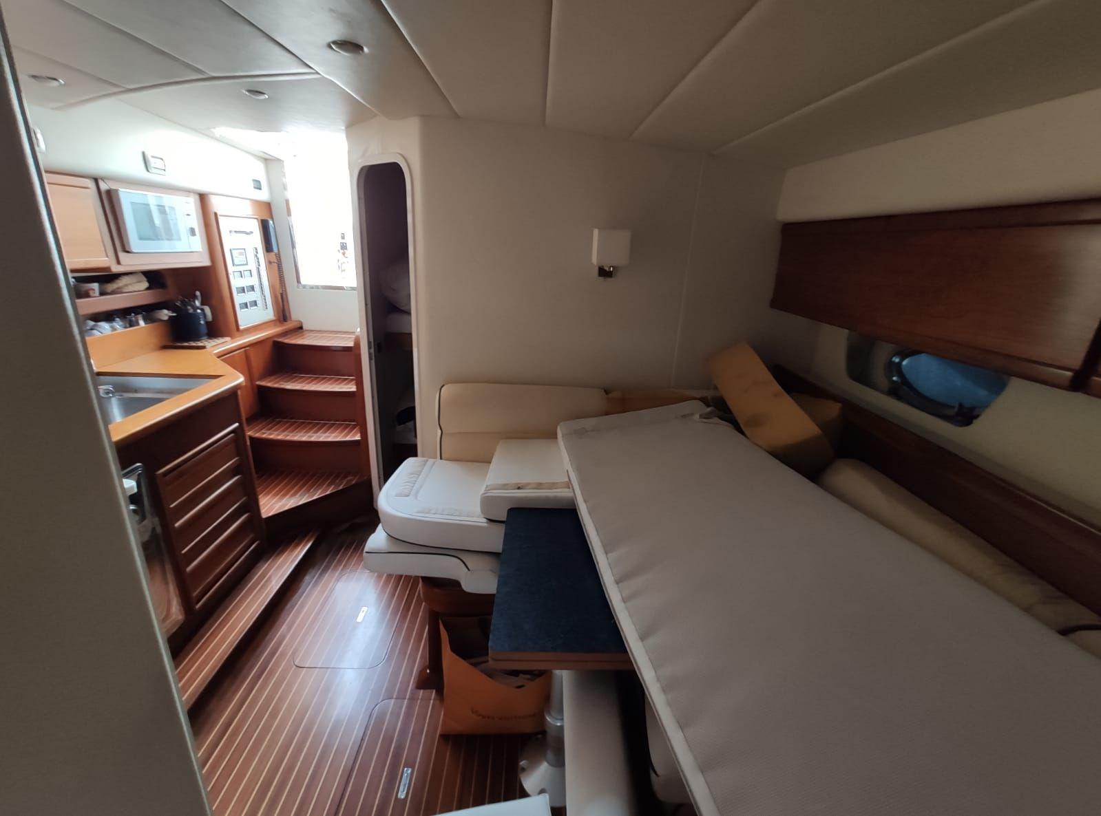 Engine Alarm, Bilge Alarm, Alternator, Water pressure pump, Deck Shower, Hydraulic Flaps, Fire Extinguishing System, Courtesy Lights, Gangway (IDRAULICA), Platform, Automatic Bilge Pump, Manual Bilge Pump, Teak Cockpit, Shorepower connector, Electric Windlass, cockpit table, Living Room Foldable Table, Horn.