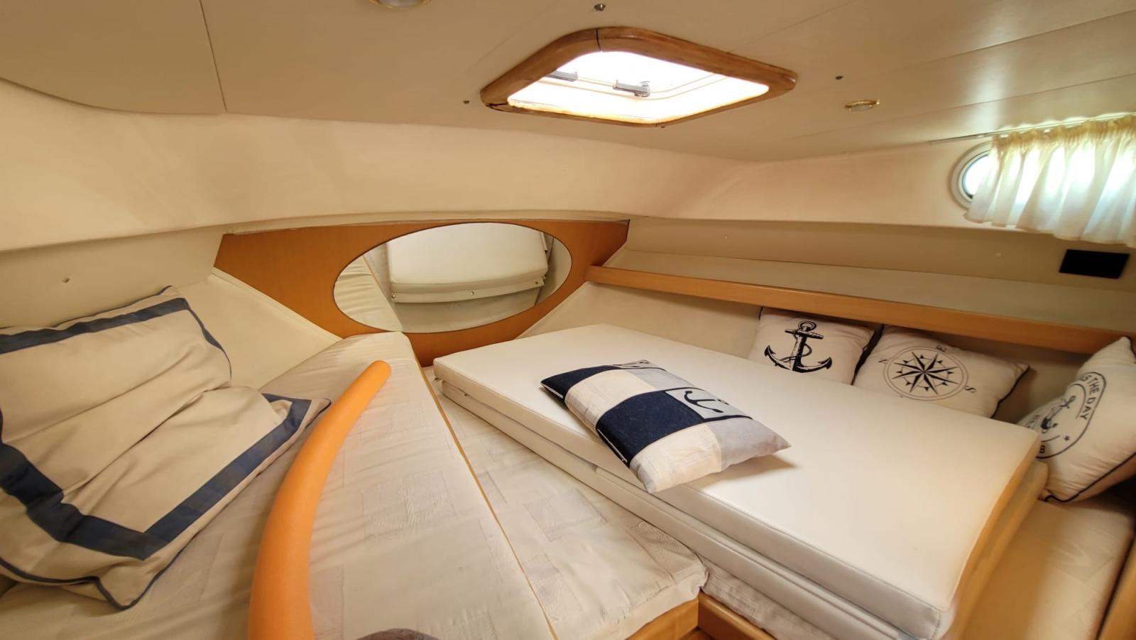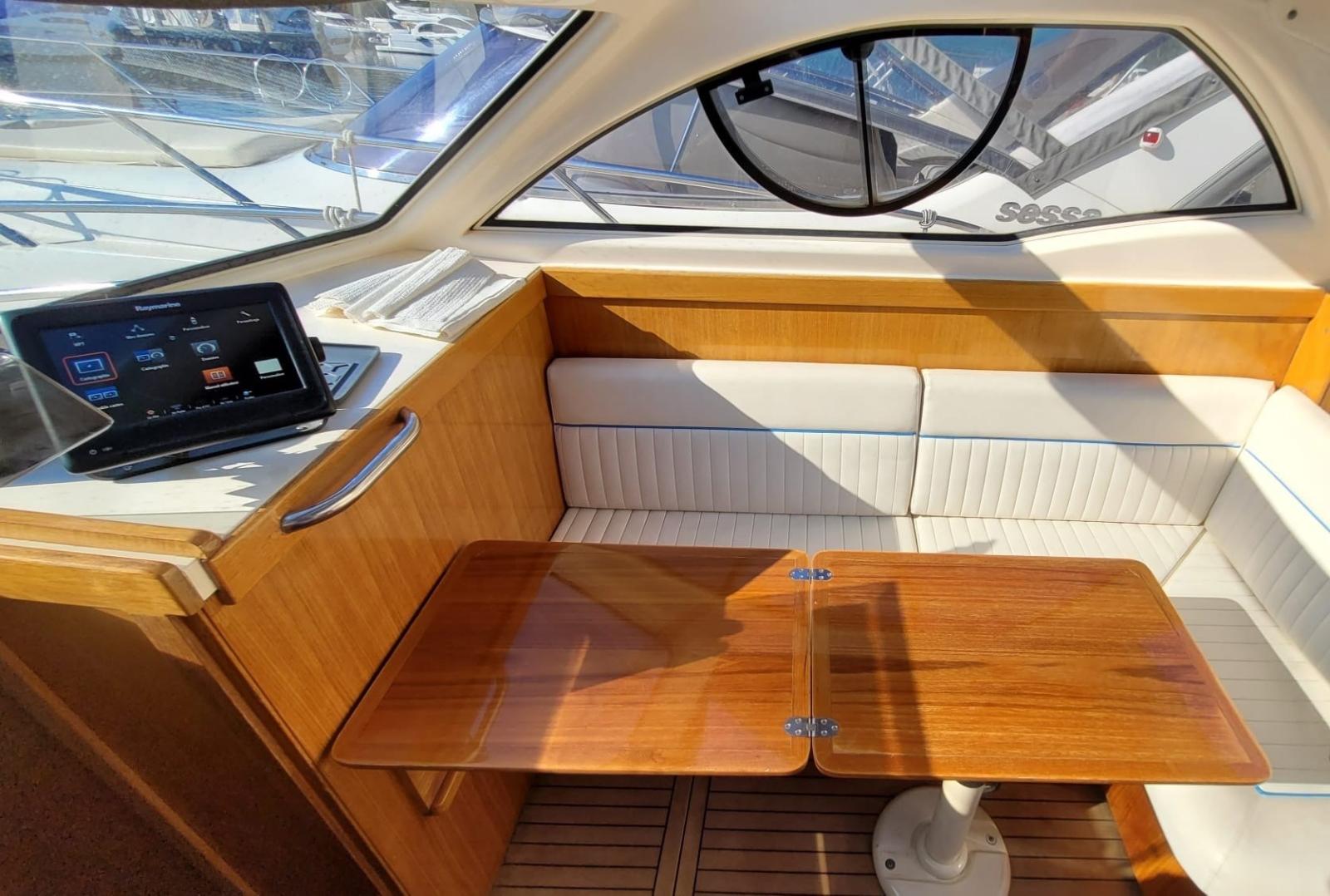 Engine Alarm, Bilge Alarm, Water pressure pump, Special Colour (SCAFO BLU), Deck Shower, Hydraulic Flaps, Fire Extinguishing System, Flaps Indicators, Anchor Chain Washdown, Washbasin in the cockpit, Courtesy Lights, Platform, Automatic Bilge Pump, Manual Bilge Pump, Entry door, Teak Cockpit, Shorepower connector, Rollbar, Electric Windlass, swimming ladder, cockpit table, guard rails with gates, Horn.