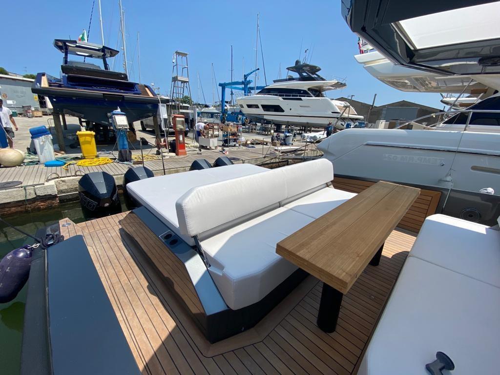 Awning for foredeck sunbathing area with n. 4 removable carbon poles Awning for aft sunbathing and dining area with n. 2 removable carbon poles Waterproof cover for conseole, seating and sunbeds