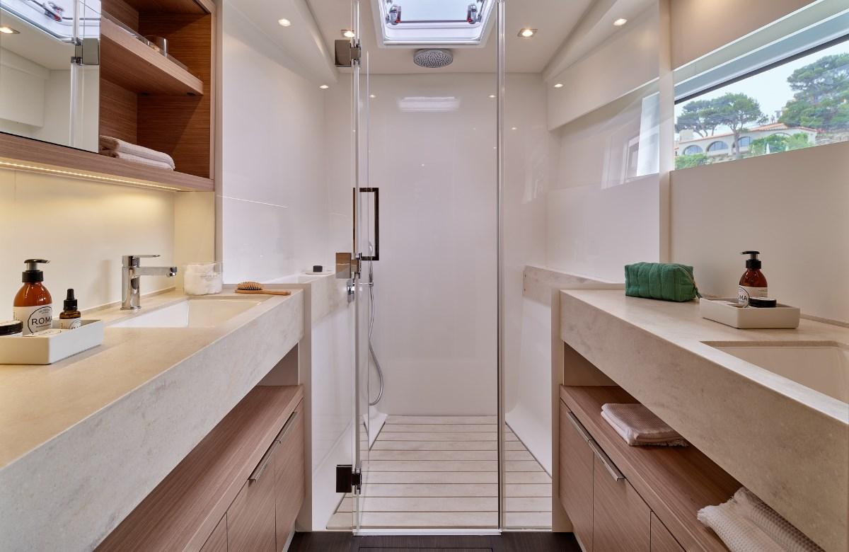 For the Lagoon 51, already equipped with walkable solar panels even in the standard version, it allows a further addition of XXL solar panels on the deckhouse. This technology provides over 3400 watts of power to run all onboard services. The new Lagoon 51 is therefore completely autonomous (except for air conditioning). The solar panels integrate perfectly into the lines of the catamaran and do not disturb life on board. The flybridge and sundecks on the deckhouse are accessible and usable both in the presence and absence of solar panels.