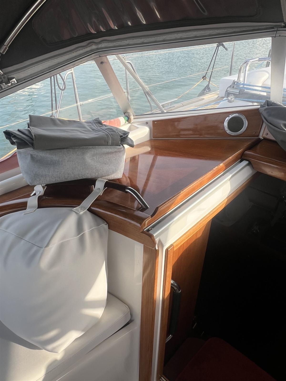 Bimini with new 30mm steel structure (2023); Spryhood(2023); teak cockpit table with lamp