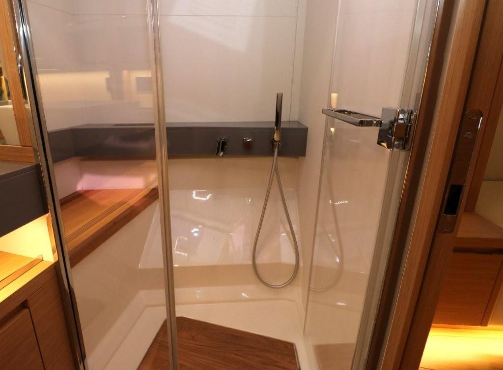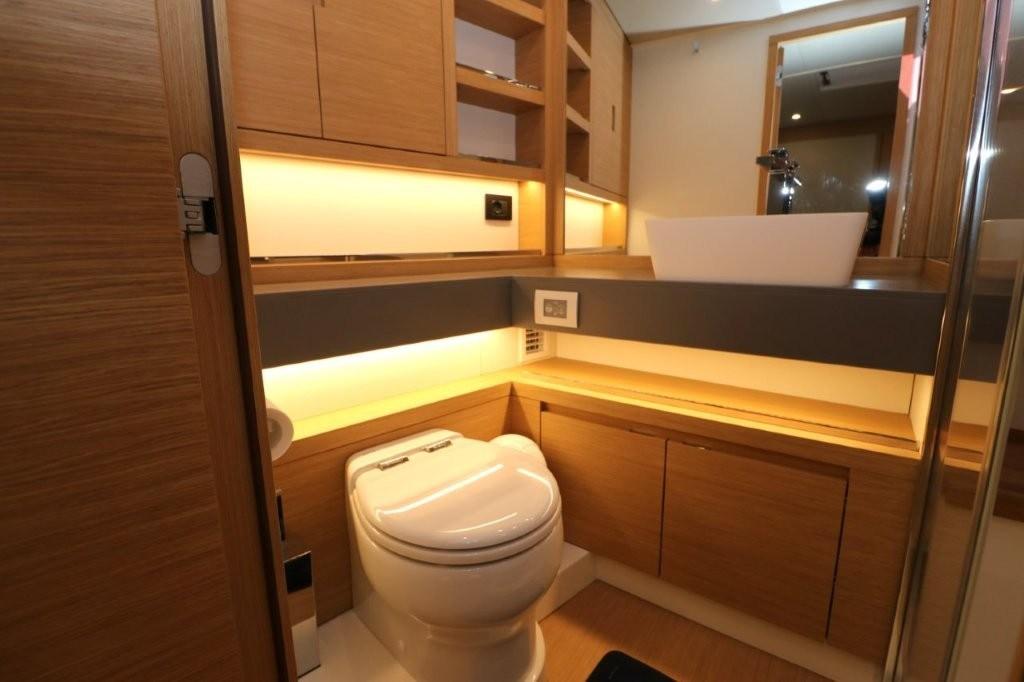 Interior design finishes package (solid teak shower seat benches and benches, grey technical marble washbasin tops, teak bathroom floors, bulkhead upholstery)