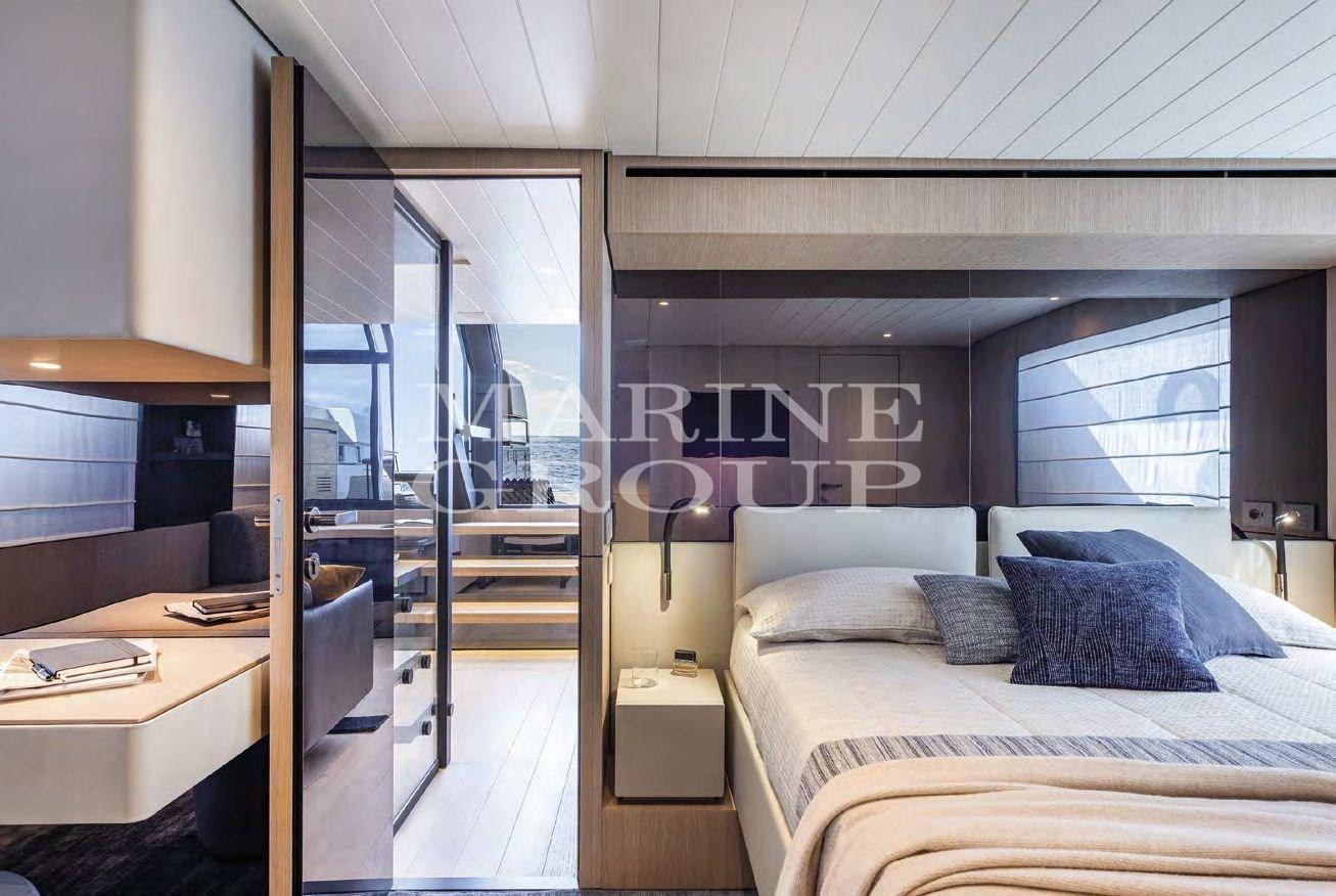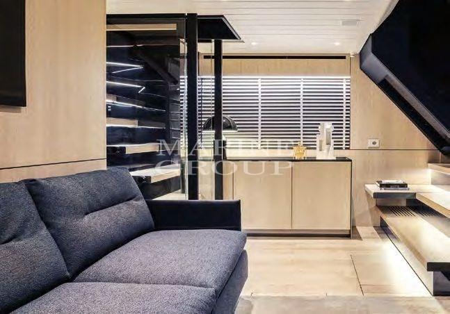 Bright, rational and extremely spacious interiors; High quality finishes with refined materials even in hidden points; Sliding windows lead to the bright saloon on the lower deck with hull windows, sofa bed and retractable TV; Spacious, well-organized and fully equipped kitchen and large living area; superyacht master cabin with full ensuite bathroom; VIP cabin forward on the lower deck equipped with absolute privacy complete with private bathroom; guest cabin with single "L" beds; Crew cabin in the bow with single bed and full toilet.