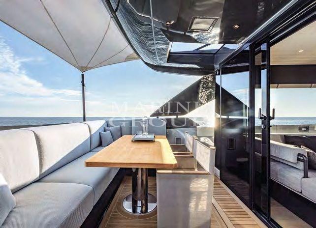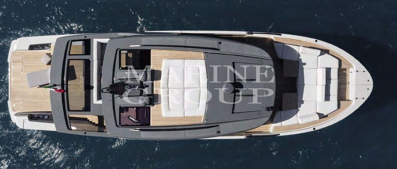 Electric Engine Compartment Opening, Auto Dynamic Trim Interceptor, Teak Side Decks, Deck Shower (a poppa), Twin Steering, Directional Spotlight, Tender Crane (a scomparsa), Washbasin in the cockpit, Courtesy Lights (camminamenti laterali e pozzetto), Underwater lights, Gangway, Entry door, Side door, Teak Cockpit, Shorepower connector, Water harbor connector system, 2 Electric Windlass, swimming ladder, Saddles for tender, Stabilizers (Giroscopico Seakeeper), cockpit table, Tender, Horn, T-Top, Teak Deckhouse, 2 Stern Winches.