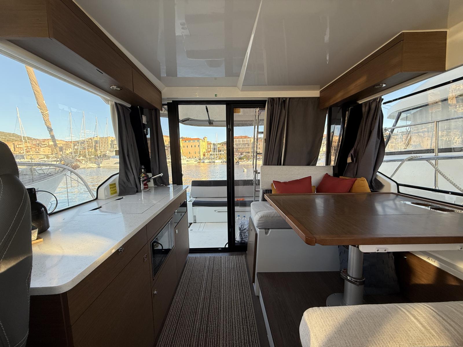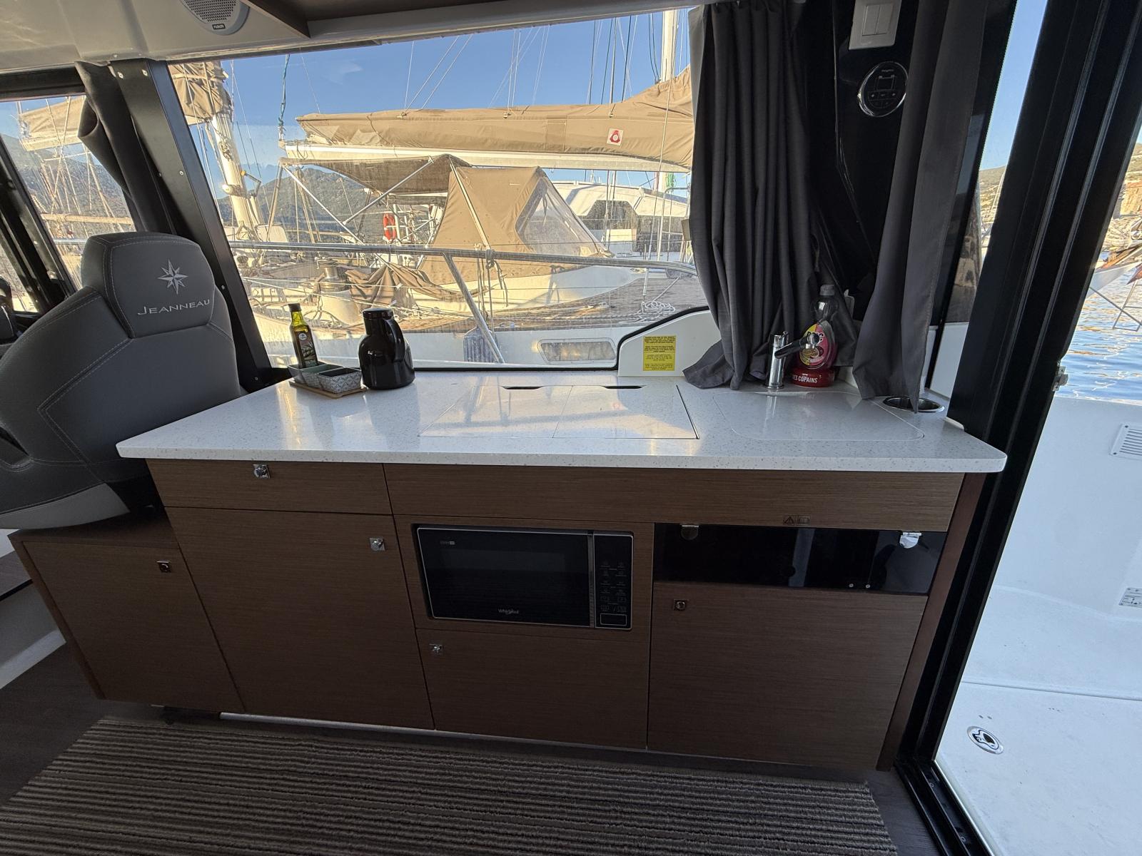 • Fully equipped galley (fridge, 2-burner gas stove, microwave, and plenty of storage).
