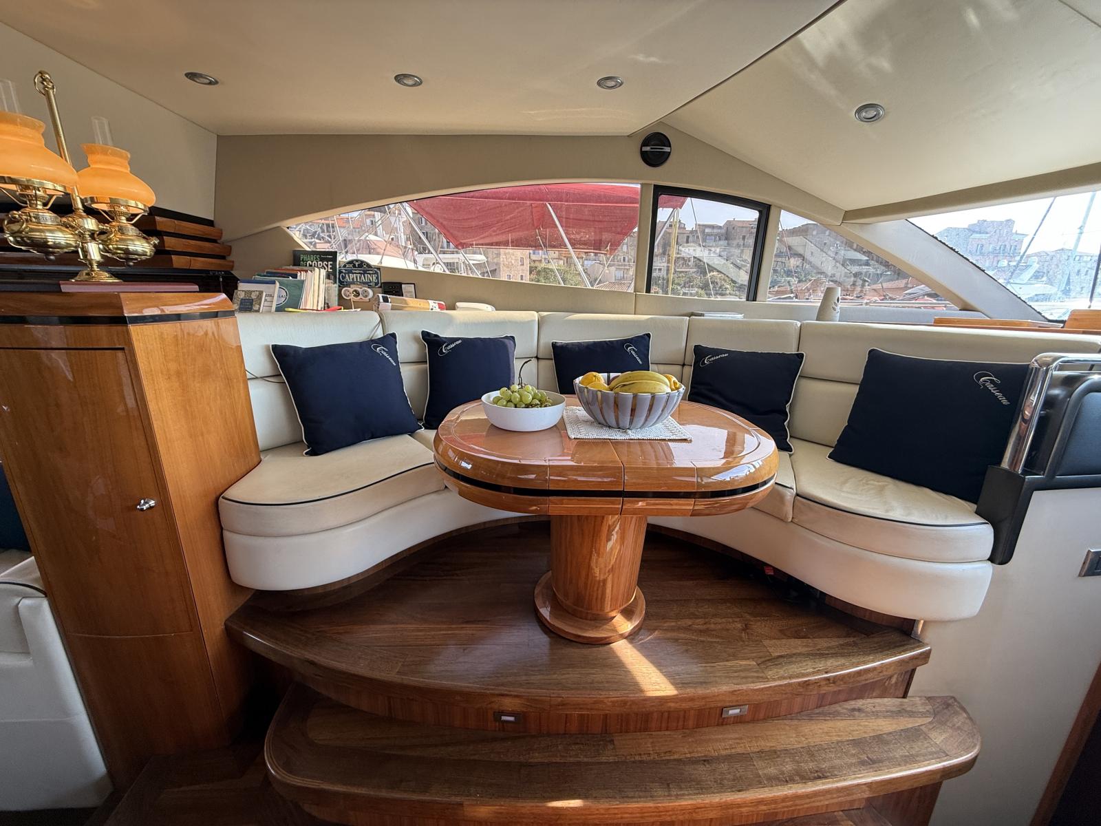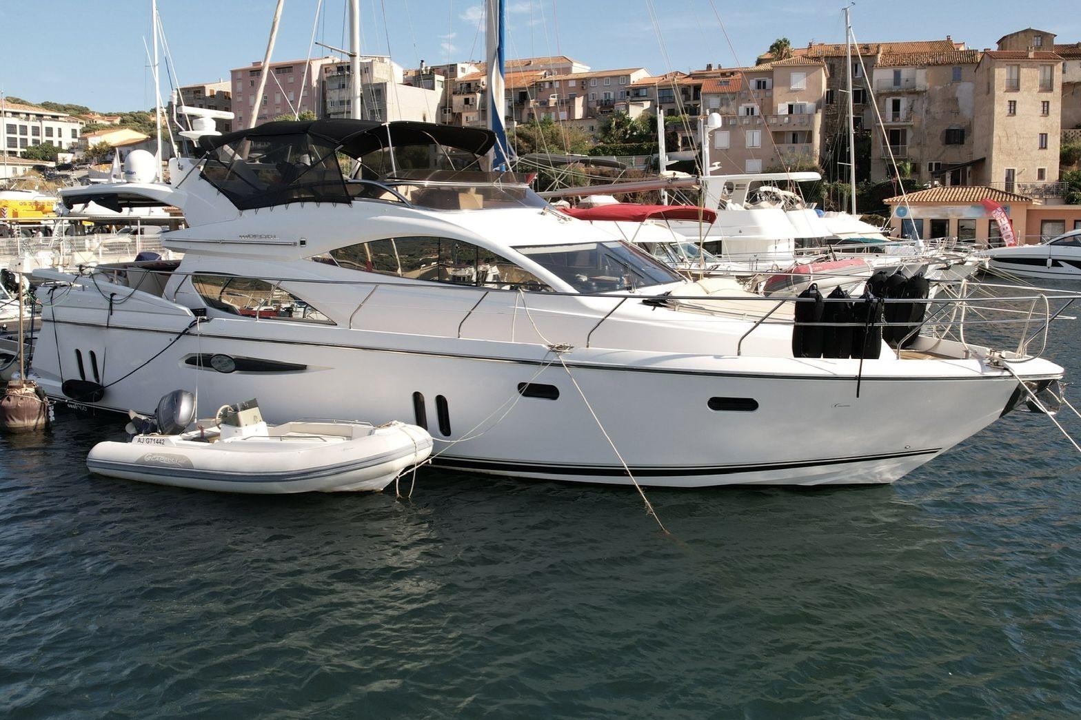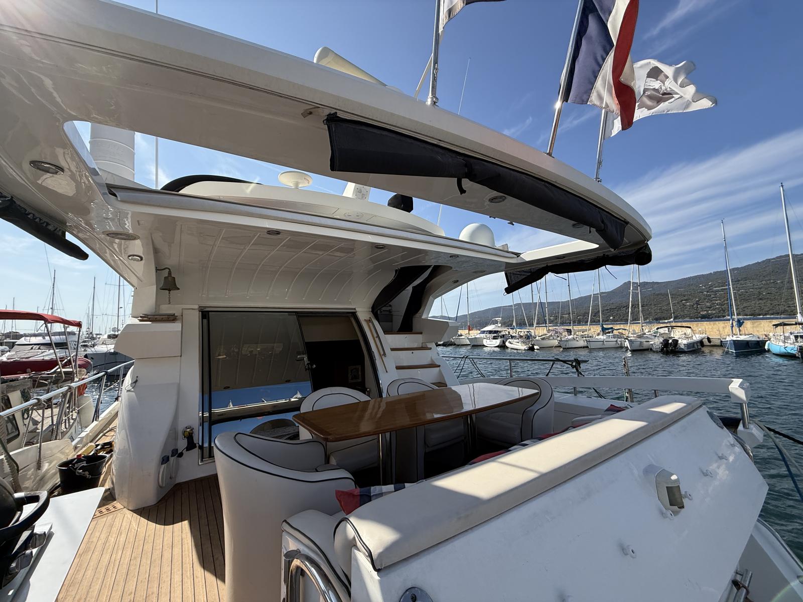 Exteriorly, the yacht offers a spacious flybridge with a dining area and sunbathing areas, a convivial aft deck protected by a large electric hardtop, and a hydraulic swim platform ideal for water sports.