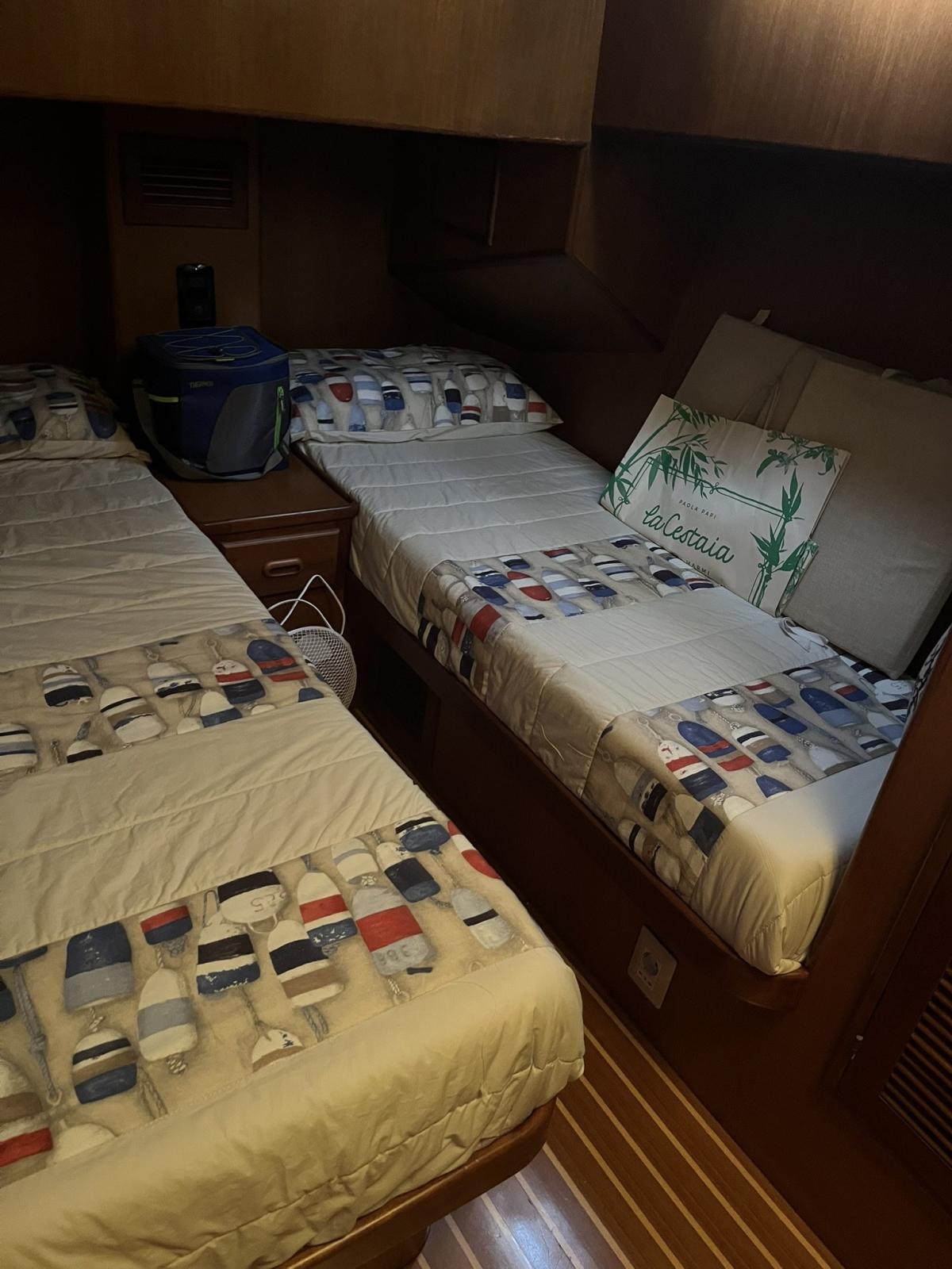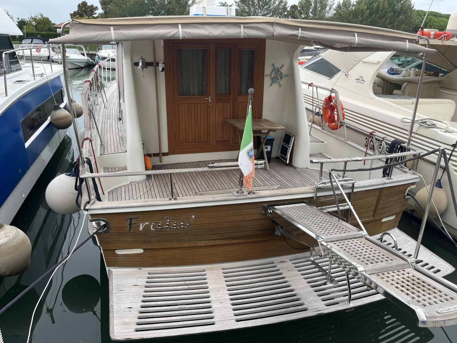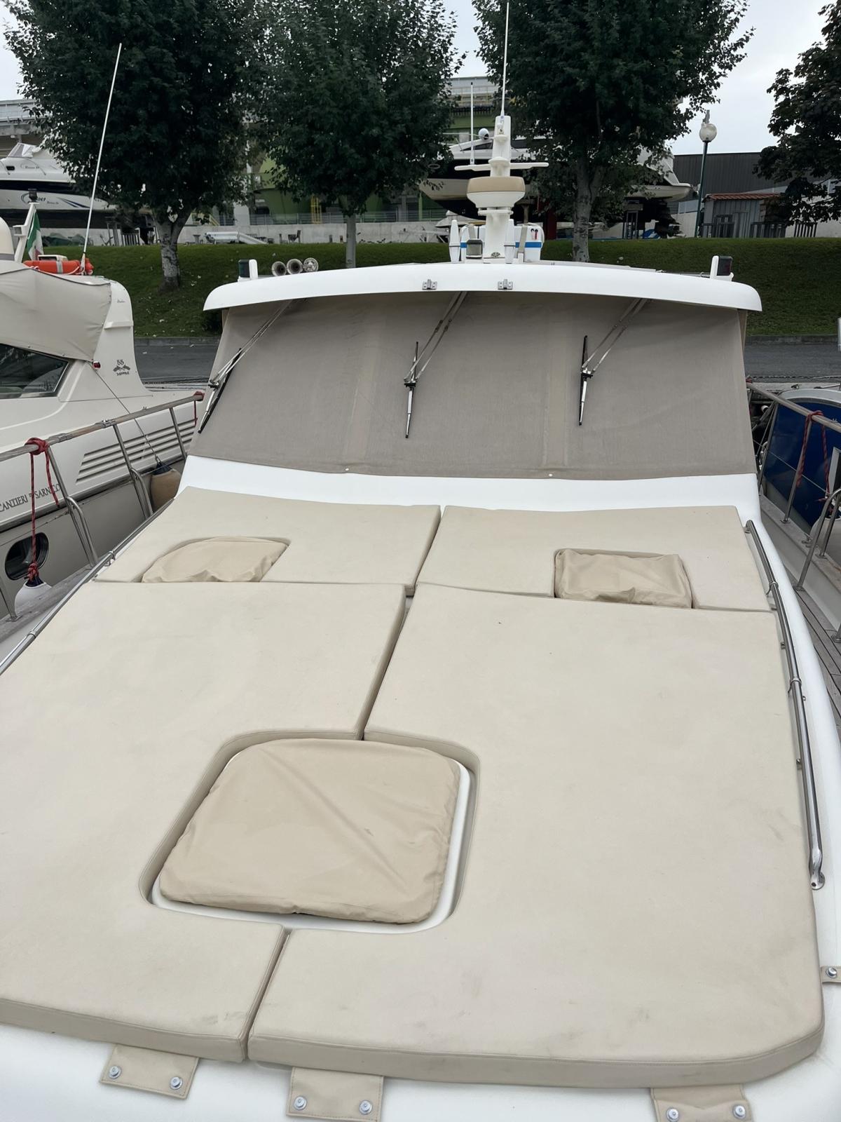 The boat was extensively refitted in 2021 and scrupulously maintained to this day. The main works were: Completely redone electrical system with new cables, electrical sockets, Victron chargers, battery switches, fuse holders, differentials, galvanic isolators, Victron inverters, alarm sensors, Victron Digital Multi Control and Victron 4 combined management system with color screen on the dashboard and remote control. New service batteries, engines and AGM 220 Victron bow thruster. Installation of 2 solar panels. New VHF system and antenna Installation of 2 internet antennas and wireless modem Added a Raymarine E120 GPS bought used New Jabsco autoclave New kitchen, bathroom and cockpit shower taps New navigation lights New bilge manual pump New pipes and hydraulic power unit gangway New side smoked glass and dinette door and side doors repainted. Many of the internal wooden panels have been redone and the cornices have been repainted Repainted The lockers Some ceilings have been redone All the portholes have been dismantled and resealed All the bulbs have been changed with LEDs and new cabin reading spotlights New boat name in steel Side and rear sunshades in shade cloth. Summer blinds for side and front dashboard windows. New sunbathing cushions New winch in cockpit New hob and microwave New bow water tank Cleaning of diesel tanks Replacement of seacocks Overhaul of alternator New air conditioning recirculation pumps Bulwark polishing done every year Cleaning of heat exchangers/intercoolers and overhaul of seawater pumps Replacement of diesel solenoid valves New drain pipes, solenoid valve and electric toilet pump.