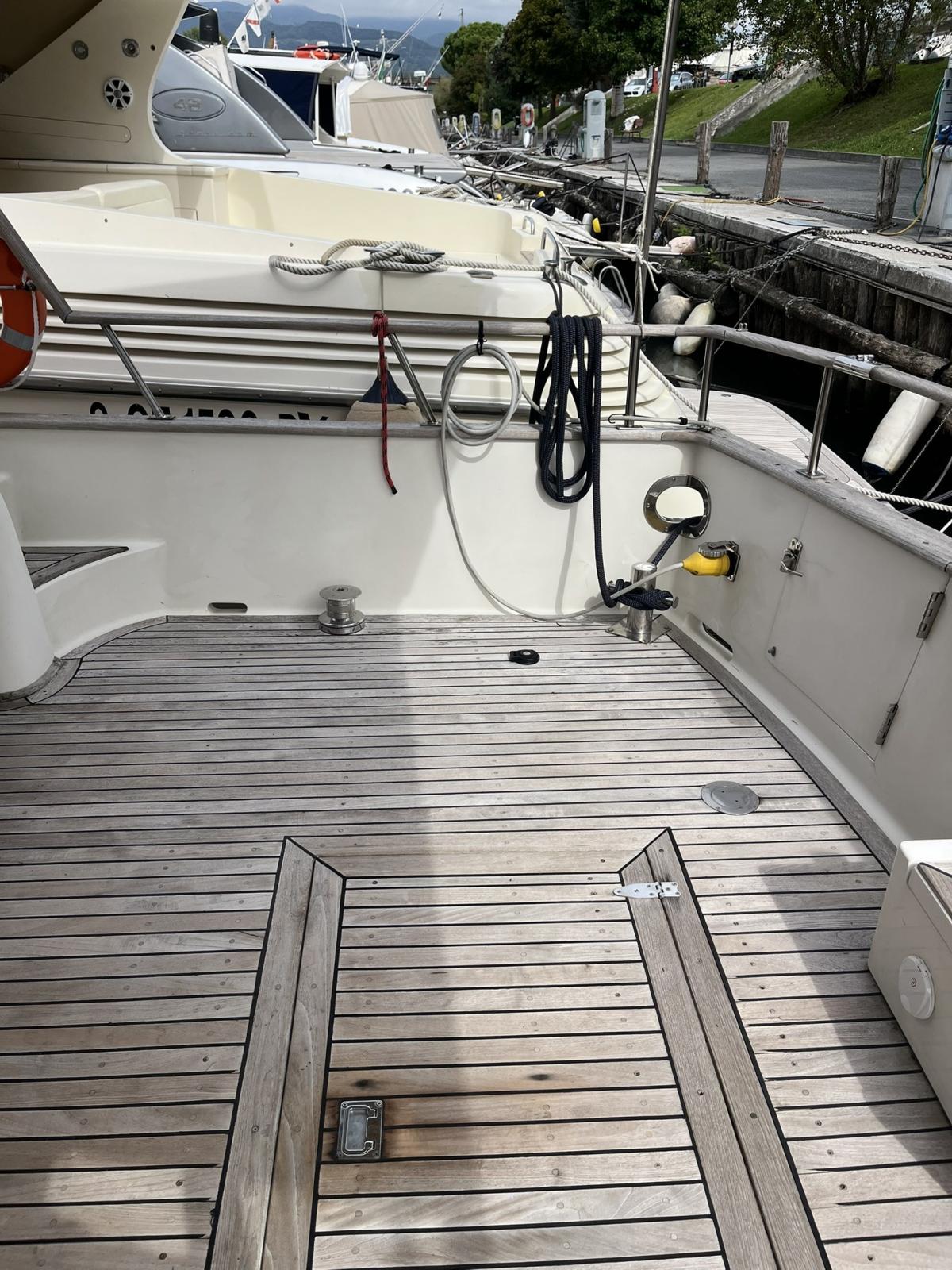 Equipment: Air conditioning in dinette and cabins, bow thruster, Mase 6kw generator, rudder angle, compass, electronic throttles, odometer, echo sounder, GPS, Radar on according to GPS, log, VHF radio, autoclave, electric Tecma marine toilet, external shower, bow thruster, double windlass control on the bridge and in the bow, hydraulic gangway, hydraulic flaps, fire extinguishing system in the engine room, Fire sensors, bilge water temperature and level, platform with swim ladder, automatic bilge pumps, side doors, cockpit and deck in teak, 220 dock socket, combined inverter system, battery charger, solar panels and Victron dock, electric anchor windlass with dual control, mooring winch at the stern, 220 internal sockets in each room, stereo and speakers, gas cooker, microwave, fridge, side and rear shading in the cockpit, summer and winter side windows and dashboard blackouts, cockpit cover awning, tender and Honda 2.3 engine