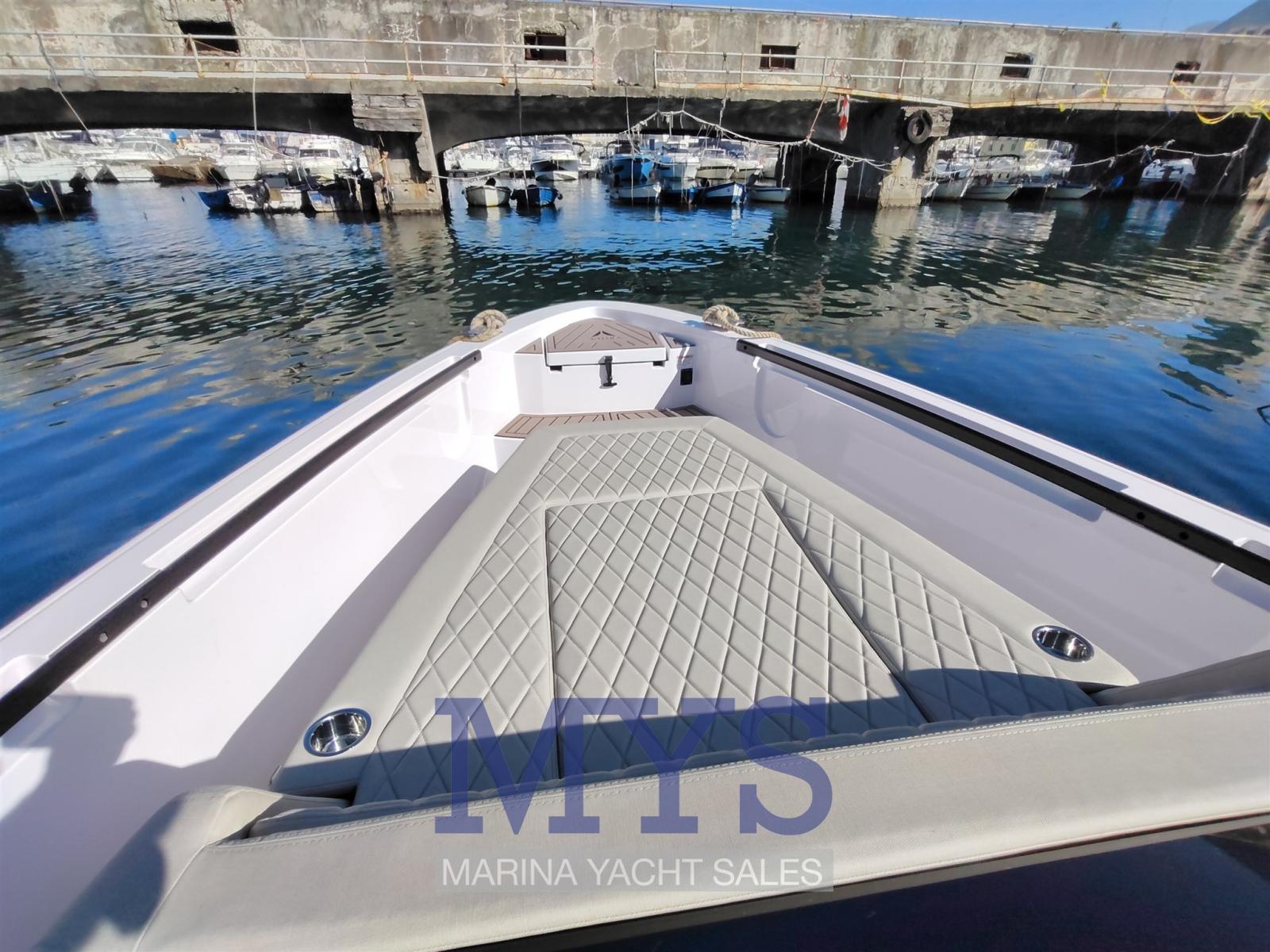Engine Alarm, Bilge Alarm, Electric Engine Compartment Opening, Water pressure pump, Folding cleats, Teak Side Decks, Deck Shower, Hydraulic Flaps, Fire Extinguishing System, Washbasin in the cockpit, Courtesy Lights, Entry door, Teak Cockpit, Shorepower connector, Electric Windlass, cockpit table, Living Room Foldable Table (esterno), guard rails with gates, T-Top.