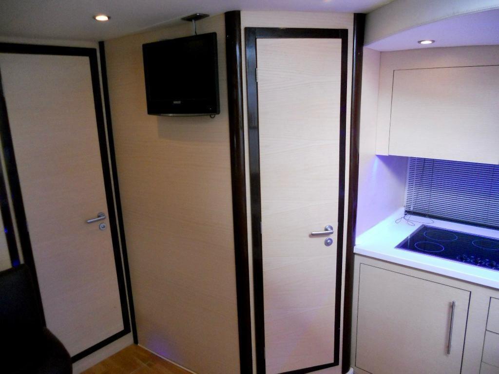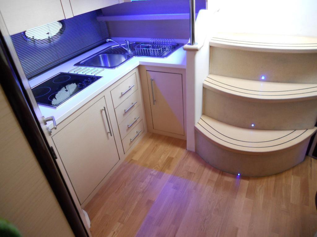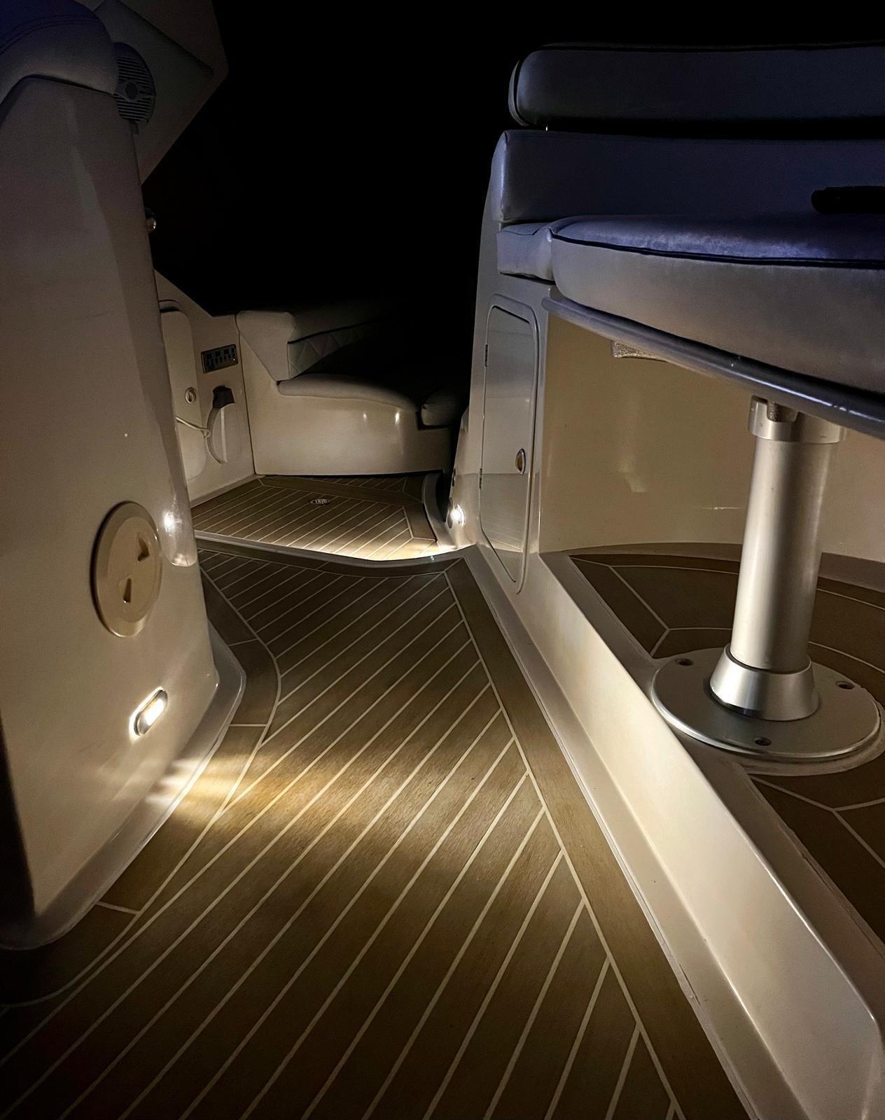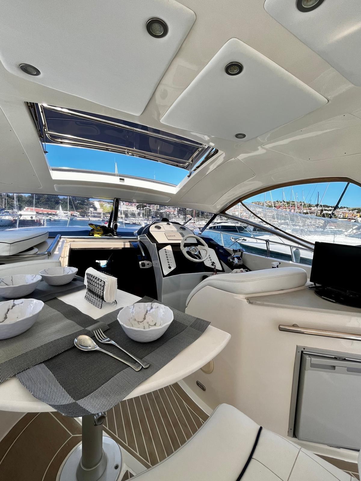 Various motor sensors; Installation of 4 new 180A batteries. Two for services, right engine and left engine. New turbines both engines; Right engine landed; Replacement of the right foot steering fork; Right transom burst and overhauled; Right engine tear protection joint; left and right motor silent blocks; Painting both engines; Complete bilge painting; Water tank landing and overhaul; Renovation of the water tank cover floor; replacement of bilge pumps; Complete renovation of the electrical system, batteries, chargers and distribution lines; 220 stainless steel socket; Replacement of the 220 cable from socket to internal panel; Air conditioning condenser overhaul; Installation of brass seawater filter for air conditioning; Dismantling of all overhaul and sealing portholes, Sealing of all stanchions; Replacement and calibration of diesel floats; Dedicated battery installation for 180A bow thruster; Installation of 75 A battery charger. Total two chargers, one 45 A and one 75A; engine servicing; Cutting full feet (headphones, gear cables, cardan bearing); Replacement of both foot trim piping; Generator service; Complete polishing.